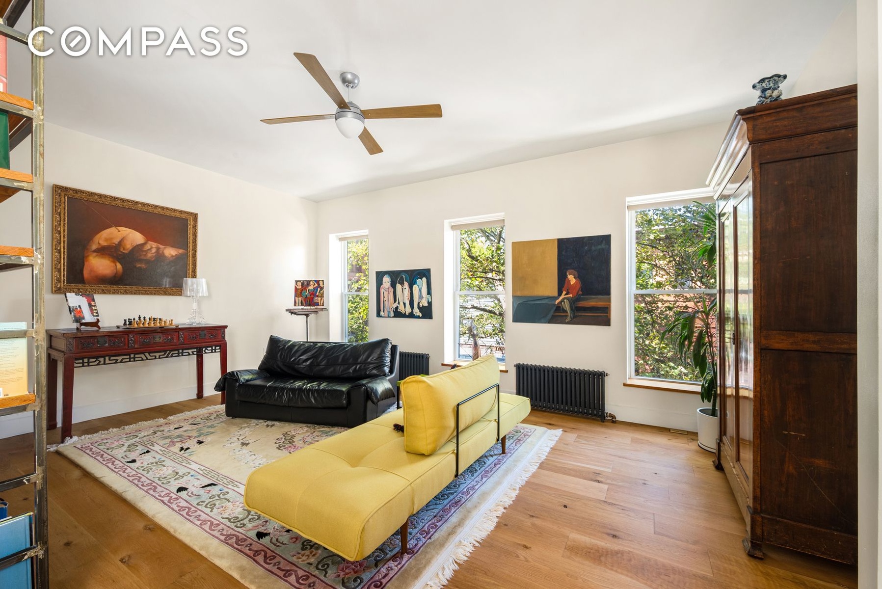 Step into the upper triplex through a welcoming foyer leading to the parlor floor, where you'll find an expansive open-plan living area. The chef's kitchen is a focal point, equipped for culinary enthusiasts, and is complemented by a convenient powder room and a spacious pantry. This home is adorned with striking industrial details, including elegant iron railings on the staircase, exposed beams, and unique epoxy resin flooring. These elements harmoniously blend with the soaring high ceilings, creating an open and inviting atmosphere perfect for both relaxation and entertainment.