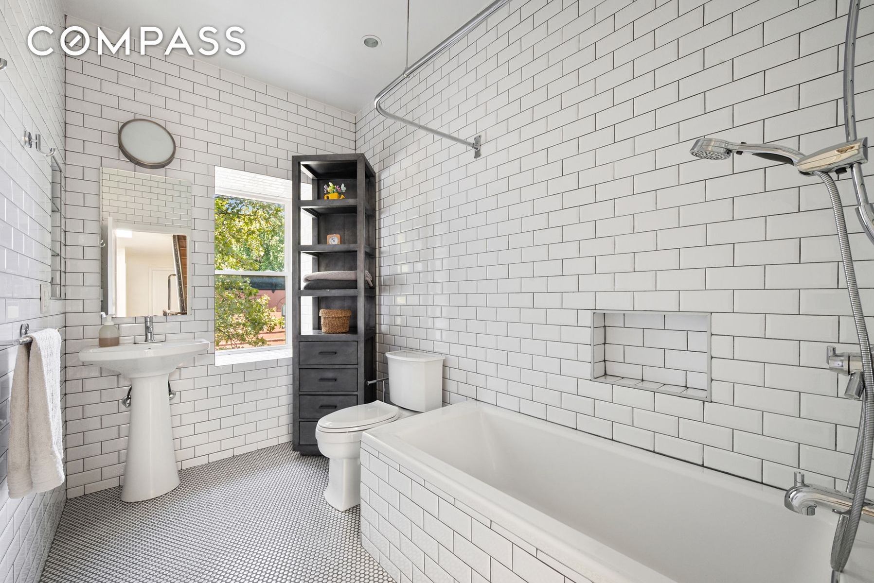 The third floor brilliantly illuminated by natural light cascading through a stunning skylight is where you will find two remaining bedrooms, each featuring a generous walk-in closet for your convenience. This floor also includes a serene office space, ideal for work or study. Indulge in the beautifully renovated bathroom with classic subway tiles and a luxurious soaking tub. Additionally, a convenient laundry room equipped with a sink adds to the functionality of this home.