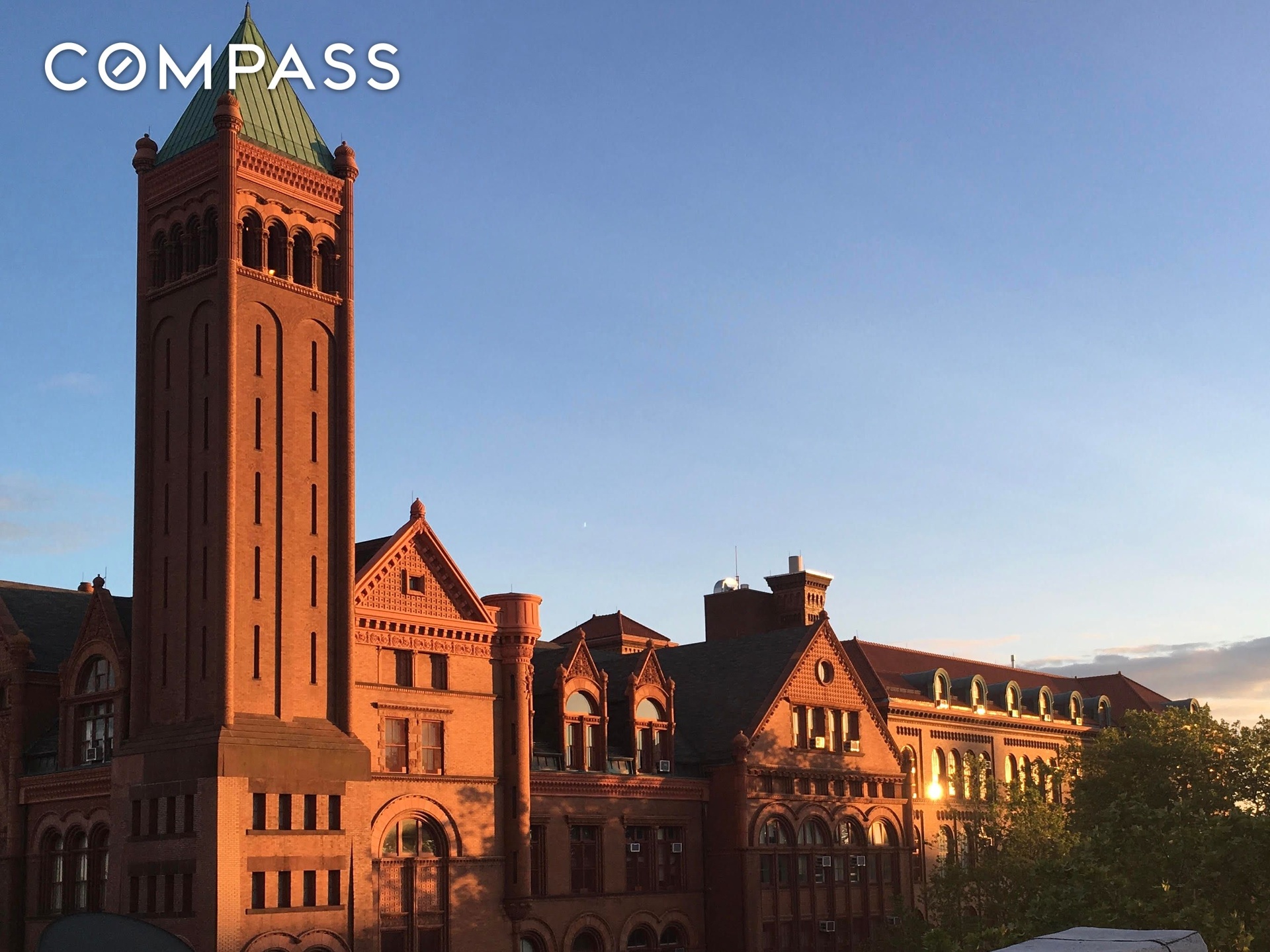Accessible by a staircase is a private roof deck. You will be captivated by breathtaking views of the iconic NYC skyline and the magnificent architecture of the Brooklyn Academy High School. It is perfect for unwinding with a book and a cup of coffee above the bustling city.