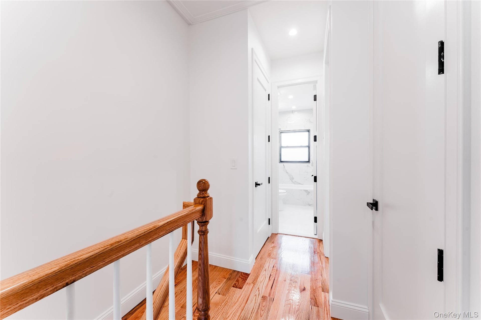 - Hallway with light wood-style flooring, an upstairs landing, and recessed lighting