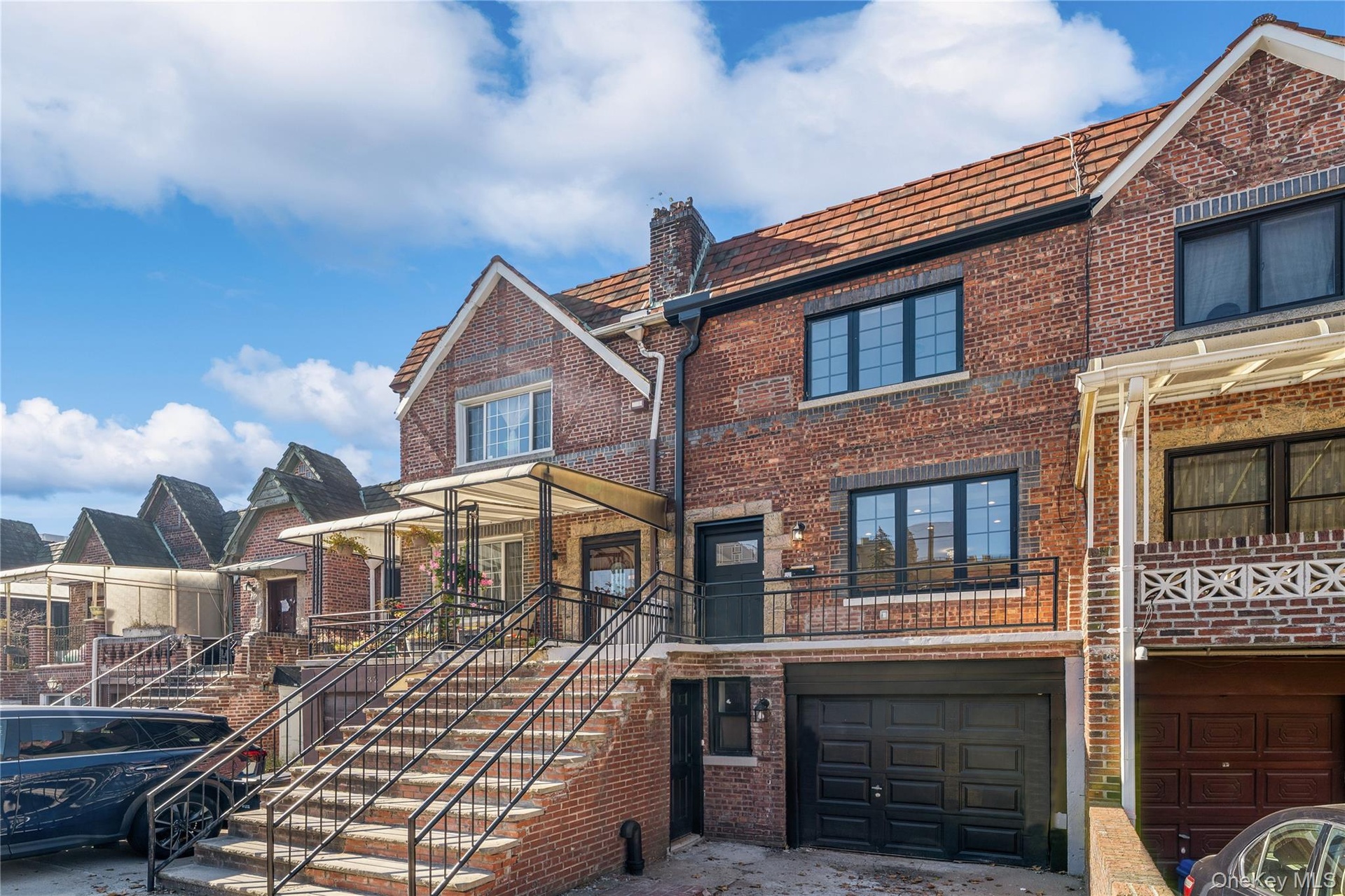 - View of front of house with brick siding, a garage, stairway, and a residential view