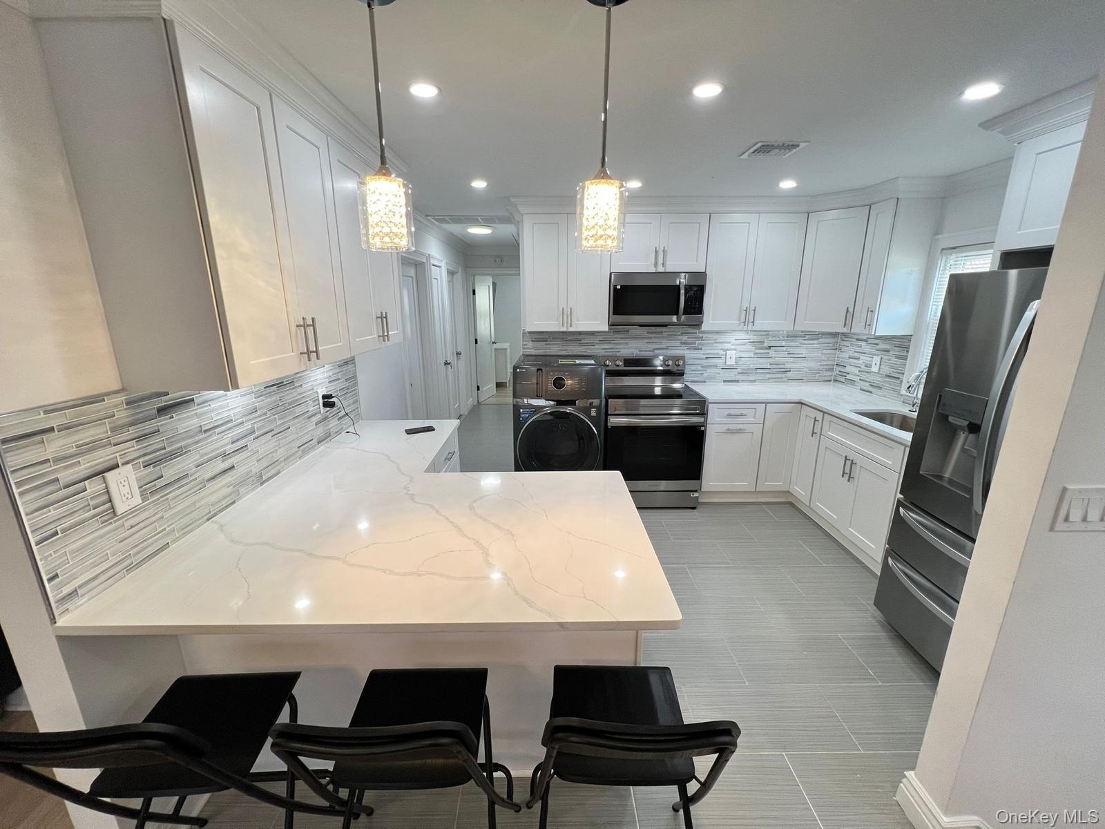 - Kitchen with tasteful backsplash, stainless steel appliances, light stone countertops, a peninsula, and washer / clothes dryer