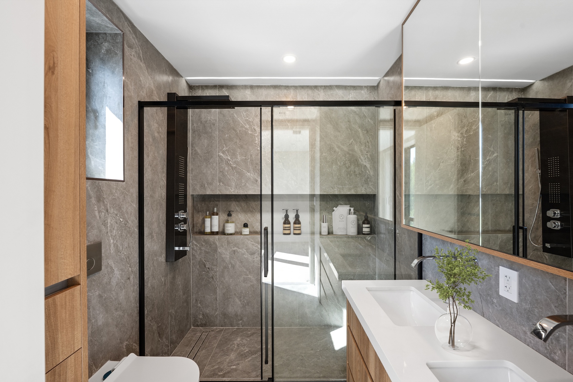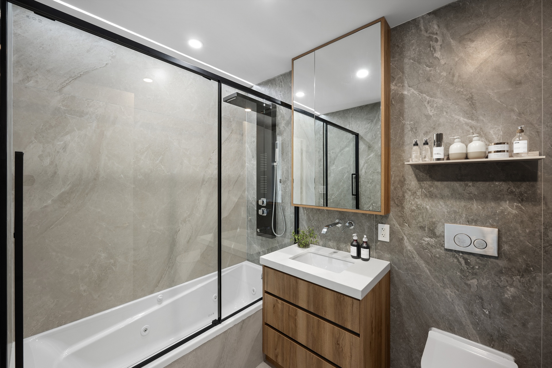 Both bathrooms are spa-inspired sanctuaries, fully clad in sleek tile and outfitted with premium fixtures. The primary en-suite bath offers an indulgent jetted jacuzzi tub, creating a tranquil escape from the bustle of city life.