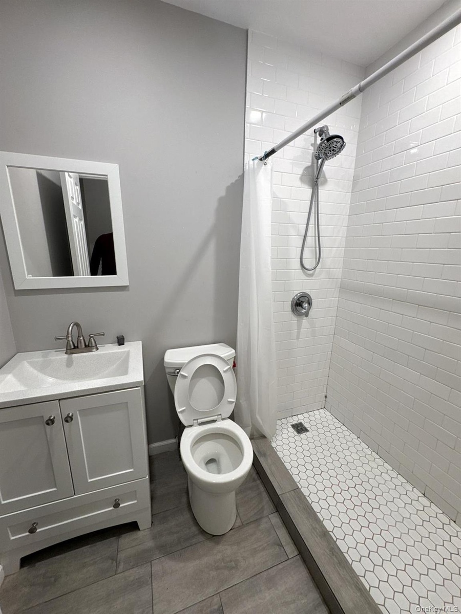 - Bathroom with a shower stall and vanity