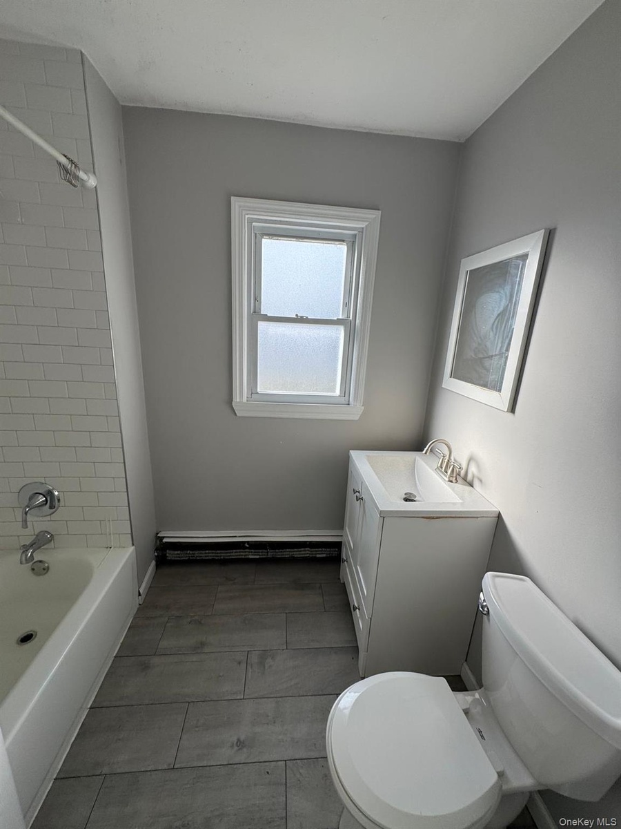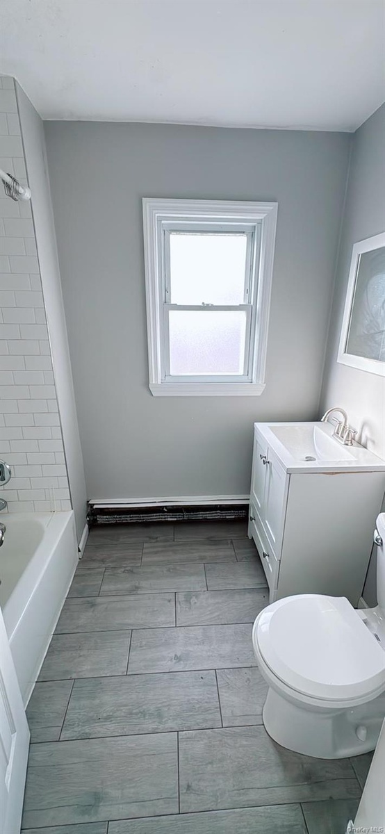 - Bathroom featuring tub / shower combination, vanity, and a baseboard heating unit