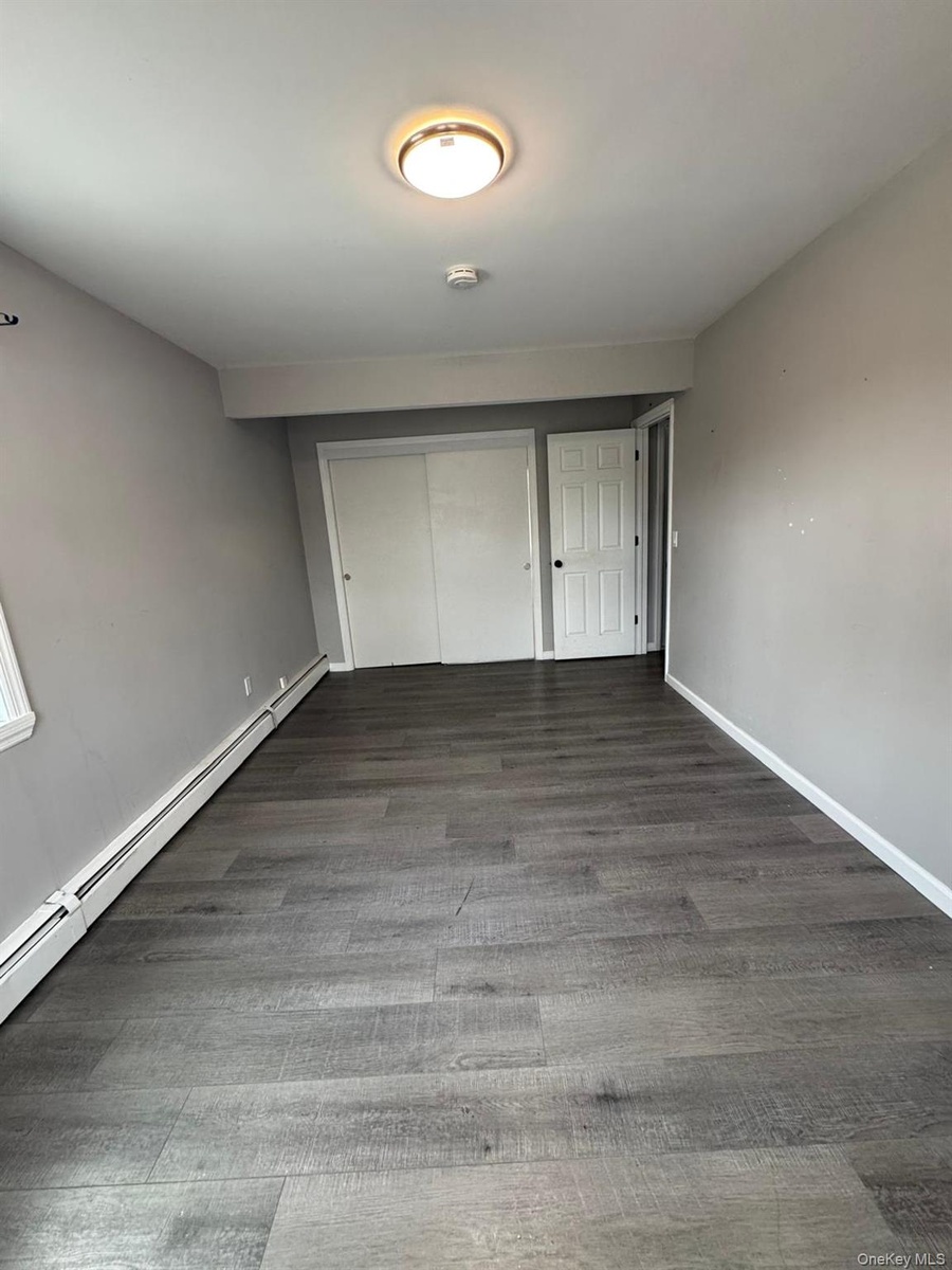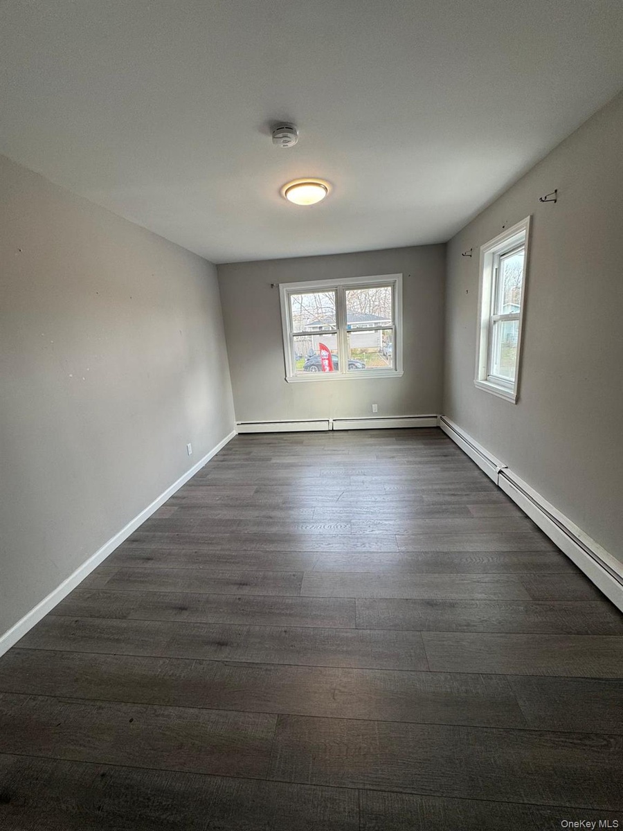 - Empty room featuring a baseboard heating unit and dark wood-type flooring