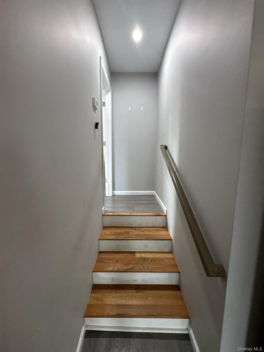 - Stairs featuring wood finished floors and baseboards