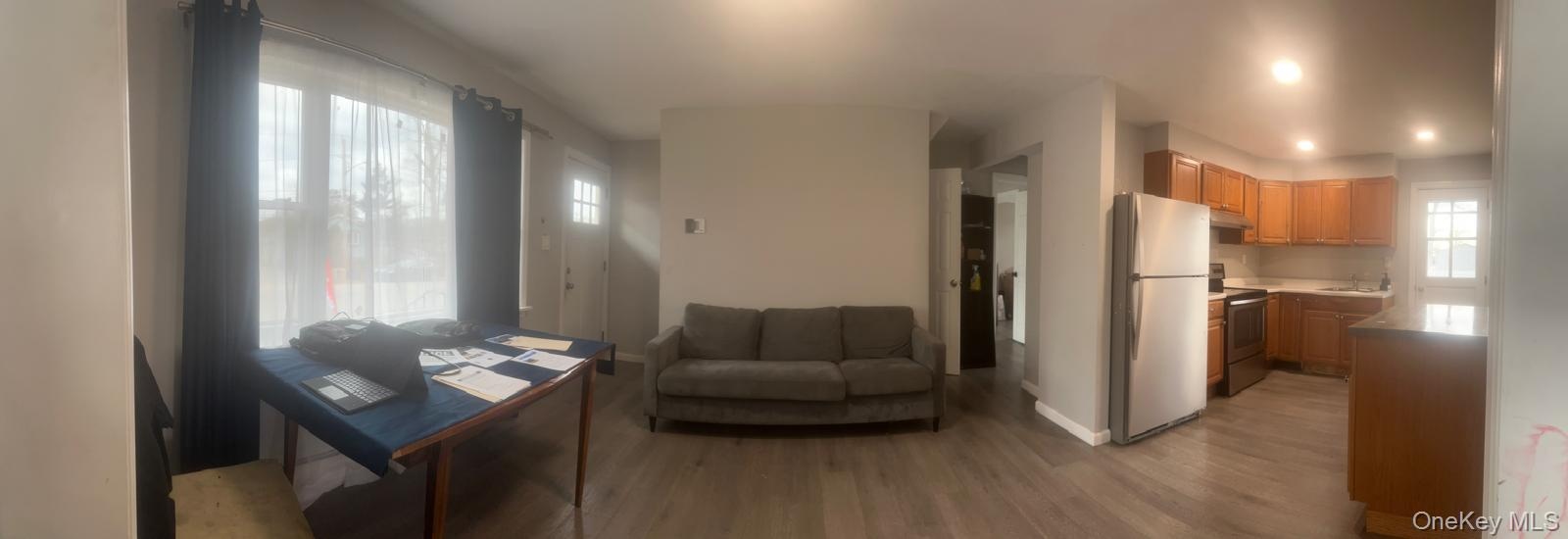 - Living area featuring wood finished floors and a baseboard heating unit
