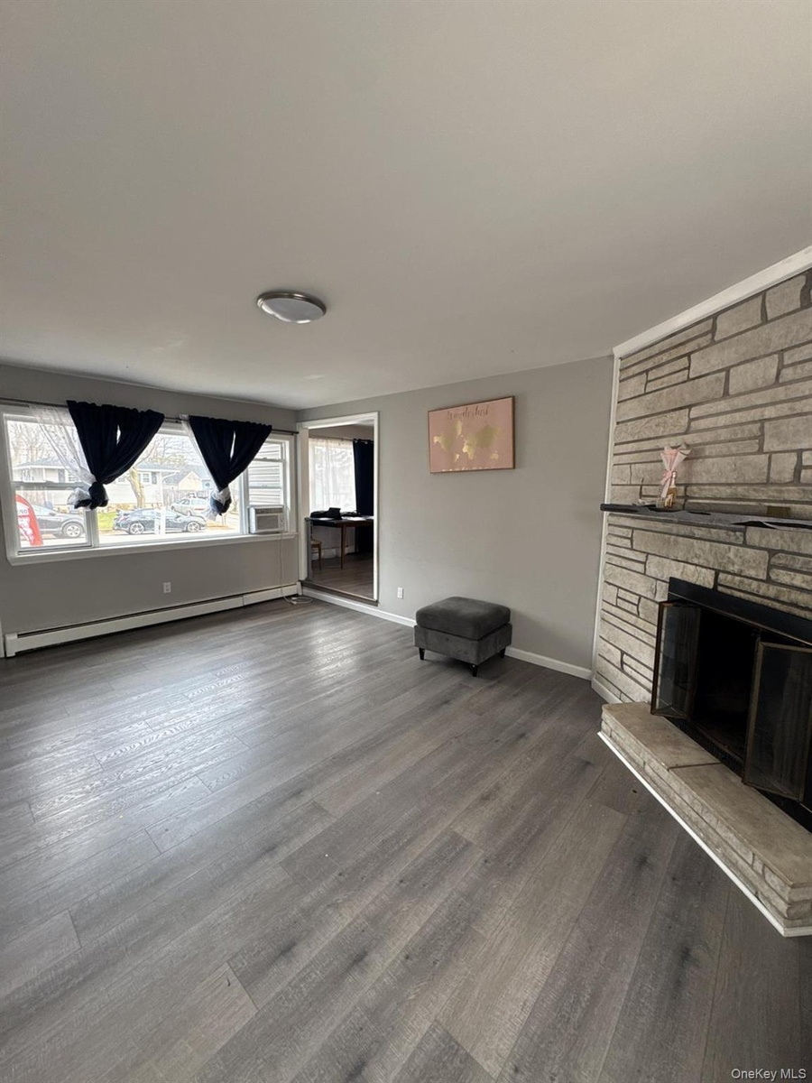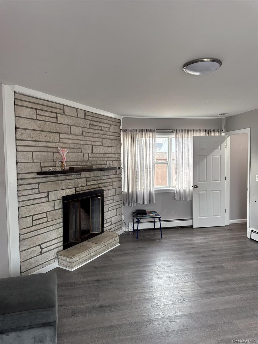 - Unfurnished living room with dark wood-style flooring, a stone fireplace, and a baseboard heating unit