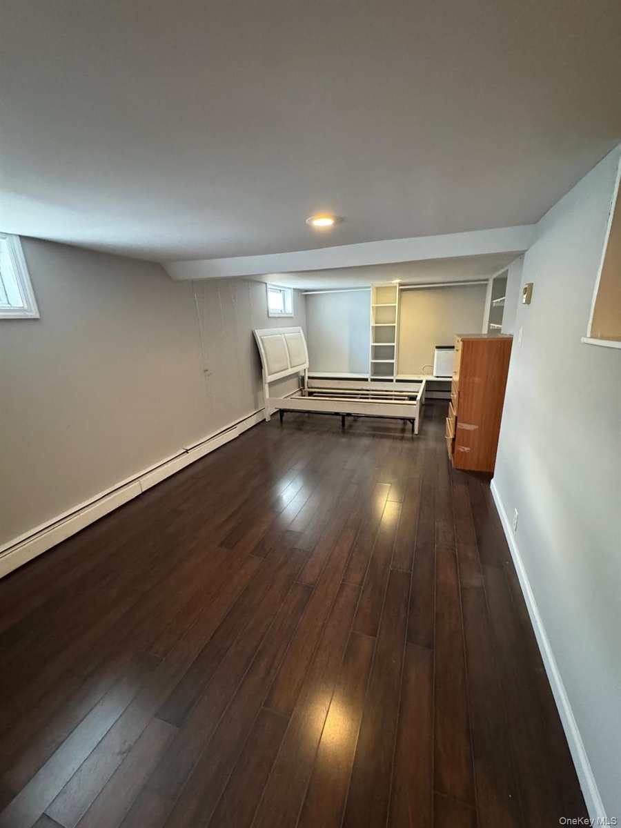 - Basement featuring a baseboard radiator and dark wood finished floors