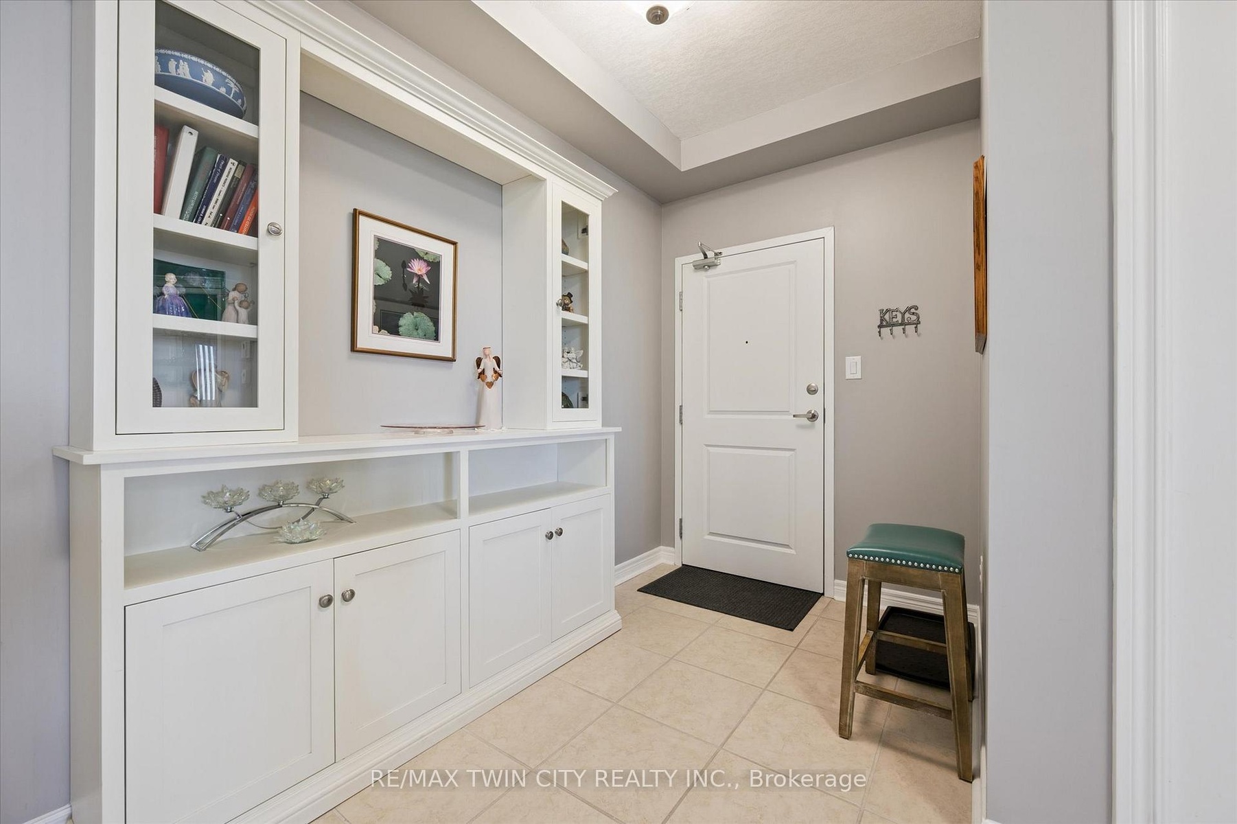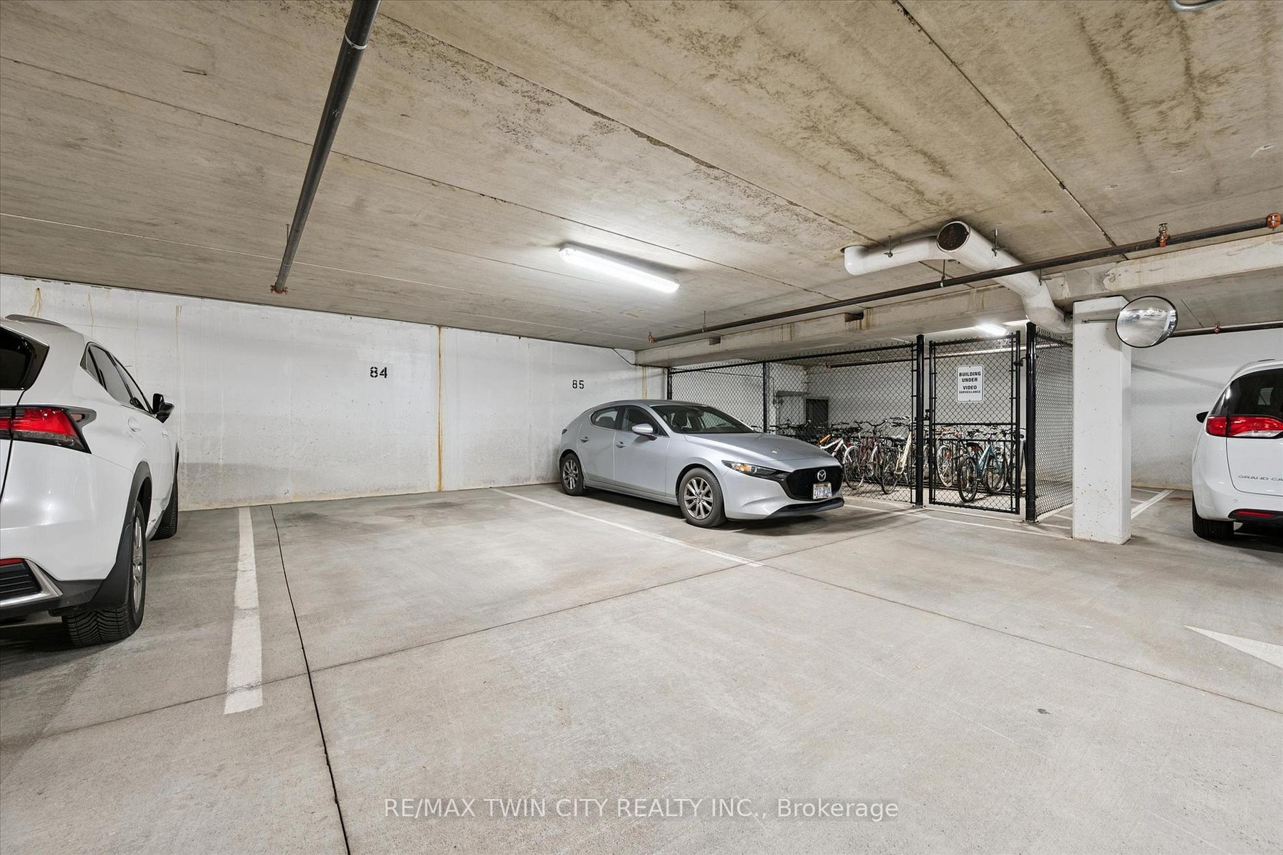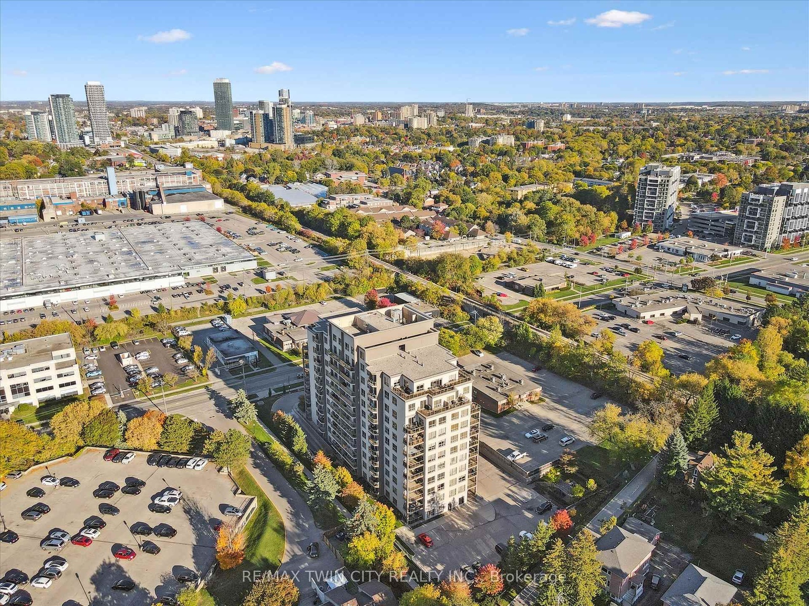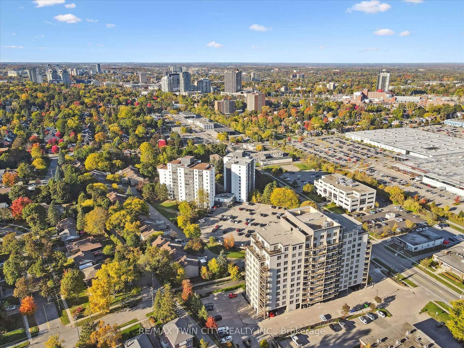 Located in Belmont Village Condominiums, this 8th floor unit offers care-free living in a beautiful, well-kept building. Step inside the unit and appreciate the built-in cabinetry and large coat closet. Spacious open-concept kitchen/dining room/living room layout with updated luxury wide-plank flooring in the main living room and both bedrooms. Ceramic tile in the foyer, laundry room, and both bathrooms. Freshly painted throughout, this unit shows so well and is truly move-in ready. The laundry room has a new stackable washer/dryer set (2024) plus room for a second fridge and extra storage space. The white kitchen has new stainless fridge, stove, and microwave, granite counters, an island with extra prep space and plenty of storage. This corner unit is bright with lots of natural light and 180 degree views of the city. The primary bedroom is large and has a walk-in closet and primary bathroom with double sinks and walk-in shower. One underground parking space that is close to the building entrance plus lots of visitor parking outside. Building amenities include: party room, media room, exercise room, games room, guest suite, community BBQ on the patio. Condo fees include heat, air conditioning, and water. Centrally located and walkable to all the shops and restaurants in Belmont Village, the Iron Horse Trail, and quick access to Uptown Waterloo and Downtown Kitchener.