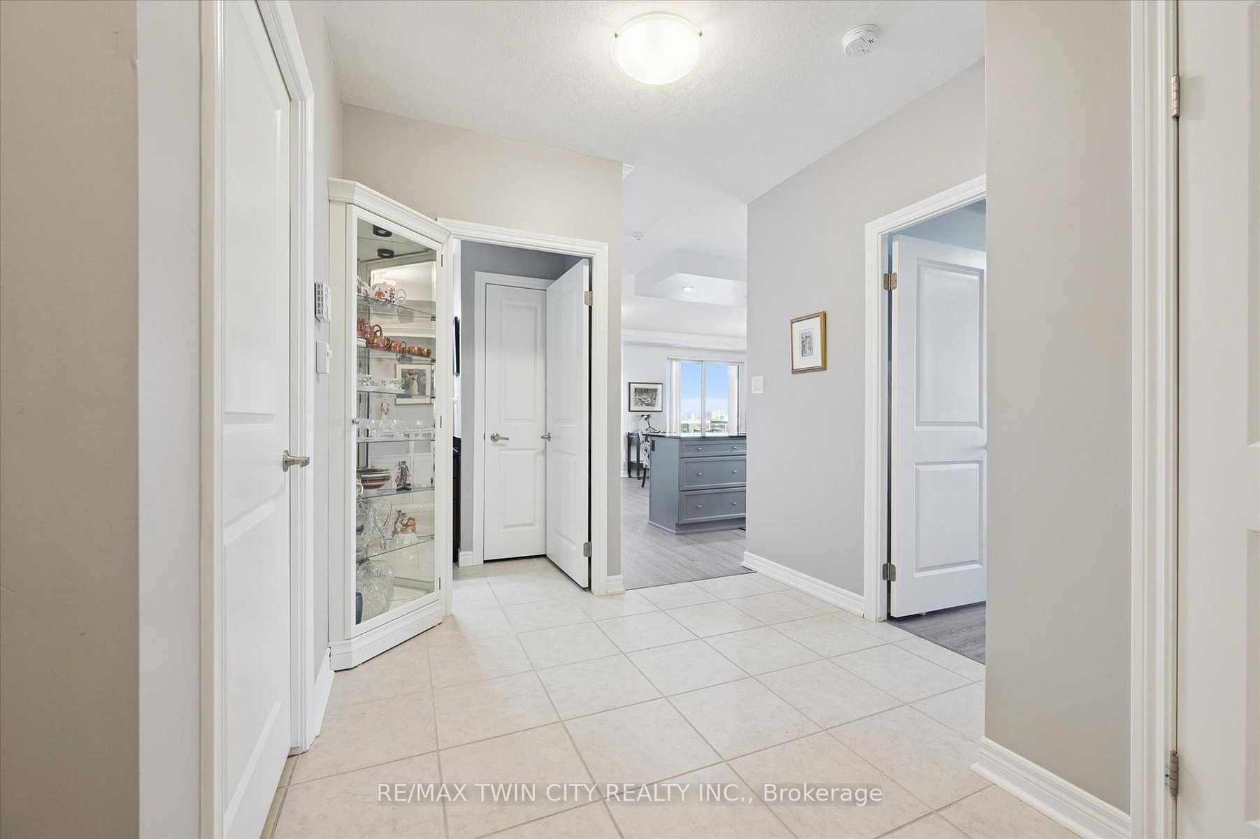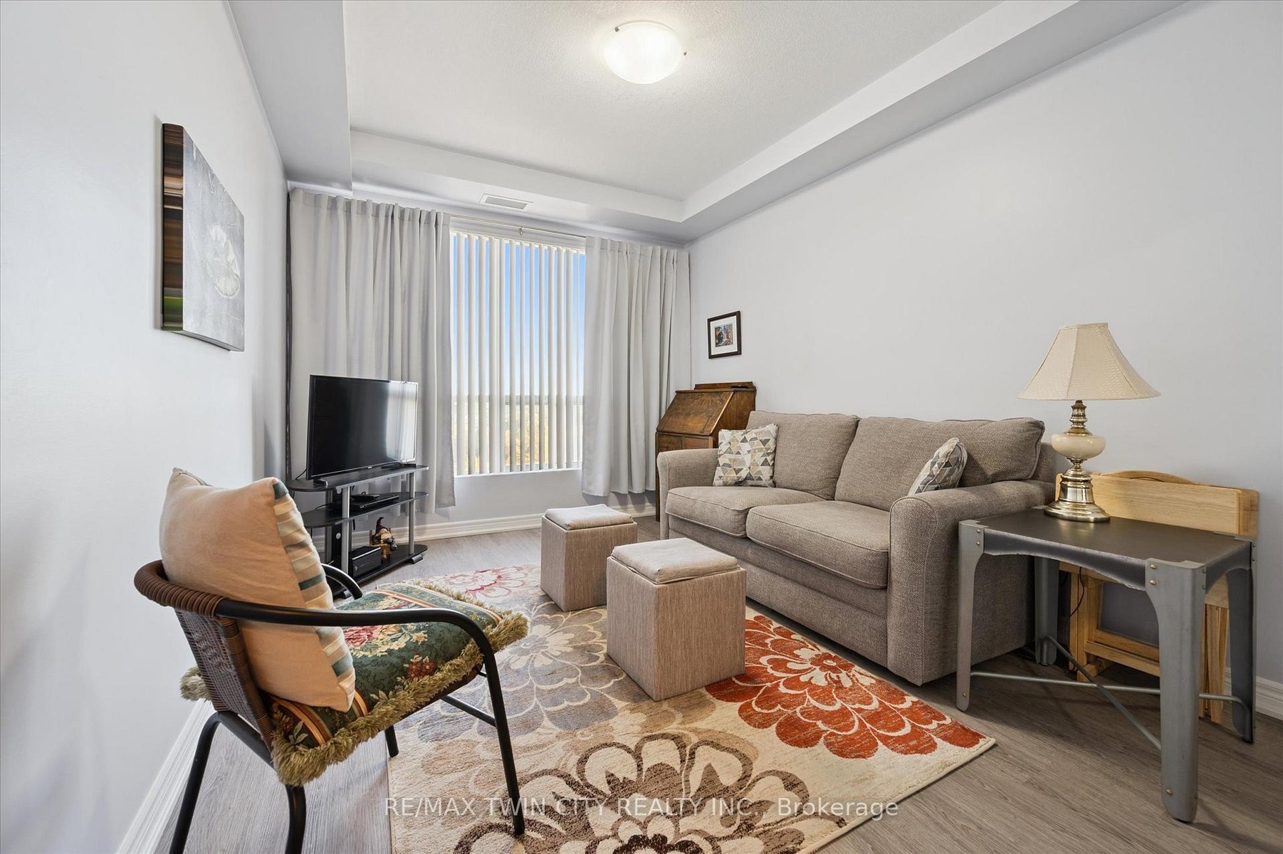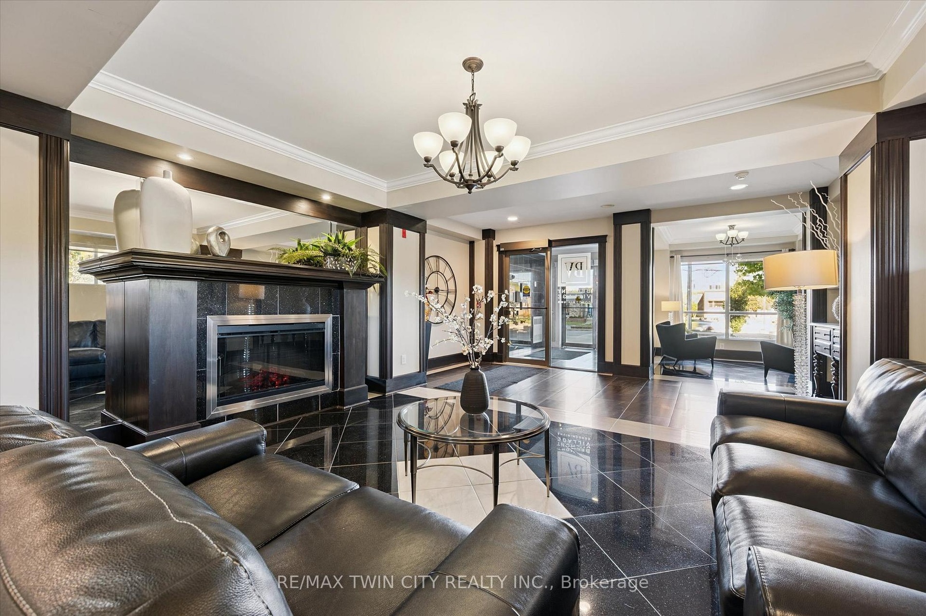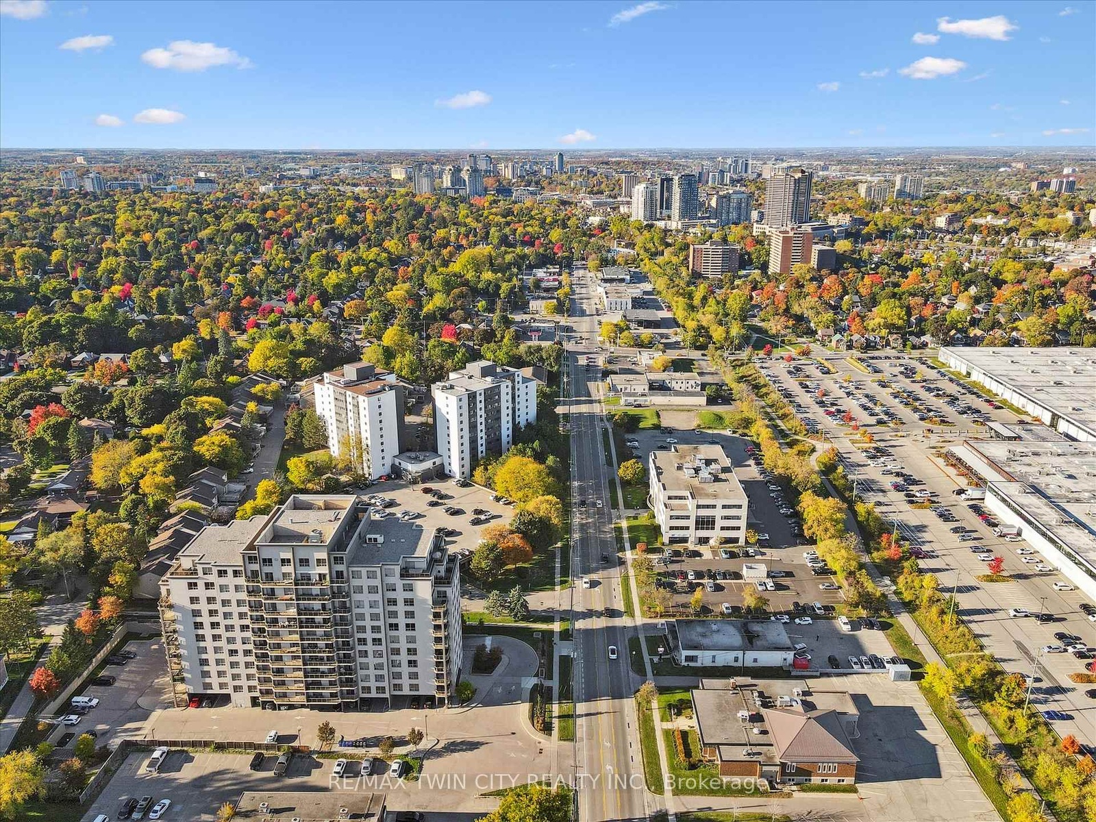 Located in Belmont Village Condominiums, this 8th floor unit offers care-free living in a beautiful, well-kept building. Step inside the unit and appreciate the built-in cabinetry and large coat closet. Spacious open-concept kitchen/dining room/living room layout with updated luxury wide-plank flooring in the main living room and both bedrooms. Ceramic tile in the foyer, laundry room, and both bathrooms. Freshly painted throughout, this unit shows so well and is truly move-in ready. The laundry room has a new stackable washer/dryer set (2024) plus room for a second fridge and extra storage space. The white kitchen has new stainless fridge, stove, and microwave, granite counters, an island with extra prep space and plenty of storage. This corner unit is bright with lots of natural light and 180 degree views of the city. The primary bedroom is large and has a walk-in closet and primary bathroom with double sinks and walk-in shower. One underground parking space that is close to the building entrance plus lots of visitor parking outside. Building amenities include: party room, media room, exercise room, games room, guest suite, community BBQ on the patio. Condo fees include heat, air conditioning, and water. Centrally located and walkable to all the shops and restaurants in Belmont Village, the Iron Horse Trail, and quick access to Uptown Waterloo and Downtown Kitchener.