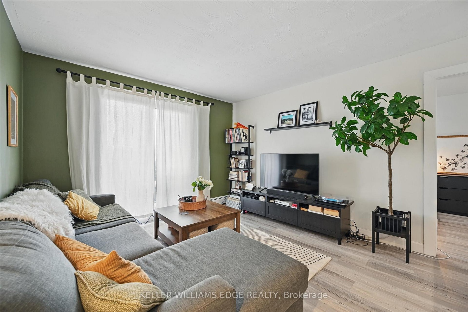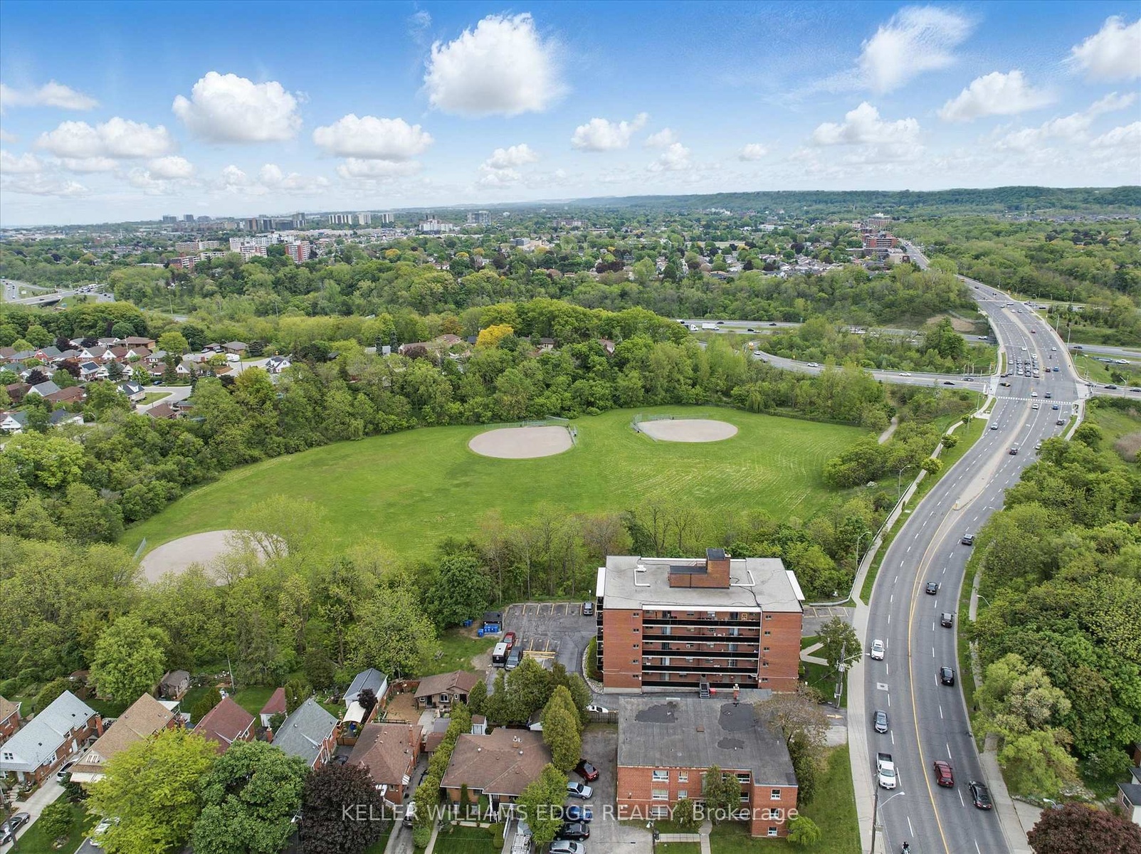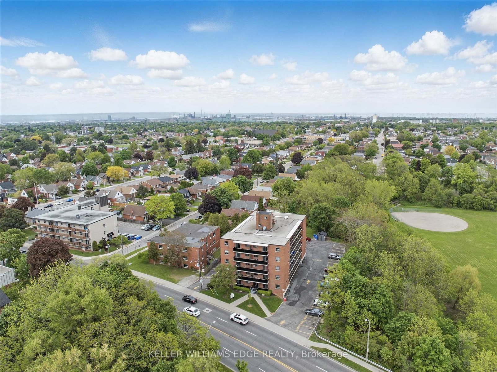 Welcome to this bright and stylish 1-bedroom, 1-bathroom condo offering 618 square feet of comfortable, well-designed living space on the 4th floor of a quiet and well-maintained building in East Hamilton. The updated kitchen features quartz countertops, a double undermount sink, and a convenient breakfast bar, all open to the spacious living area with walk-out to a private balcony -perfect for enjoying morning coffee or evening sunsets. The bedroom is generously sized, and the unit offers great natural light throughout. Additional highlights include secure building entry, elevator access, low monthly condo fees, a clean and well-kept on-site laundry room, one dedicated parking space, and a storage locker just around the corner from the unit. The building is surrounded by mature trees and green space, with plenty of visitor parking available. Located just minutes from the Red Hill Valley Parkway, the Lincoln Alexander Parkway, and the QEW, this location is ideal for commuters. You're also close to Red Hill Bowl Park and an entrance to the Red Hill Valley Trail, offering easy access to nature right outside your door. A fantastic opportunity for first-time buyers, downsizers, or anyone seeking move-in-ready, low-maintenance living in a connected and friendly neighbourhood.
