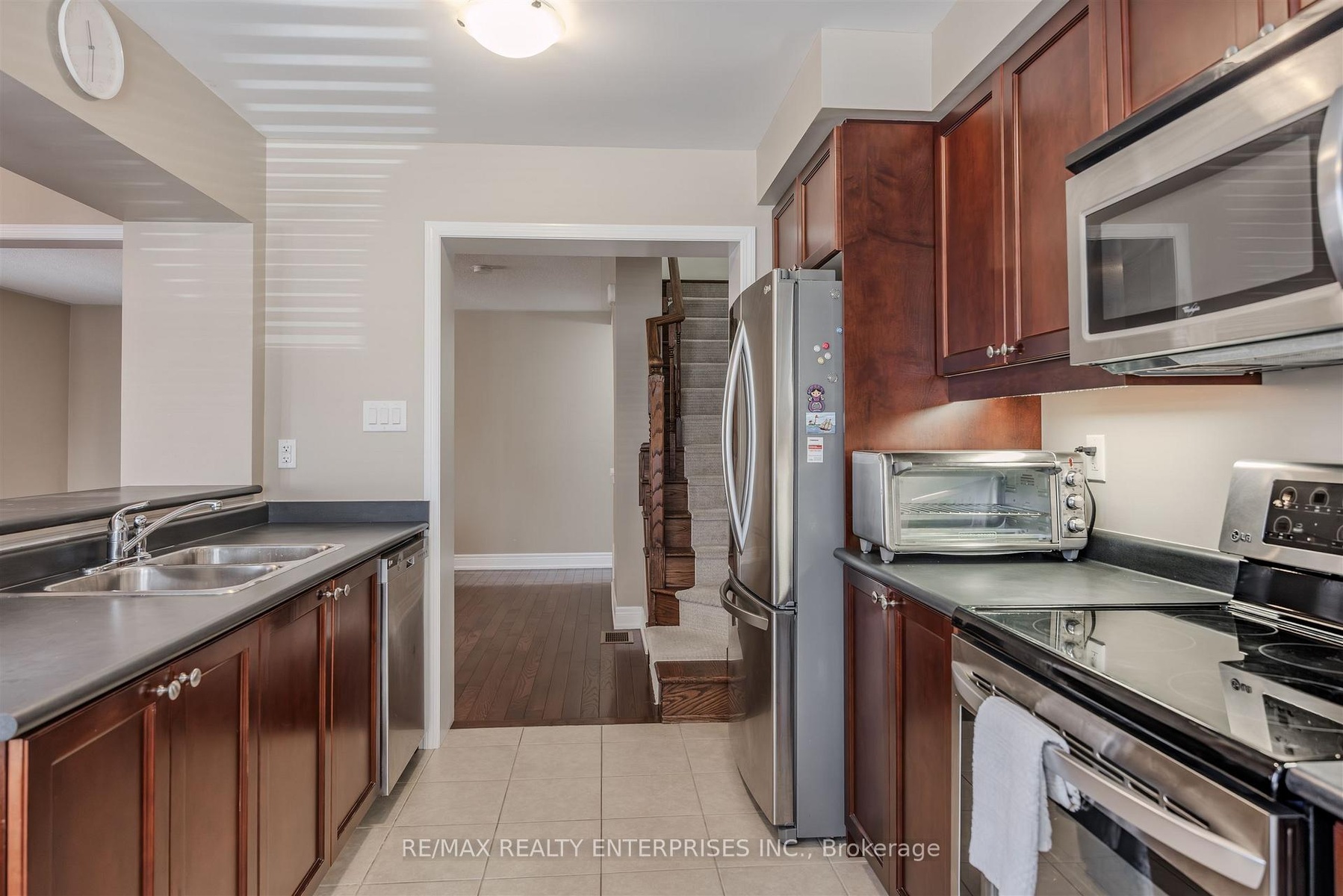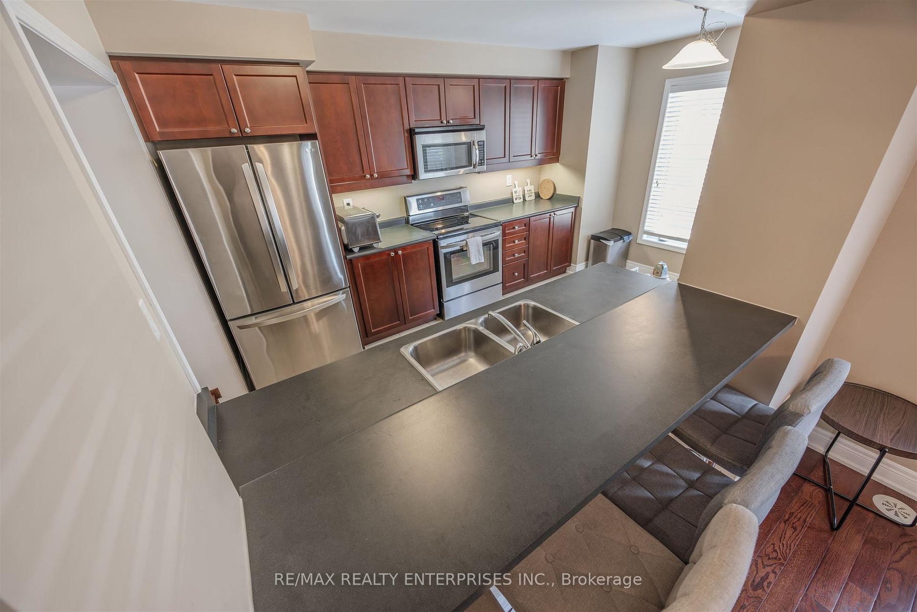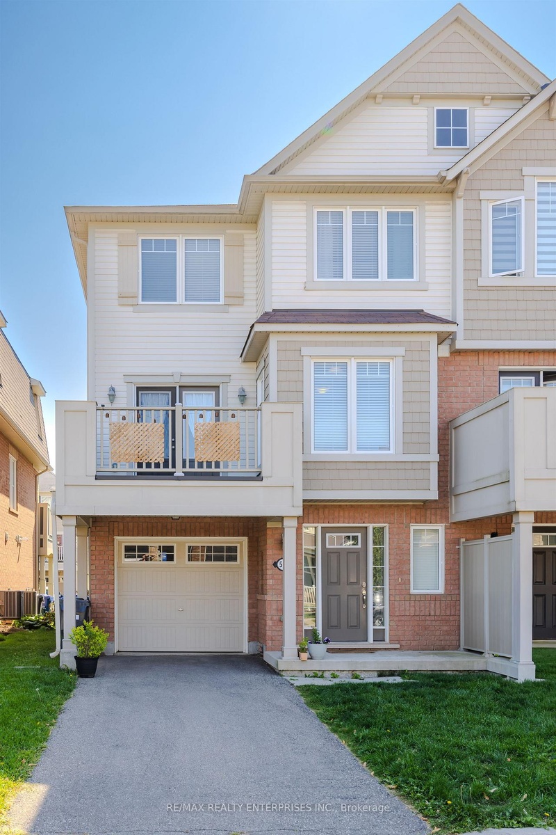 Welcome to this beautiful Mattamy-built, Energy Star-rated end unit townhouse offering nearly 1,300 sqft of stylish, low-maintenance living. Designed with comfort and functionality in mind, this bright home features oak staircases, hardwood flooring on the middle level, and a spacious open-concept layout perfect for both daily living and entertaining. The entry level includes a convenient covered front porch, a large foyer with a powder room, and a finished laundry room with a full-size washer and dryer. The middle level offers a bright and airy open-concept space with plenty of windows. The kitchen boasts stainless steel appliances, generous counter space, and a large window that fills the room with natural light, while the dining area opens to a walkout balcony ideal for morning coffee, evening relaxation, or barbecuing with friends and family. Upstairs, youll find three well-sized bedrooms, ample closet space, and a 4-piece bathroom. With no sidewalk, parking for three vehicles, and direct garage access, this move-in ready home is as practical as it is beautiful. Located directly across from a large park, the Milton Sports Centre, and Sports Complex, and just steps from grocery stores, schools, medical offices, banks, and the hospital everything you need is right at your doorstep well, almost at your doorstep!