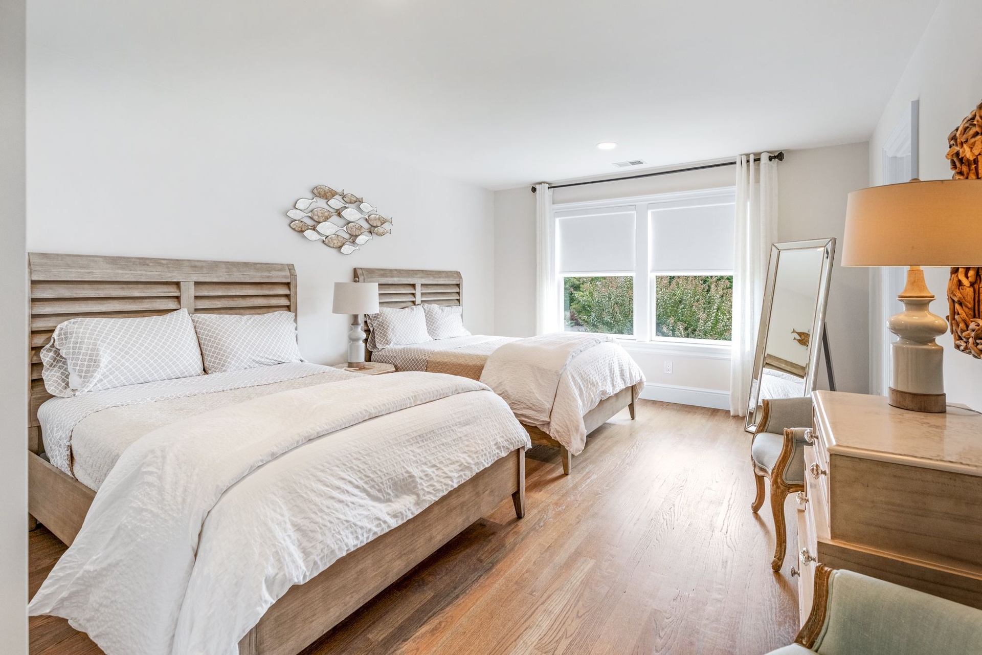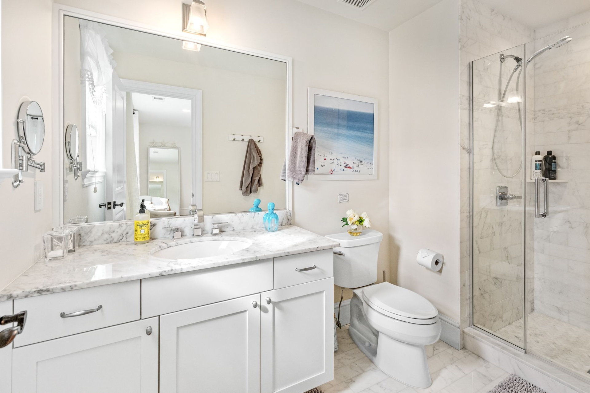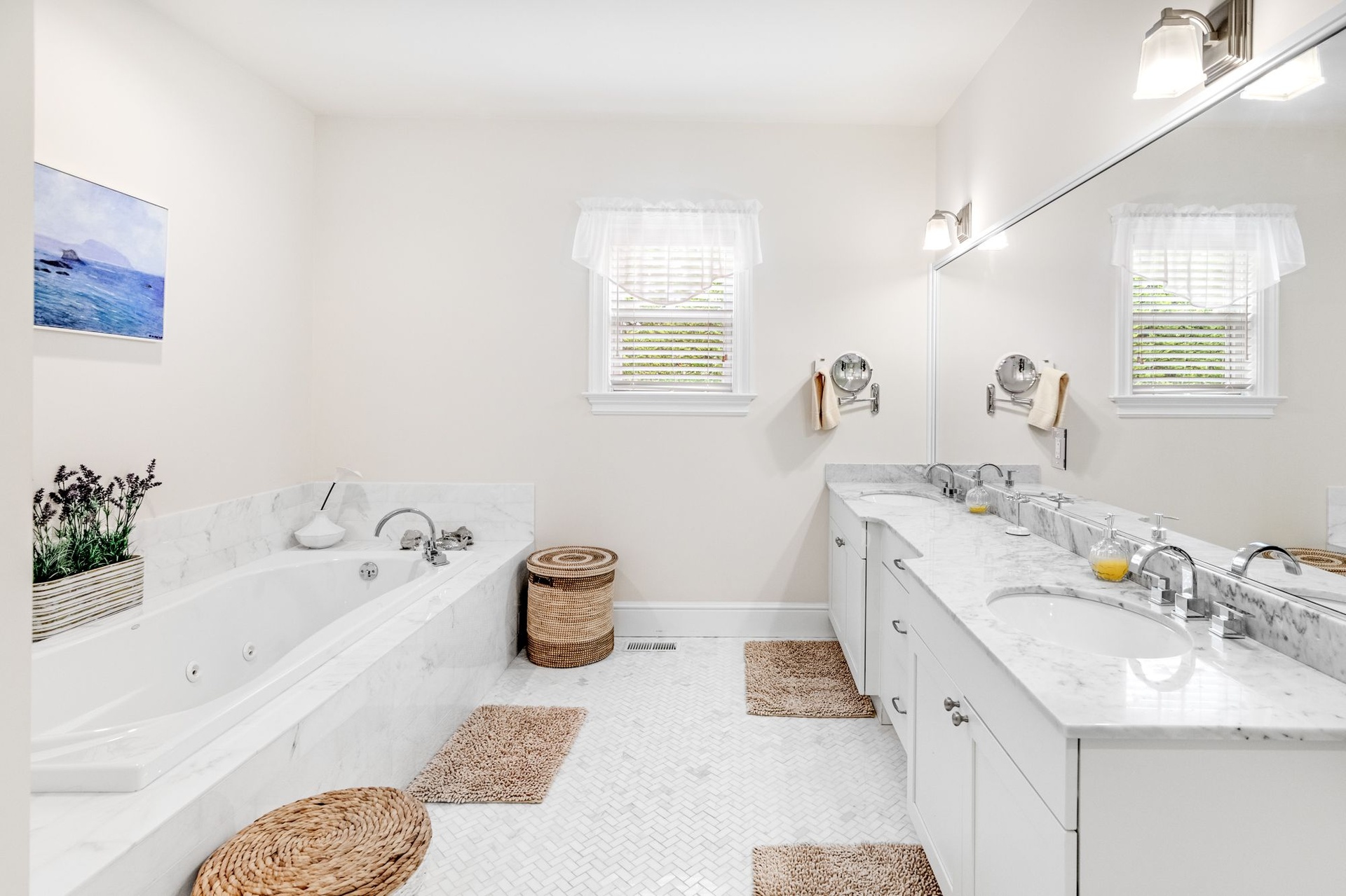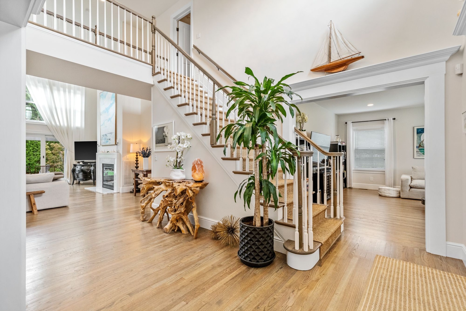 Enjoy cozy evenings in the spacious living room with a fireplace and flat-screen TV, or relax in the sun-filled great room, also featuring a large TV and elegant decor. The first-floor primary suite offers a spa-like retreat with an en-suite bath, while a second primary bedroom upstairs provides additional flexibility and privacy.