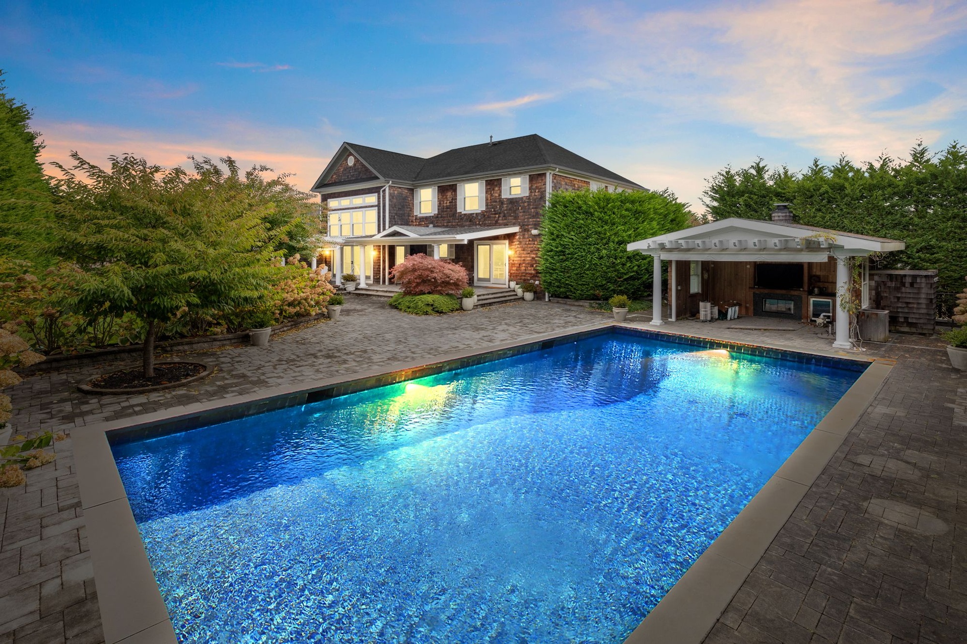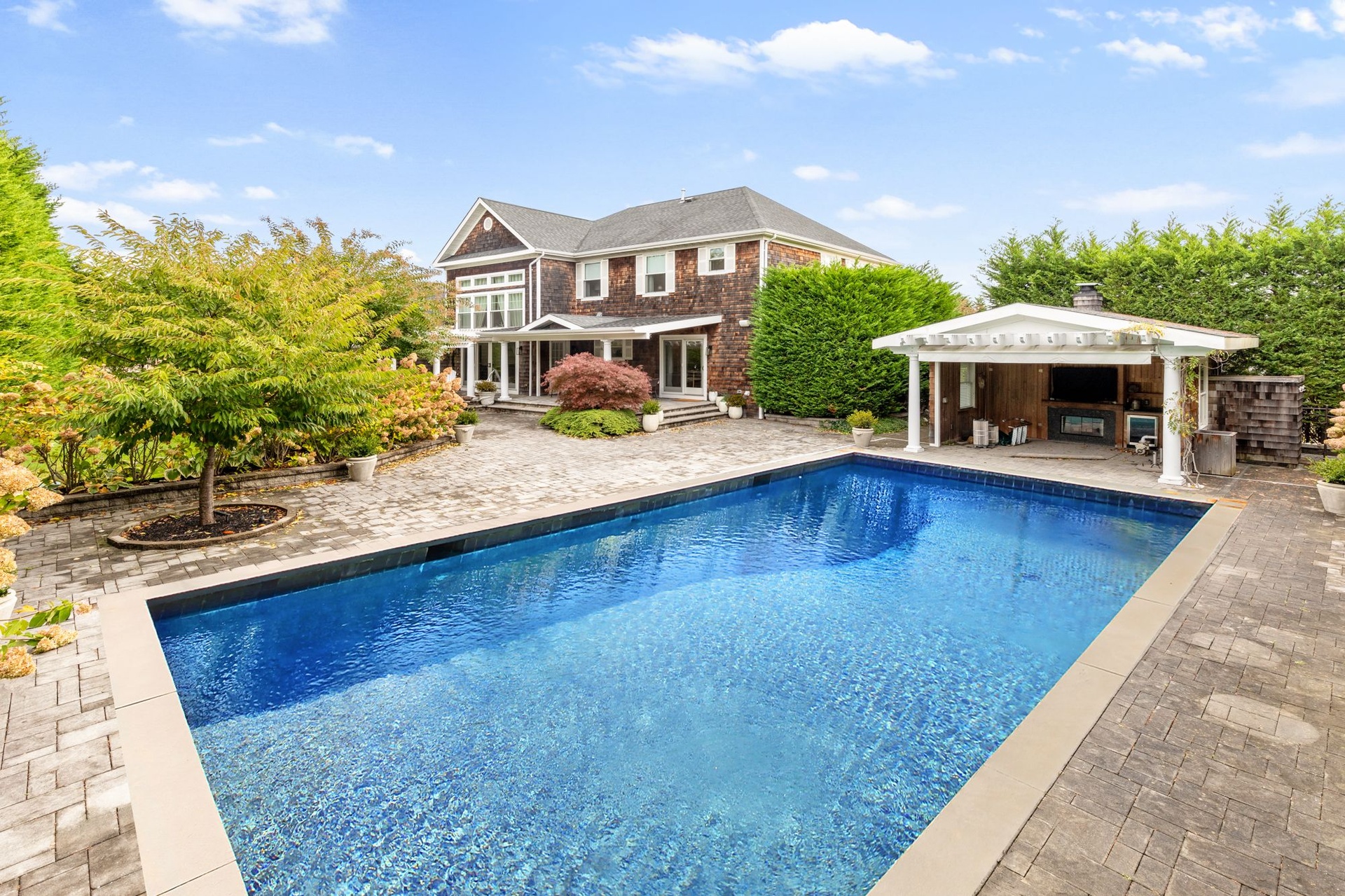 The finished lower level is a standout, complete with a state-of-the-art gym featuring a full suite of modern equipment and a full bath. Step outside to your own private oasis: a stunning heated gunite pool and spa, surrounded by lush landscaping, and a poolside pavilion with a wood-burning outdoor fireplace. Dine al fresco at the large outdoor table beside a professional-grade outdoor kitchen, ideal for gatherings of any size.