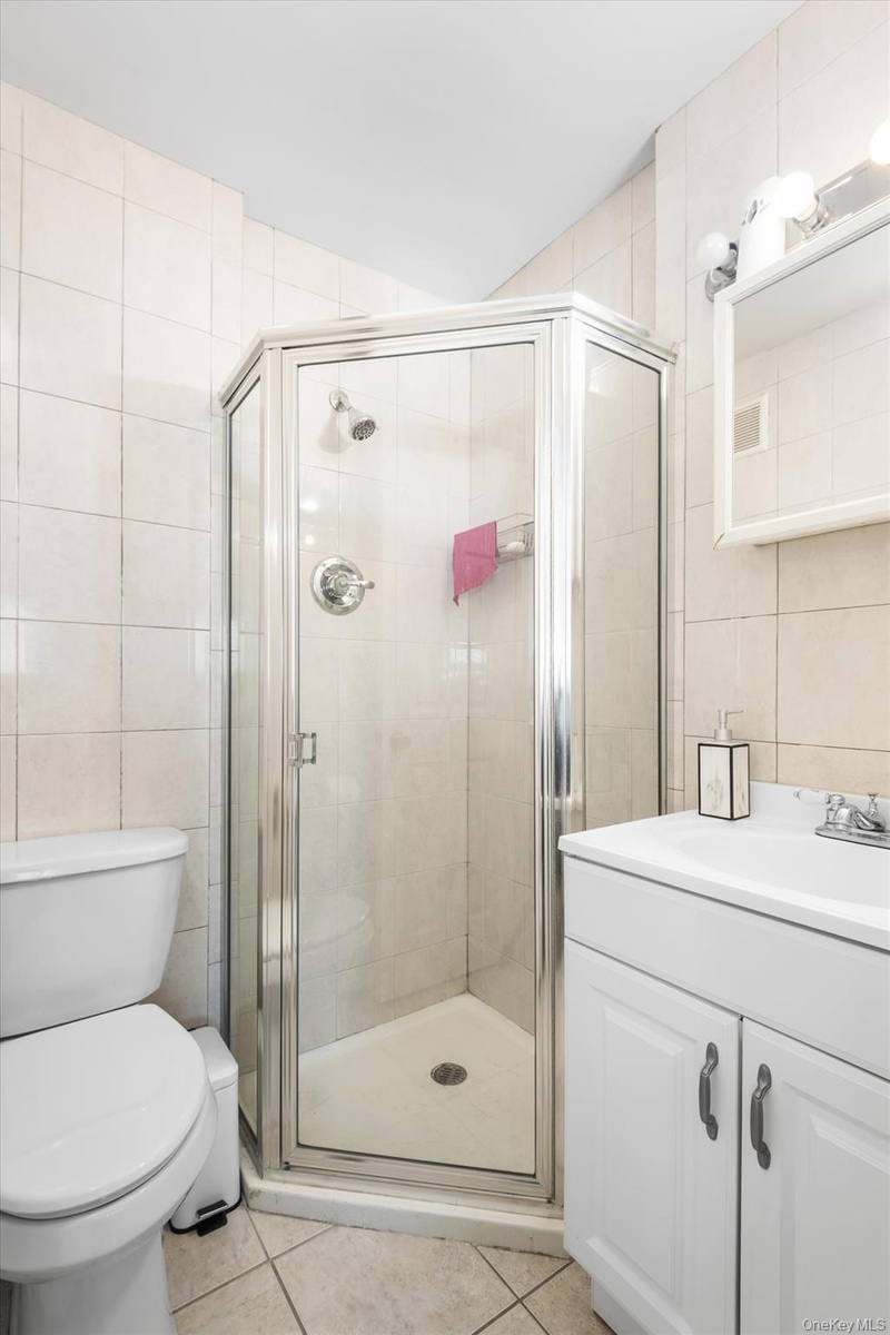 - Bathroom with tile walls, light tile patterned flooring, vanity, and a stall shower