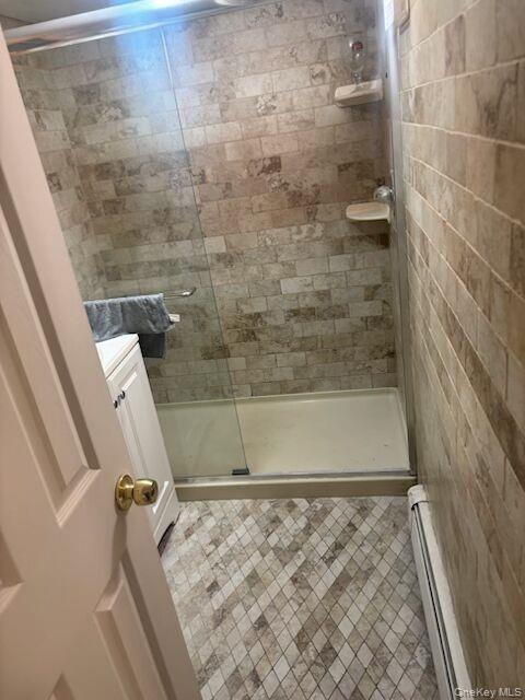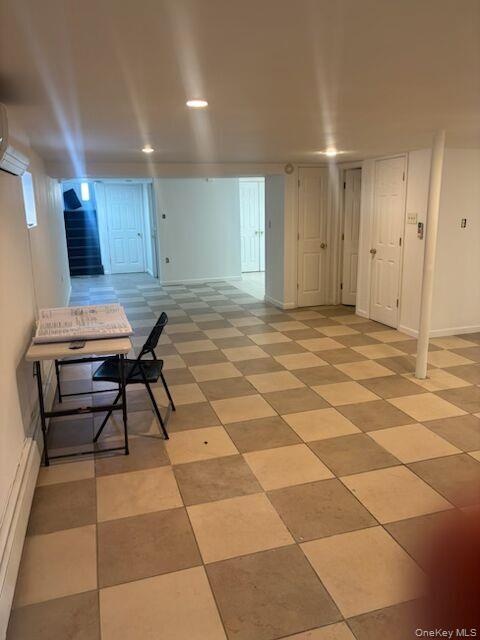 - Finished below grade area featuring a baseboard radiator, light tile patterned floors, and recessed lighting