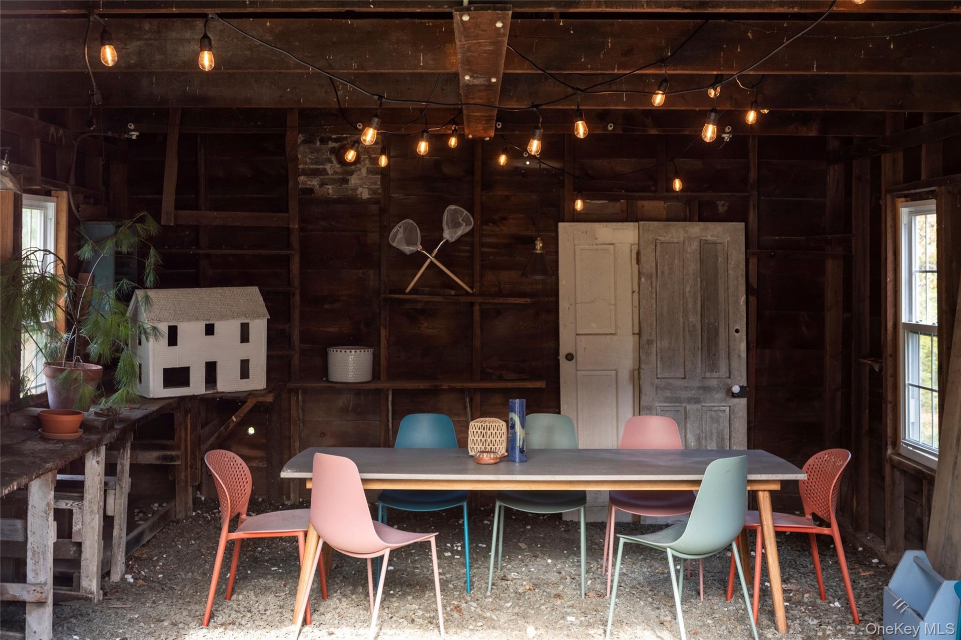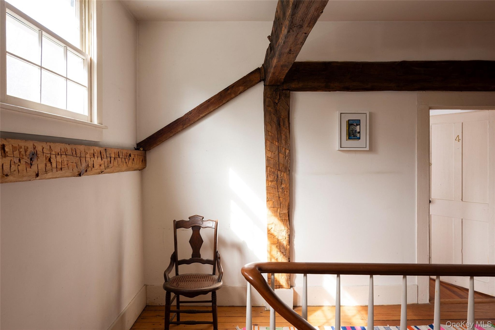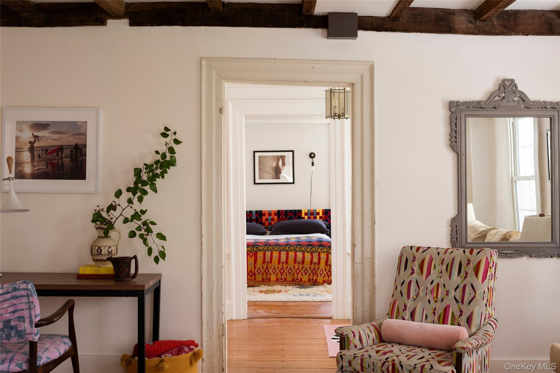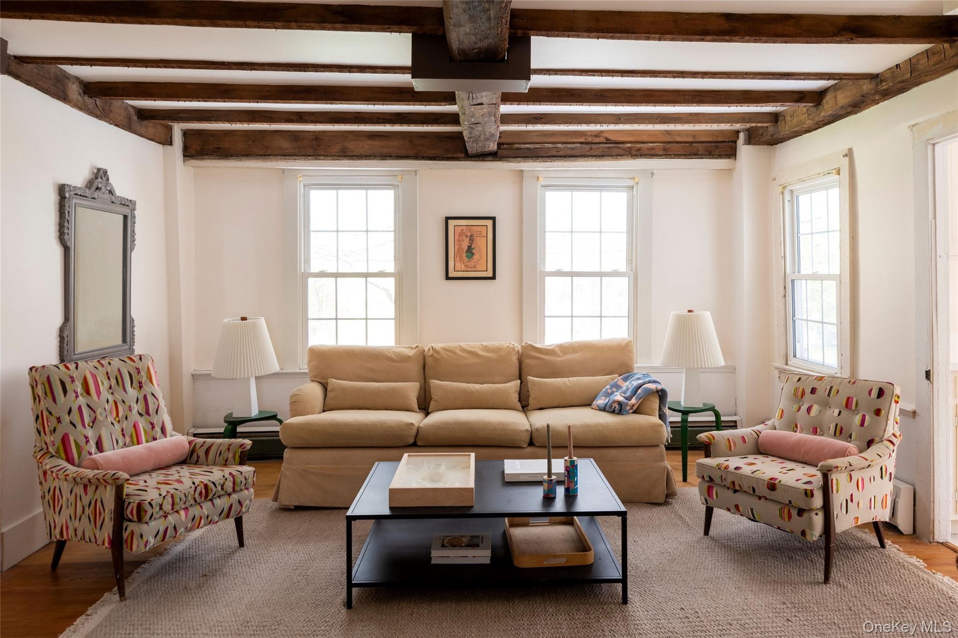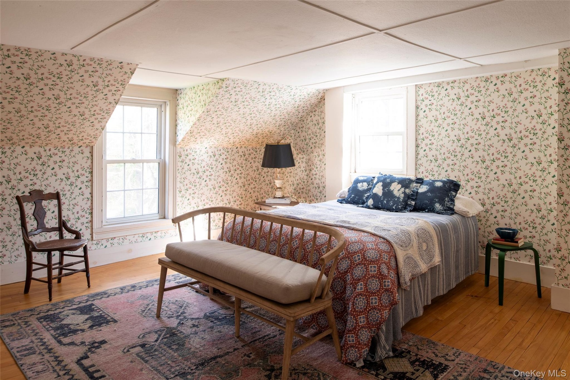 Whitings Pond Farmhouse is a c.1790 farmhouse set in the heart of Columbia County. Located by Queechy Lake, the home is situated on 75 acres of conserved land and exudes classic farmhouse charm. Arrive at a generous front porch that frames the home’s façade. Enter through a half-lite door into a center hall. Wide-plank wood floors run the length of the entry and lead to another half-lite door, allowing light to flood the space while connecting you to the outdoors. To the left, a gracious living room sits at the heart of the home. Exposed beams span the ceiling. The dining room lies adjacent and features vintage floral wallpaper. Both rooms lead to a country kitchen where beadboard cabinets and a corner cupboard add classic old-world charm. A door with arched glass panes leads to the front porch and contributes an air of elegance to the space. Beyond the kitchen, a modern addition incorporates a large four-season room flanked by windows that bathe the space in warm sunlight. A rec room, perfect for various pursuits — hello yoga / art studio! — features a full bath and laundry alcove. Returning to the center-hall, one finds a large ground-floor primary bedroom featuring a spacious walk-in closet and ensuite bathroom. Climb the lovely staircase to a generous second-floor landing where four bedrooms share two full bathrooms. Outside, a detached two-car garage includes additional space for a workshop. Not far, a classic red barn offers endless possibilities for gardeners, artists and entertainers. Paths beyond the garage and barn lead to one’s own private sanctuary of 75 wooded acres. A conservation easement with Columbia Land Conservancy ensures the continued protection and stewardship of this parcel for future generations. All of this — just a stone’s throw from Queechy Lake and minutes to Main Street Chatham and West Stockbridge — makes Whitings Pond Farmhouse an idyllic rural escape for all seasons.
