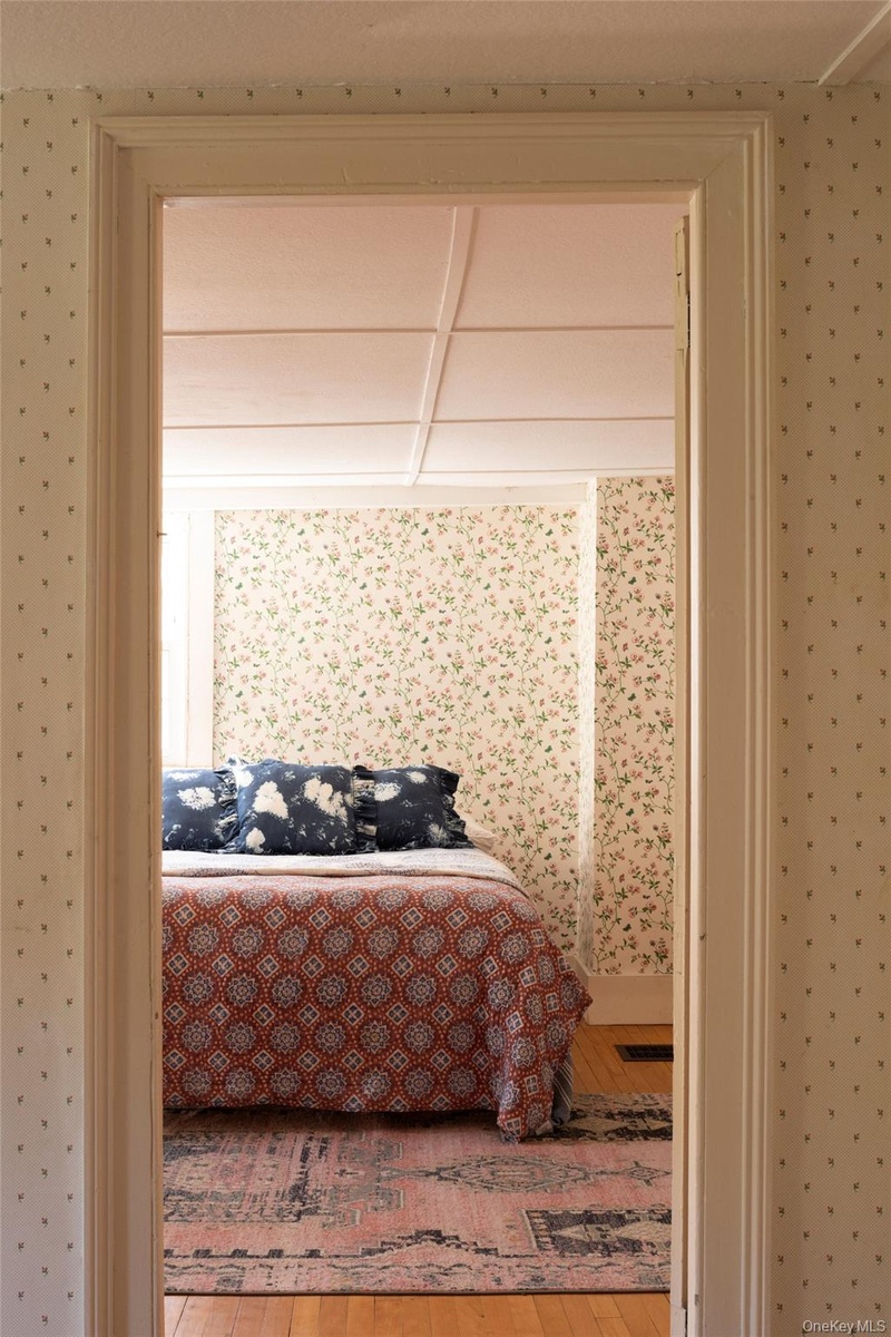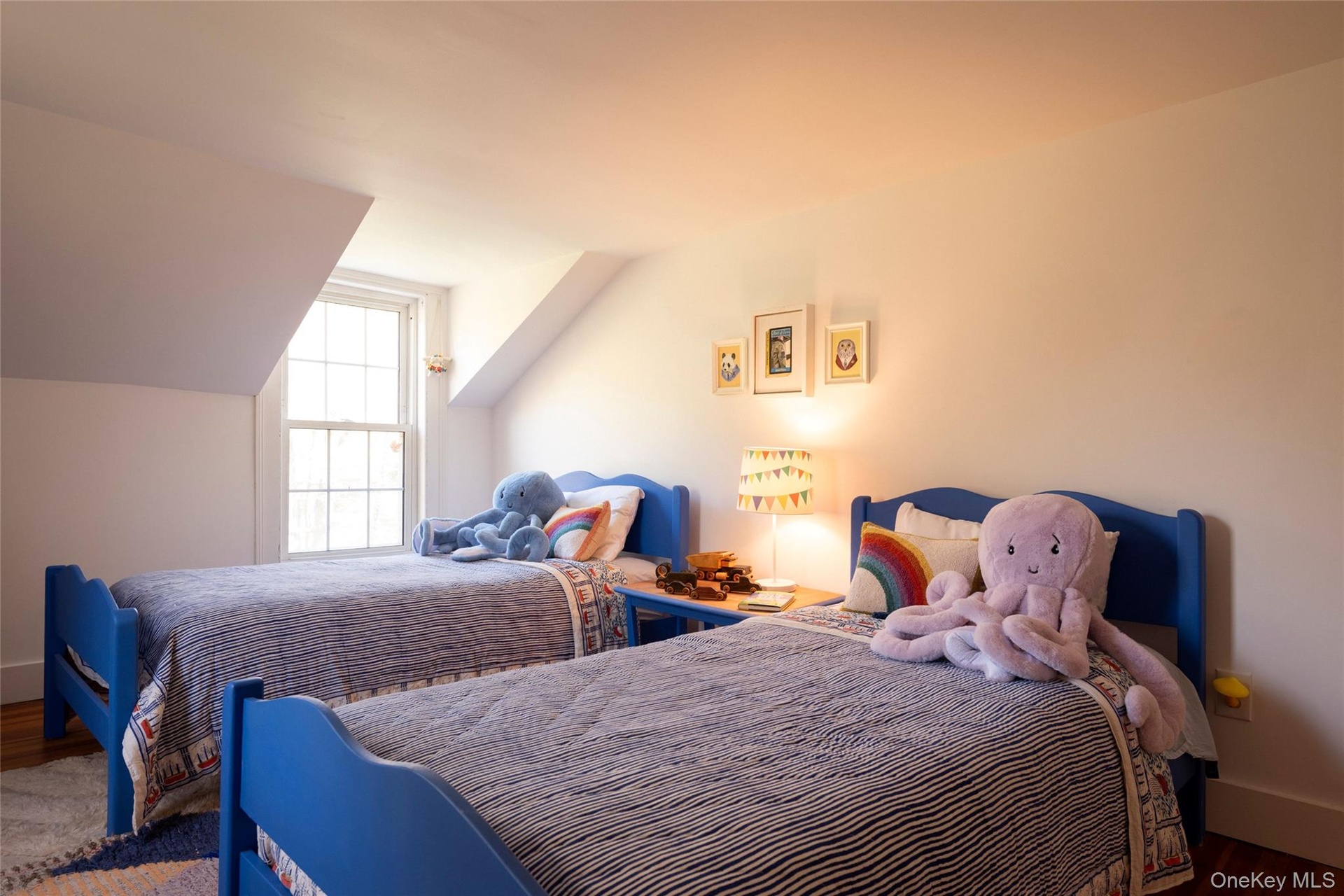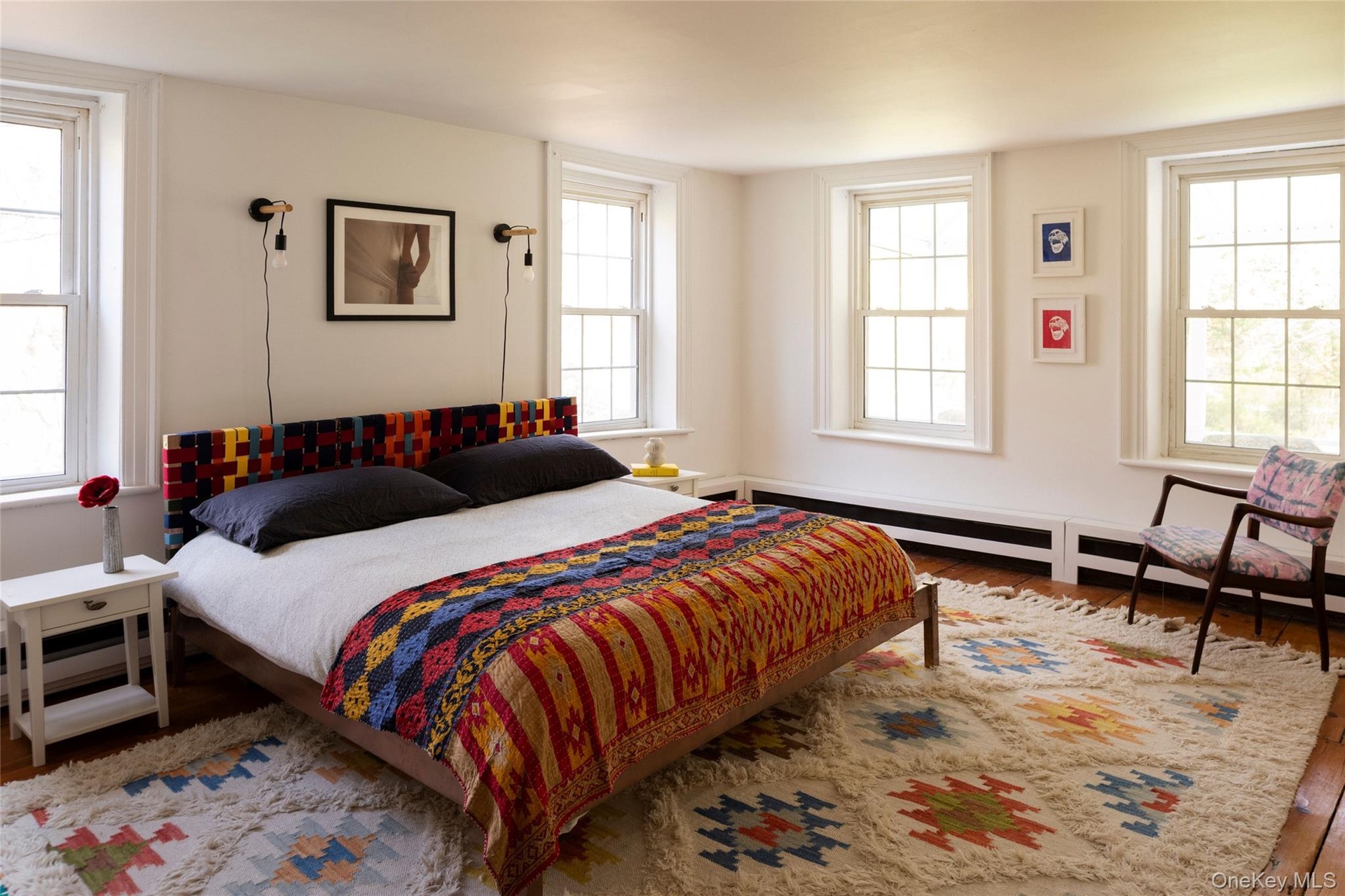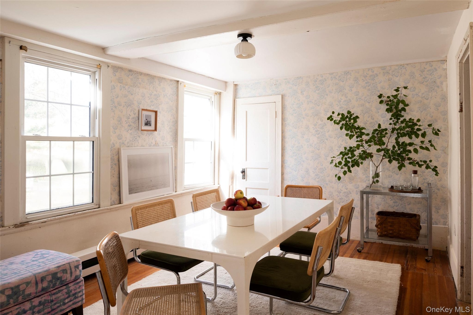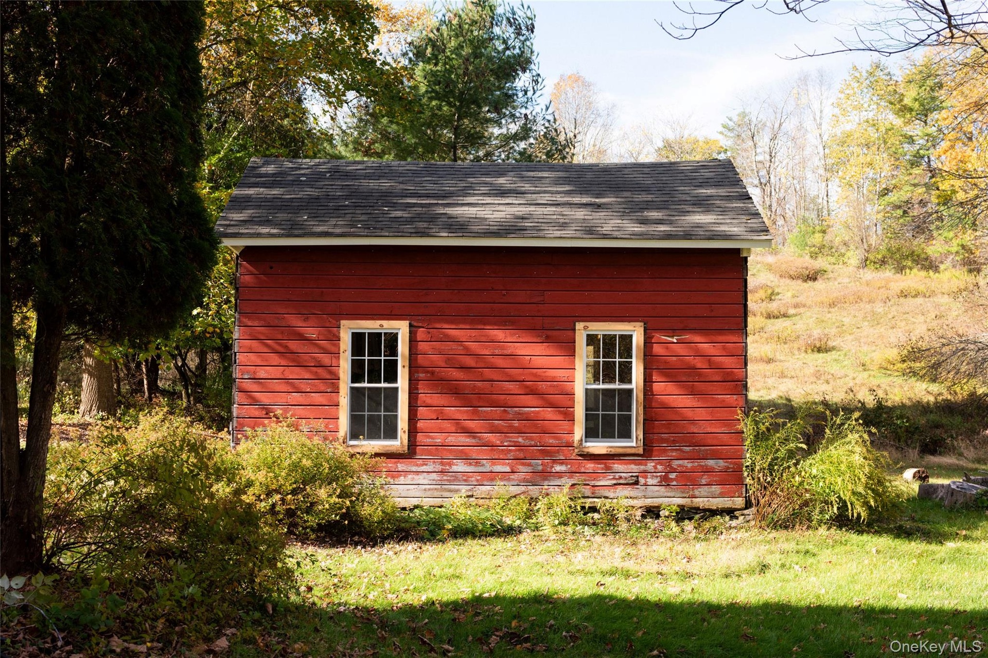 Whitings Pond Farmhouse is a c.1790 farmhouse set in the heart of Columbia County. Located by Queechy Lake, the home is situated on 75 acres of conserved land and exudes classic farmhouse charm. Arrive at a generous front porch that frames the home’s façade. Enter through a half-lite door into a center hall. Wide-plank wood floors run the length of the entry and lead to another half-lite door, allowing light to flood the space while connecting you to the outdoors. To the left, a gracious living room sits at the heart of the home. Exposed beams span the ceiling. The dining room lies adjacent and features vintage floral wallpaper. Both rooms lead to a country kitchen where beadboard cabinets and a corner cupboard add classic old-world charm. A door with arched glass panes leads to the front porch and contributes an air of elegance to the space. Beyond the kitchen, a modern addition incorporates a large four-season room flanked by windows that bathe the space in warm sunlight. A rec room, perfect for various pursuits — hello yoga / art studio! — features a full bath and laundry alcove. Returning to the center-hall, one finds a large ground-floor primary bedroom featuring a spacious walk-in closet and ensuite bathroom. Climb the lovely staircase to a generous second-floor landing where four bedrooms share two full bathrooms. Outside, a detached two-car garage includes additional space for a workshop. Not far, a classic red barn offers endless possibilities for gardeners, artists and entertainers. Paths beyond the garage and barn lead to one’s own private sanctuary of 75 wooded acres. A conservation easement with Columbia Land Conservancy ensures the continued protection and stewardship of this parcel for future generations. All of this — just a stone’s throw from Queechy Lake and minutes to Main Street Chatham and West Stockbridge — makes Whitings Pond Farmhouse an idyllic rural escape for all seasons.