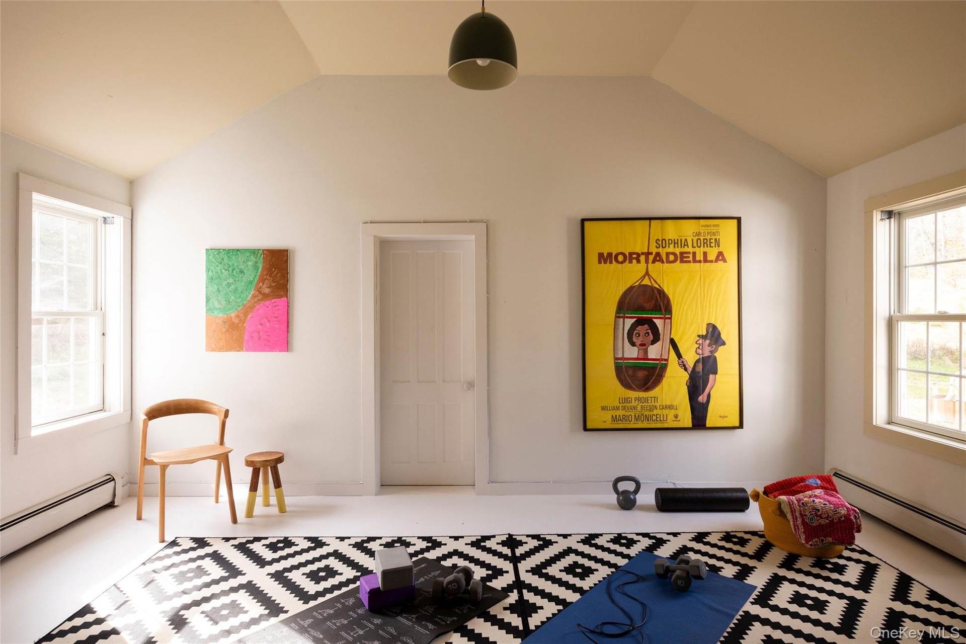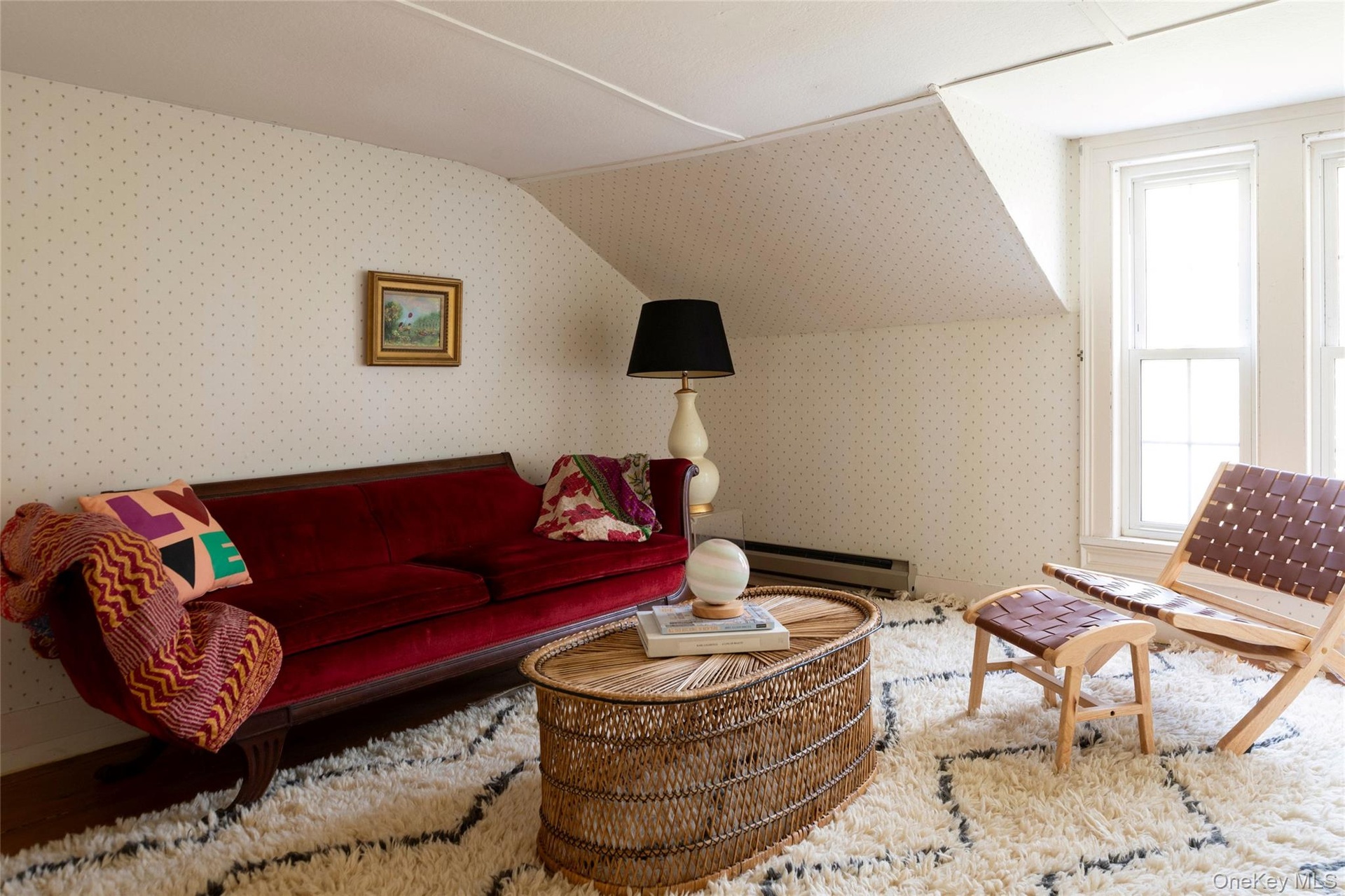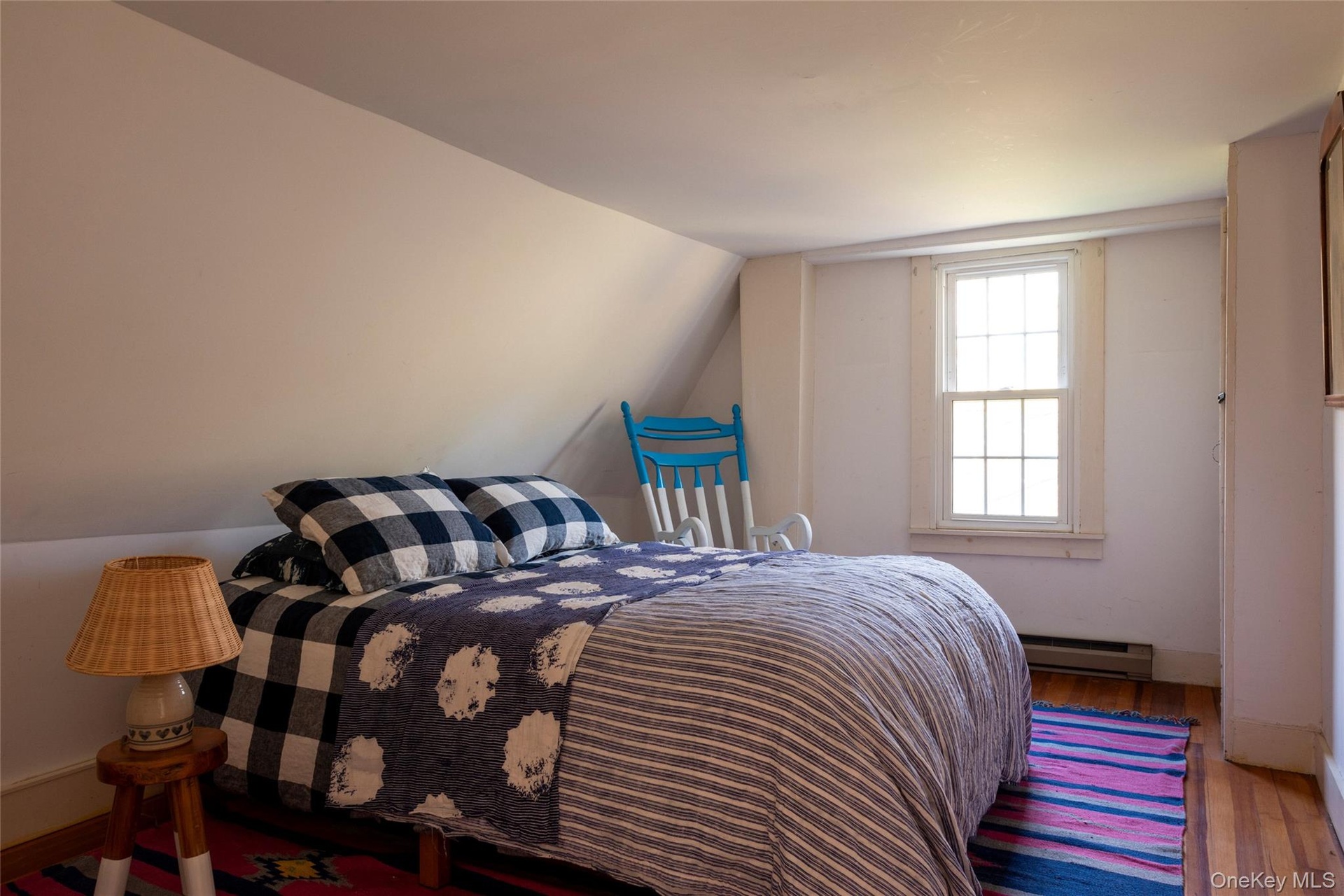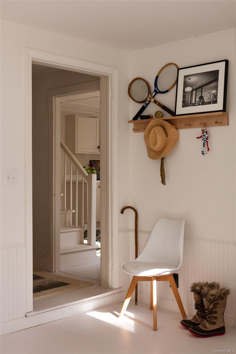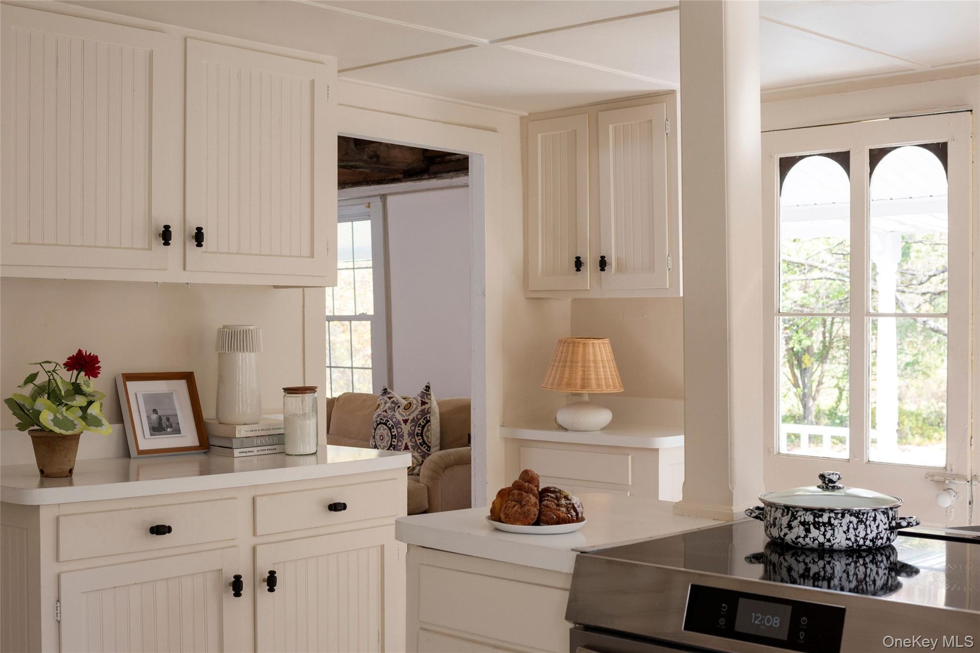 Whitings Pond Farmhouse is a c.1790 farmhouse set in the heart of Columbia County. Located by Queechy Lake, the home is situated on 75 acres of conserved land and exudes classic farmhouse charm. Arrive at a generous front porch that frames the home’s façade. Enter through a half-lite door into a center hall. Wide-plank wood floors run the length of the entry and lead to another half-lite door, allowing light to flood the space while connecting you to the outdoors. To the left, a gracious living room sits at the heart of the home. Exposed beams span the ceiling. The dining room lies adjacent and features vintage floral wallpaper. Both rooms lead to a country kitchen where beadboard cabinets and a corner cupboard add classic old-world charm. A door with arched glass panes leads to the front porch and contributes an air of elegance to the space. Beyond the kitchen, a modern addition incorporates a large four-season room flanked by windows that bathe the space in warm sunlight. A rec room, perfect for various pursuits — hello yoga / art studio! — features a full bath and laundry alcove. Returning to the center-hall, one finds a large ground-floor primary bedroom featuring a spacious walk-in closet and ensuite bathroom. Climb the lovely staircase to a generous second-floor landing where four bedrooms share two full bathrooms. Outside, a detached two-car garage includes additional space for a workshop. Not far, a classic red barn offers endless possibilities for gardeners, artists and entertainers. Paths beyond the garage and barn lead to one’s own private sanctuary of 75 wooded acres. A conservation easement with Columbia Land Conservancy ensures the continued protection and stewardship of this parcel for future generations. All of this — just a stone’s throw from Queechy Lake and minutes to Main Street Chatham and West Stockbridge — makes Whitings Pond Farmhouse an idyllic rural escape for all seasons.