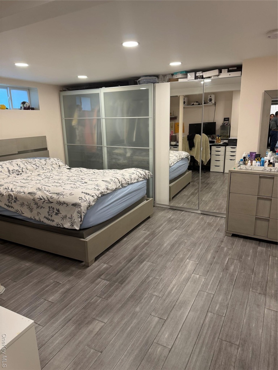 - Bedroom with a closet, wood finished floors, and recessed lighting