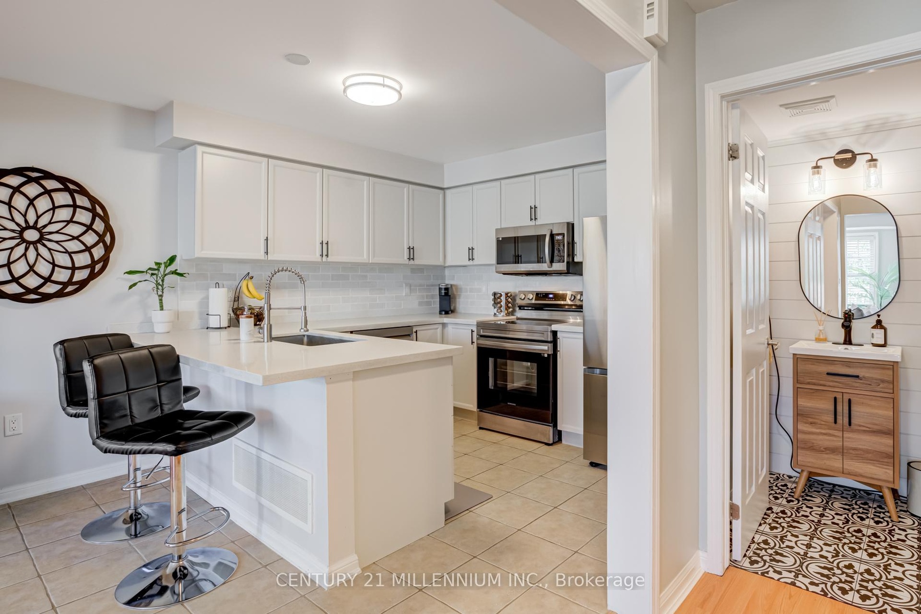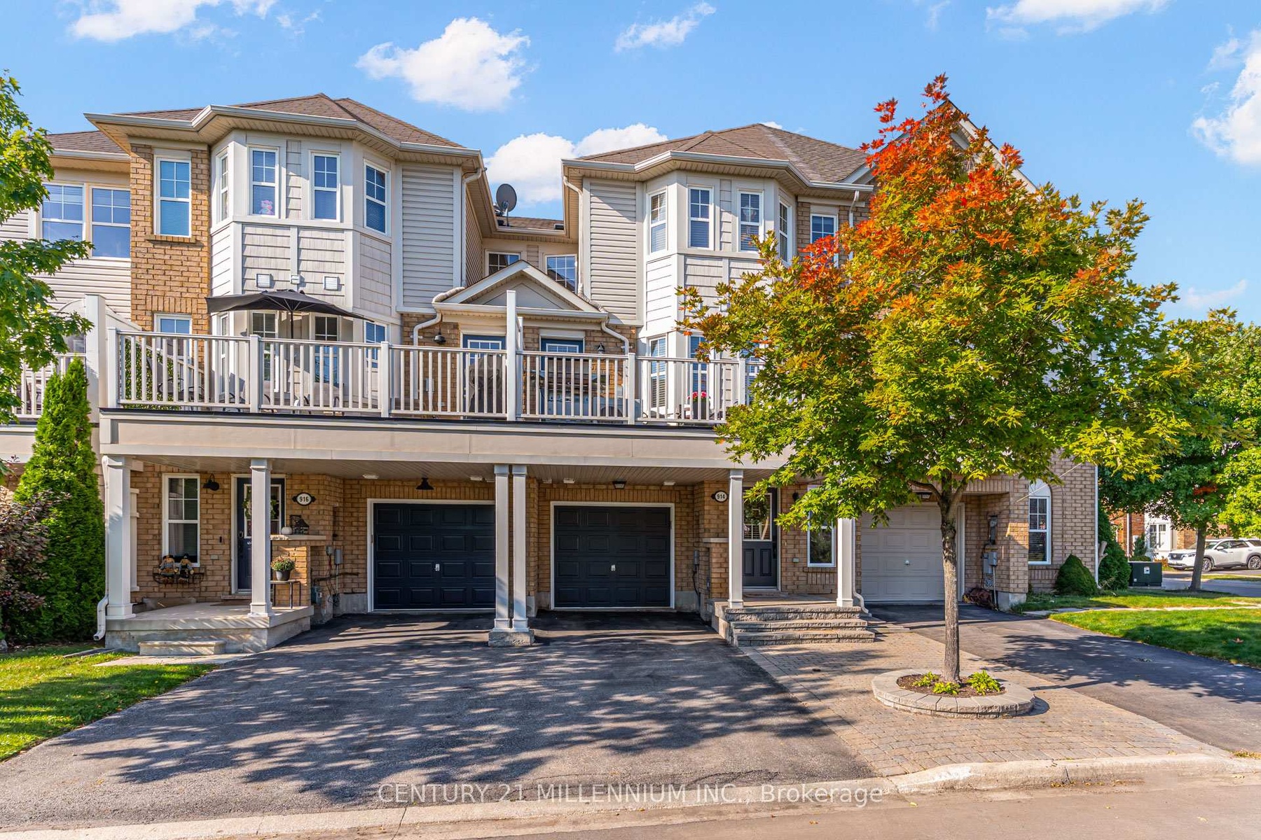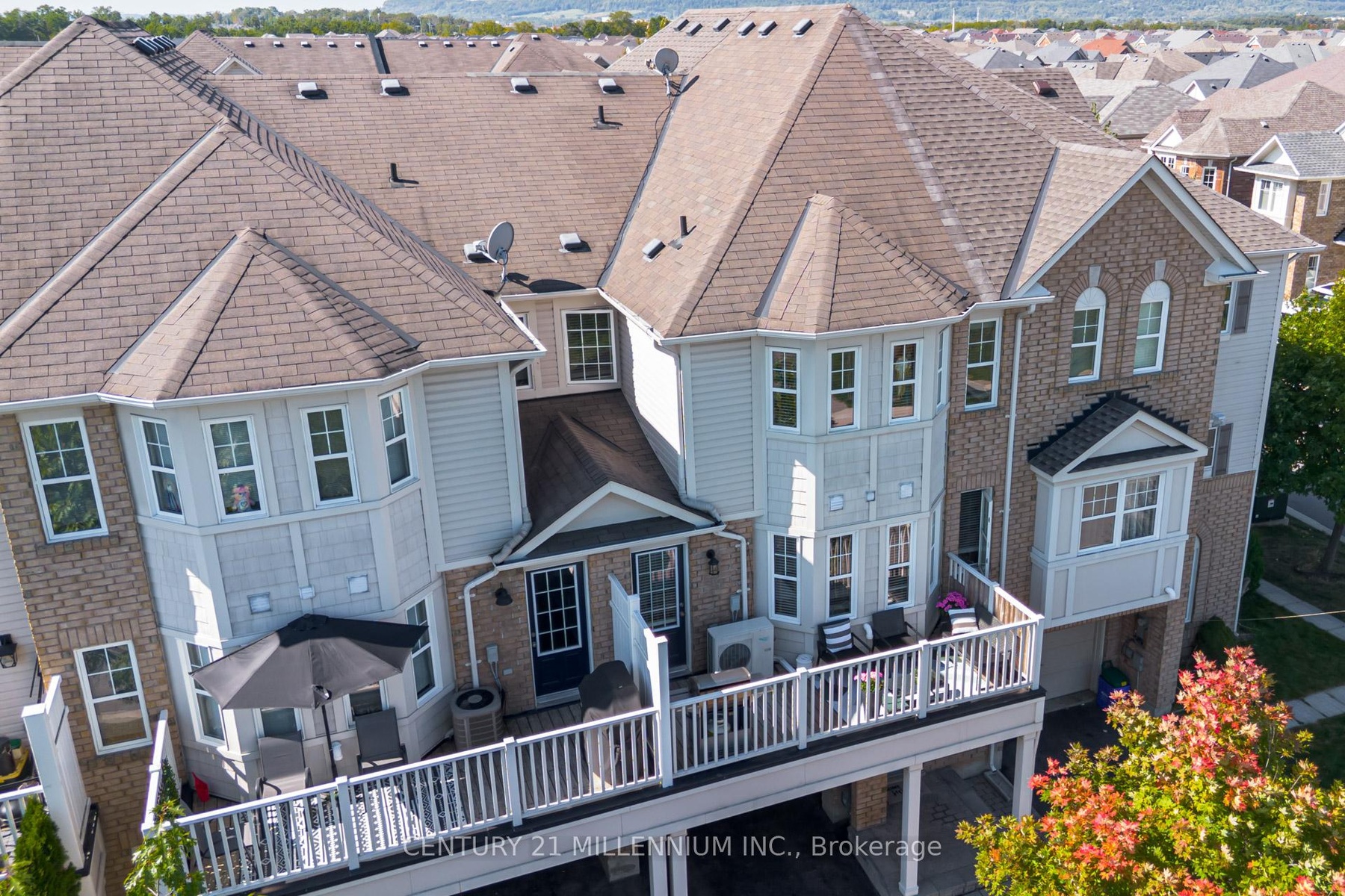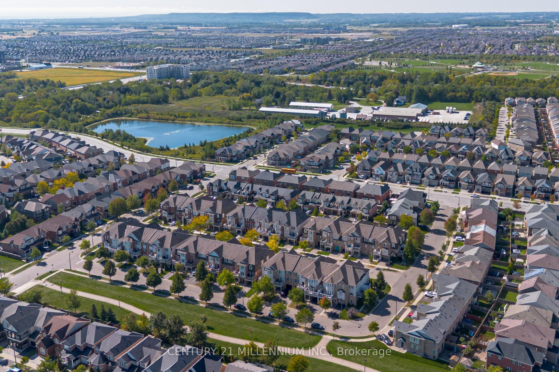 Freehold 3-story town home with all the extras! 2 Beds + den and 3 Baths: main, en-suite, and powder. The primary bedroom fits a king bed with extra space, full size walk-in closet and a 3 piece en-suite bath, 5 windows fill it with sunlight in the morning. The 2nd bedroom is sized with large closet and a charming nook. Stylish main bath has been updated and is in great condition. On the main floor you are welcomed by a full size chef's kitchen filled with upgrades; quartz counter, custom tile back splash, stainless steel appliances, industrial style faucet, oversized sink, modern finishes and an entertainers peninsula to top it all off. Open to the living and dining room, you are flooded by sunlight through the morning. The living room features a large bay window and trendy accent wall. The full size dining walks out to the oversized balcony. The balcony is near double the size of most similar models (over 17 feet long!) enough room for patio furniture, a BBQ and then some! Best of all, the balcony gets expansive views of the park immediately in-front of you, no front neighbours for staring in someones window only feet away, just beautiful greenery. (Not to mention all the added street parking). Further on the main floor we have a fully renovated powder room with mosaic tile floor and ship lap feature wall. Bonus main floor laundry. Entry floor boasts a full size den, utility room, added storage and interior garage access. Exterior features 3 car parking, 1oversized garage and 2 driveway parking spots, 1 is partially covered. Easy maintenance as theproperty is fully stone so no lawn to maintain! The full home is only 18 years old and has been loved and cared for. The neighbourhood is family oriented with great neighbours. Nearby is schools, grocery, restaurants, medical, pharmacy, shopping, parks, and more. All of the modern conveniences of a large city without all the crowding and chaos. Easy highway access, GO station and public transit near by. Don't miss this!