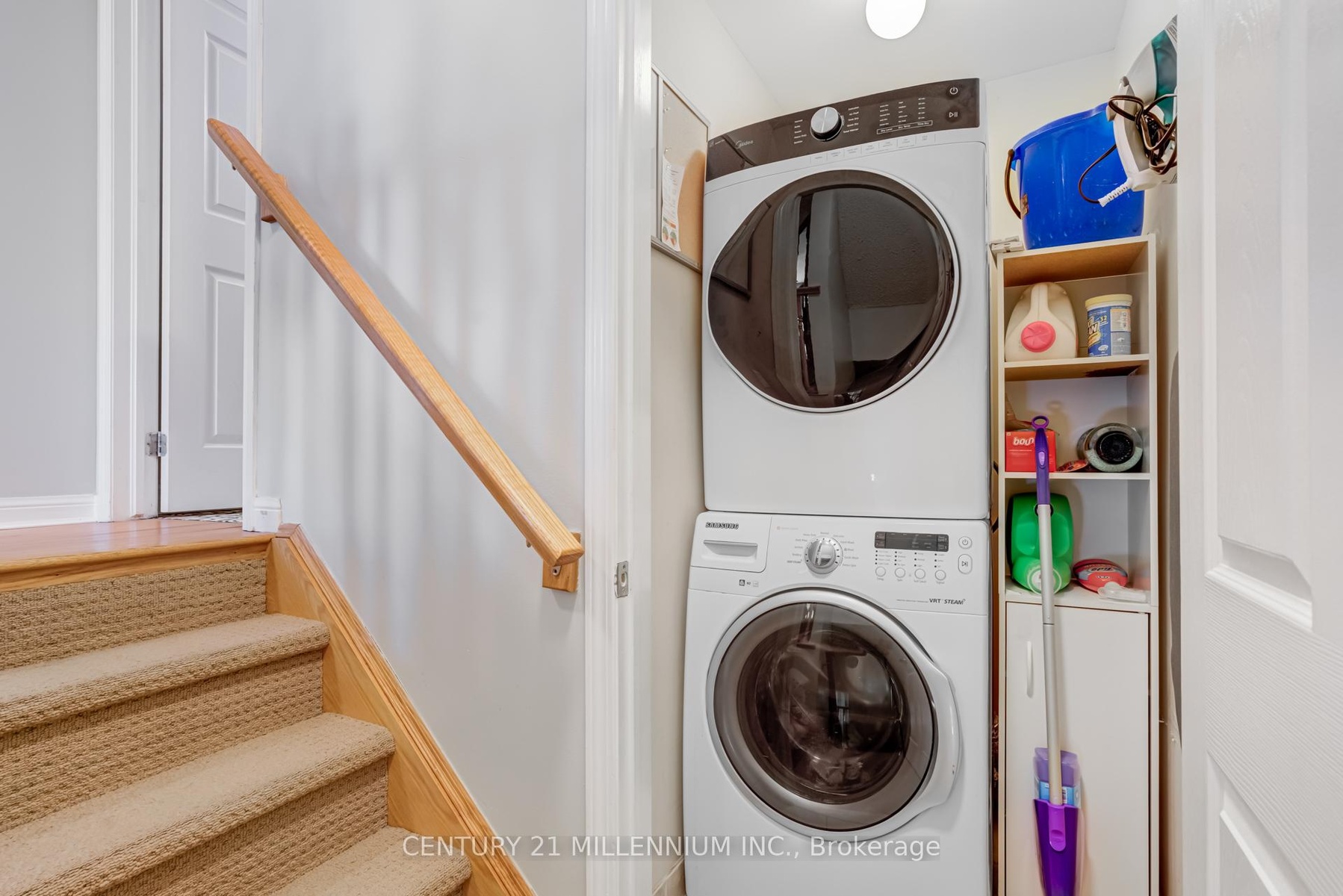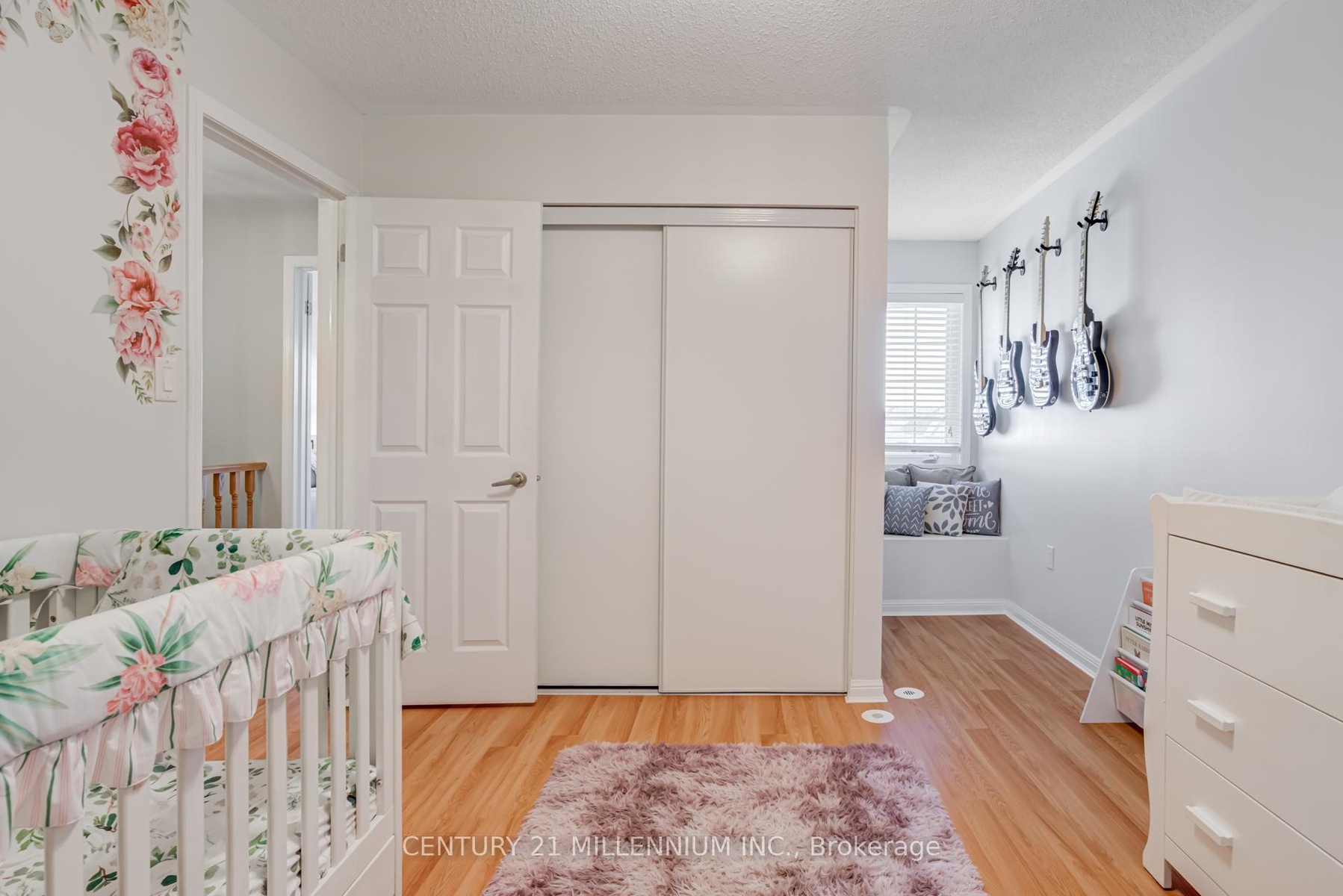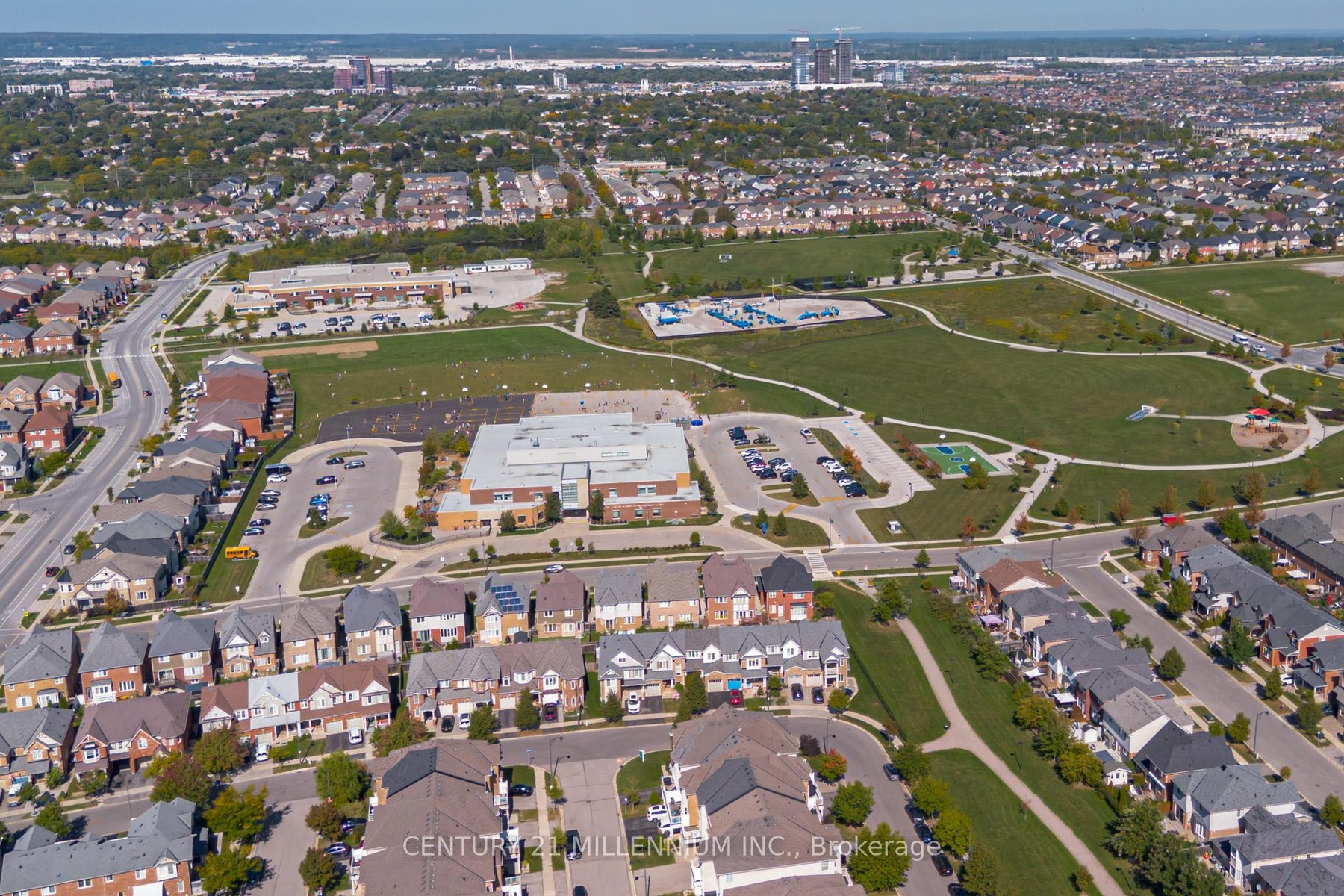 Freehold 3-story town home with all the extras! 2 Beds + den and 3 Baths: main, en-suite, and powder. The primary bedroom fits a king bed with extra space, full size walk-in closet and a 3 piece en-suite bath, 5 windows fill it with sunlight in the morning. The 2nd bedroom is sized with large closet and a charming nook. Stylish main bath has been updated and is in great condition. On the main floor you are welcomed by a full size chef's kitchen filled with upgrades; quartz counter, custom tile back splash, stainless steel appliances, industrial style faucet, oversized sink, modern finishes and an entertainers peninsula to top it all off. Open to the living and dining room, you are flooded by sunlight through the morning. The living room features a large bay window and trendy accent wall. The full size dining walks out to the oversized balcony. The balcony is near double the size of most similar models (over 17 feet long!) enough room for patio furniture, a BBQ and then some! Best of all, the balcony gets expansive views of the park immediately in-front of you, no front neighbours for staring in someones window only feet away, just beautiful greenery. (Not to mention all the added street parking). Further on the main floor we have a fully renovated powder room with mosaic tile floor and ship lap feature wall. Bonus main floor laundry. Entry floor boasts a full size den, utility room, added storage and interior garage access. Exterior features 3 car parking, 1oversized garage and 2 driveway parking spots, 1 is partially covered. Easy maintenance as theproperty is fully stone so no lawn to maintain! The full home is only 18 years old and has been loved and cared for. The neighbourhood is family oriented with great neighbours. Nearby is schools, grocery, restaurants, medical, pharmacy, shopping, parks, and more. All of the modern conveniences of a large city without all the crowding and chaos. Easy highway access, GO station and public transit near by. Don't miss this!