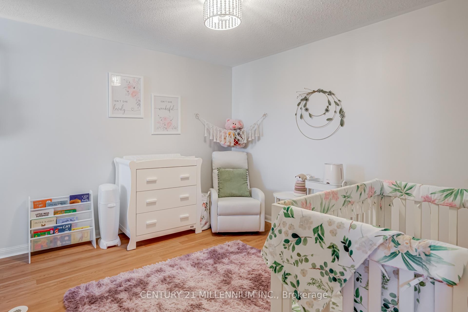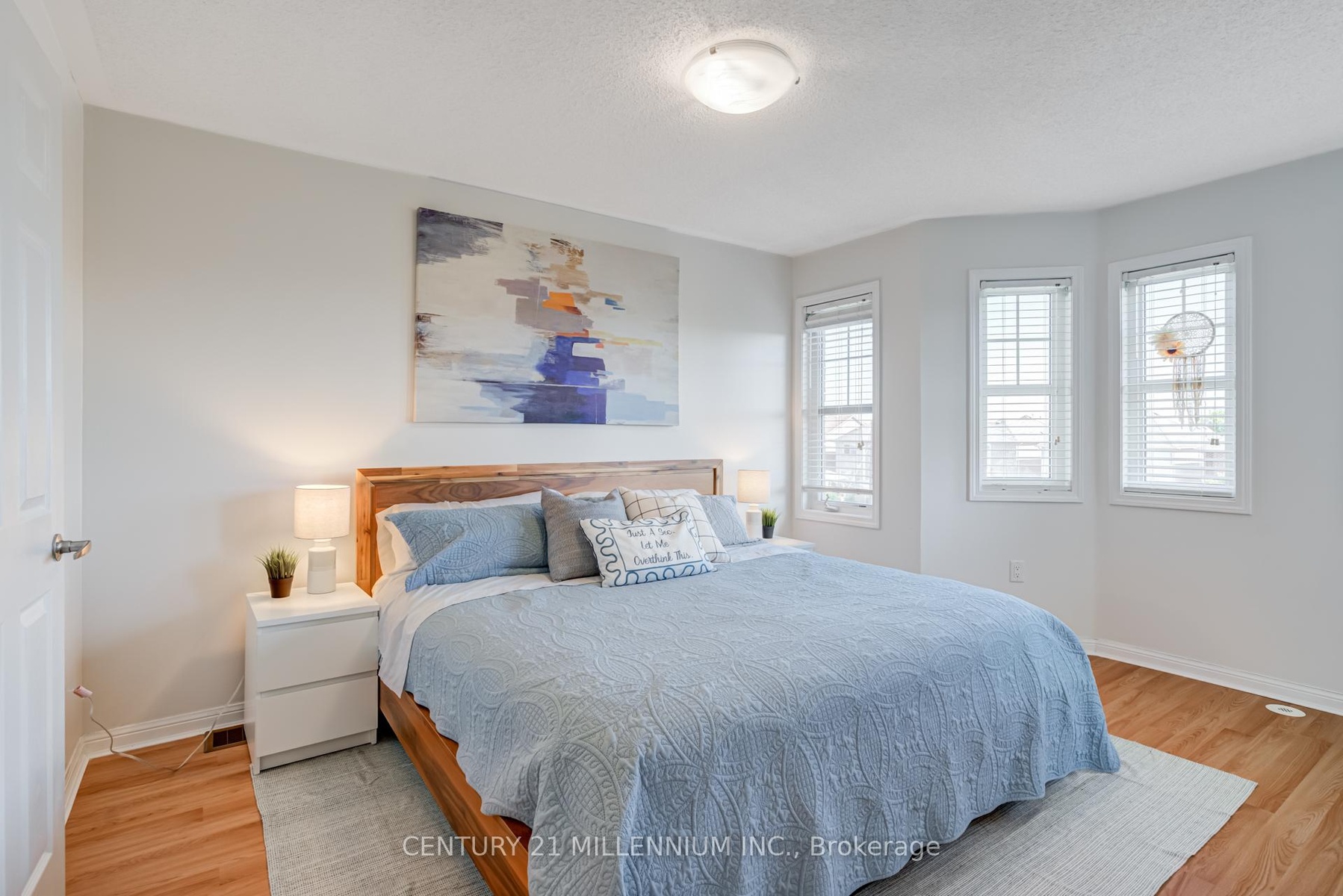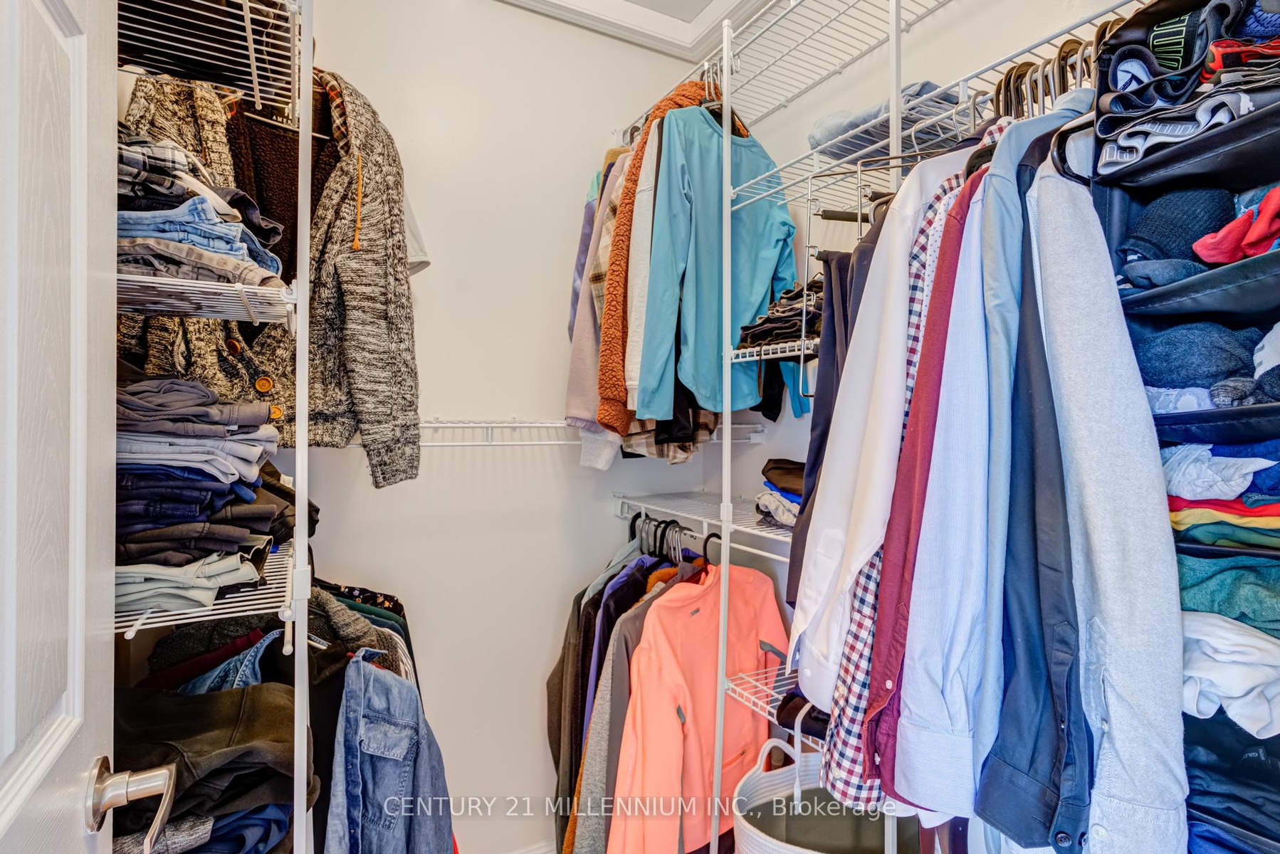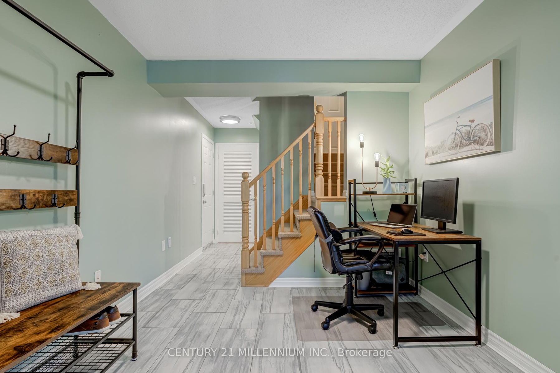 Freehold 3-story town home with all the extras! 2 Beds + den and 3 Baths: main, en-suite, and powder. The primary bedroom fits a king bed with extra space, full size walk-in closet and a 3 piece en-suite bath, 5 windows fill it with sunlight in the morning. The 2nd bedroom is sized with large closet and a charming nook. Stylish main bath has been updated and is in great condition. On the main floor you are welcomed by a full size chef's kitchen filled with upgrades; quartz counter, custom tile back splash, stainless steel appliances, industrial style faucet, oversized sink, modern finishes and an entertainers peninsula to top it all off. Open to the living and dining room, you are flooded by sunlight through the morning. The living room features a large bay window and trendy accent wall. The full size dining walks out to the oversized balcony. The balcony is near double the size of most similar models (over 17 feet long!) enough room for patio furniture, a BBQ and then some! Best of all, the balcony gets expansive views of the park immediately in-front of you, no front neighbours for staring in someones window only feet away, just beautiful greenery. (Not to mention all the added street parking). Further on the main floor we have a fully renovated powder room with mosaic tile floor and ship lap feature wall. Bonus main floor laundry. Entry floor boasts a full size den, utility room, added storage and interior garage access. Exterior features 3 car parking, 1oversized garage and 2 driveway parking spots, 1 is partially covered. Easy maintenance as theproperty is fully stone so no lawn to maintain! The full home is only 18 years old and has been loved and cared for. The neighbourhood is family oriented with great neighbours. Nearby is schools, grocery, restaurants, medical, pharmacy, shopping, parks, and more. All of the modern conveniences of a large city without all the crowding and chaos. Easy highway access, GO station and public transit near by. Don't miss this!