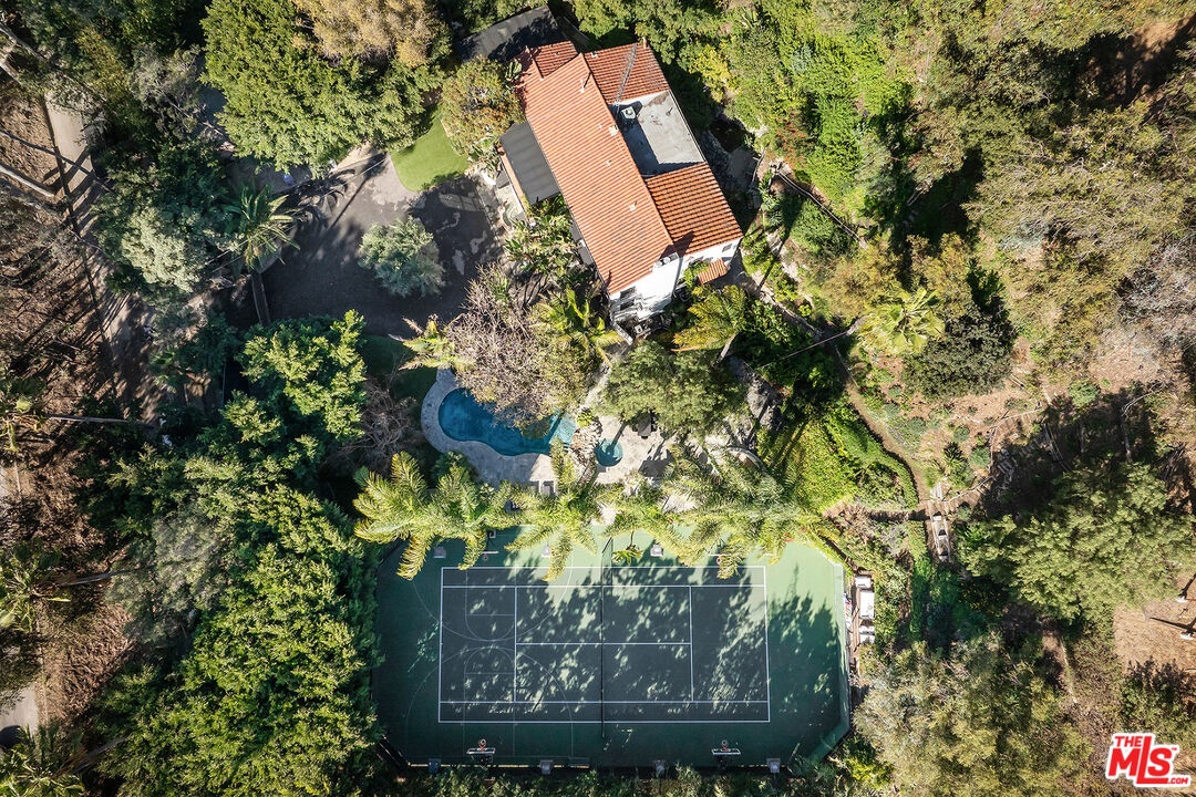 Set on a sprawling lot, this secluded Spanish Revival estate captures the allure of Old Hollywood with its harmonious blend of classic architecture and refined, warm living spaces. Tucked far back from the street behind a gated entry for complete privacy, the residence features a spacious motor court anchored by a majestic olive tree, offering a stately welcome to this remarkable sanctuary. Inside, a double-height entry foyer leads to a formal living room with a vintage fireplace and French doors that flood the space with natural light while seamlessly connecting to the lush outdoors. The estate's architectural details include tall, arched windows, intricate stained glass accents, and wrought iron embellishments, complemented by rich terra cotta elements and warm, dark woods. A chef-caliber kitchen flows effortlessly into a formal dining area, where French doors open to one of the home's many garden patios. Adjacent to the dining area is a timeless bar and game room, complete with a pool table, that extends to a private outdoor lounge and a covered dining areaideal for hosting and entertaining. The primary suite is a serene retreat, featuring vaulted ceilings, a cozy sitting area with a fireplace, and expansive windows framing picturesque views. Its spa-like ensuite bathroom is appointed with a dual vanity, rainfall shower, and indulgent soaking tub. Generously sized guest bedrooms provide comfort and privacy for family or visitors. Outdoors, the property transforms into a recreational haven. A full tennis and basketball court, sparkling pool, and jacuzzi are surrounded by lush tropical greenery, while a barrel sauna and cold plunge deliver the ultimate in relaxation. The outdoor kitchen and barbecue area, along with multiple alfresco and covered dining spaces, create endless opportunities for entertaining and embody true California luxury living. A hillside deck, perfect for stargazing, completes the exceptional backyard experience. Situated in a prime location in the Hollywood Hills, this residence offers easy access to the vibrant Sunset Strip while maintaining an air of tranquility. A masterpiece of privacy, elegance, and modern convenience, this property is a rare find, seamlessly blending the timeless charm of Spanish and Mediterranean architecture reminiscent of Old Hollywood with all the amenities of contemporary living