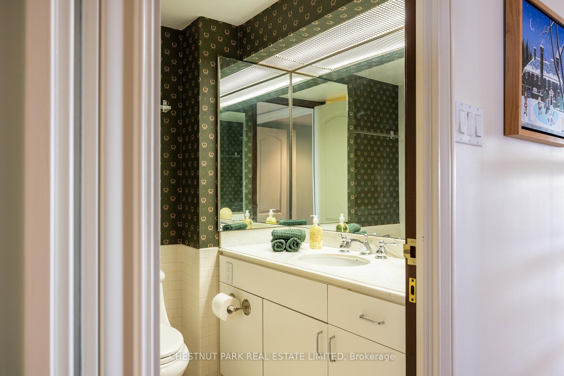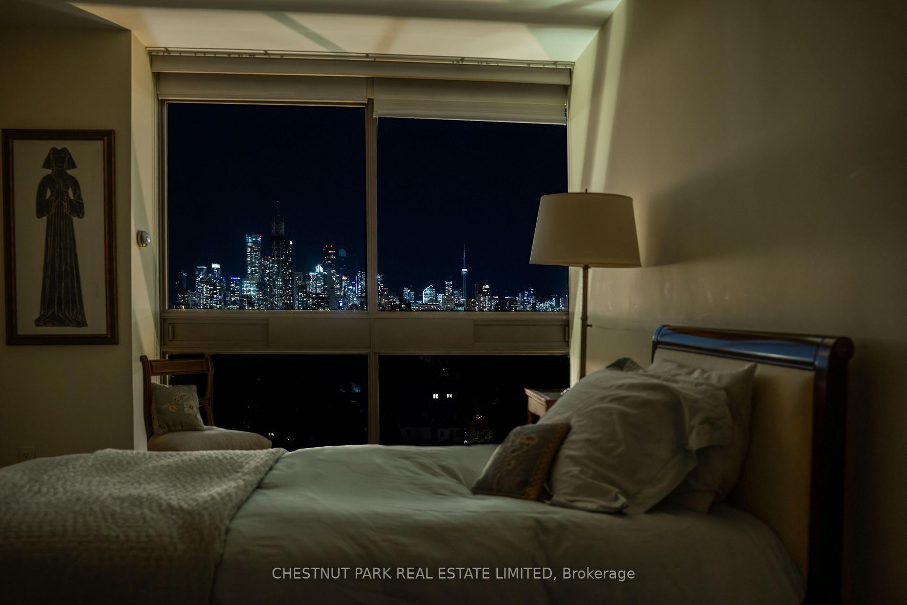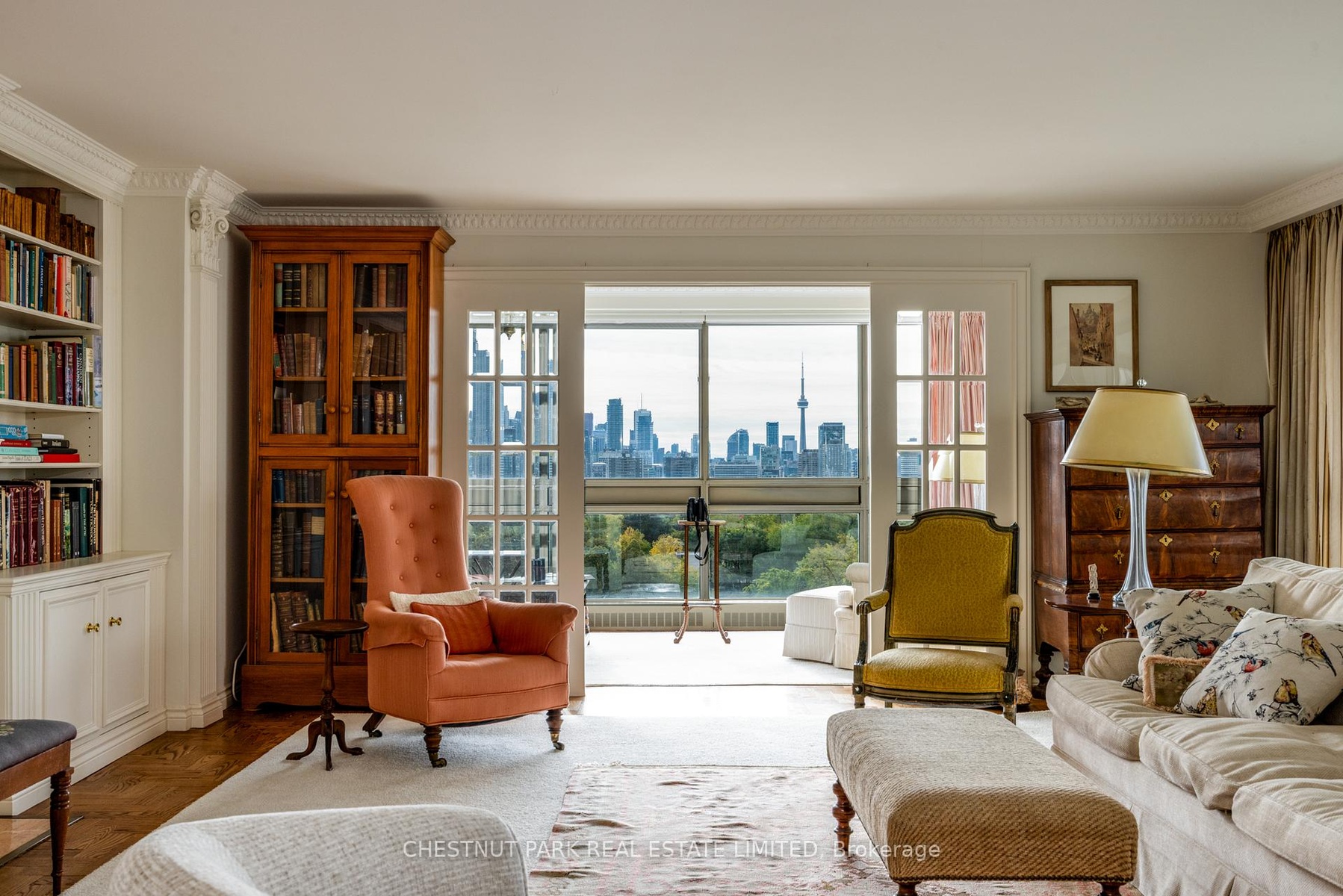 Rare offering at Granite Place. South, West, and North views from the 10th floor, enjoying nearly 2600 square feet of living space. Gaze across the treetops to the CN Tower and onward to the lake. Watch the incoming weather, the changing skyline, and the twinkling night lights. The Suite feels like a large home with room for entertaining, art, and a lifetime of collectibles. The Foyer welcomes you into this elegant and open space. The transitional style combines traditional comfort with expansive, open, and light-filled design. The living room opens wide to the sunroom with balcony walkouts in both rooms. The long hallway to the primary creates a private retreat with a large sitting area, dressing room, and bath, as well as a large dedicated balcony. On the theme of privacy, the 3rd and 4th bedrooms are set in the south wing, both enjoying enchanting views and a dedicated 4-piece bath. Yes. The suite has 4 Bedrooms, currently used as 2 plus 2 large offices, and 4 bathrooms *. Closets are abundant throughout with organizational systems and shelving. If you still need more storage, 2 large lockers are also included for exclusive use. 2 Parking spots are owned and in a prime location on A level near the entrance. The laundry room has a wash sink, large storage cupboards, and even a dedicated entrance. Granite Place offers a gentile lifestyle set away from the rumble of St Clair behind in a mature, treed, and private park setting, with an attentive concierge staff, salt water pool, gyms, sauna, event room, and a soon-to-be completed and highly anticipated renovated lobby.