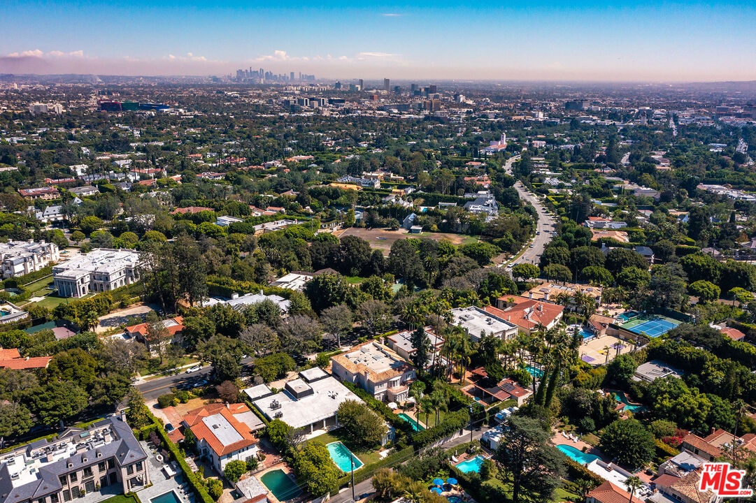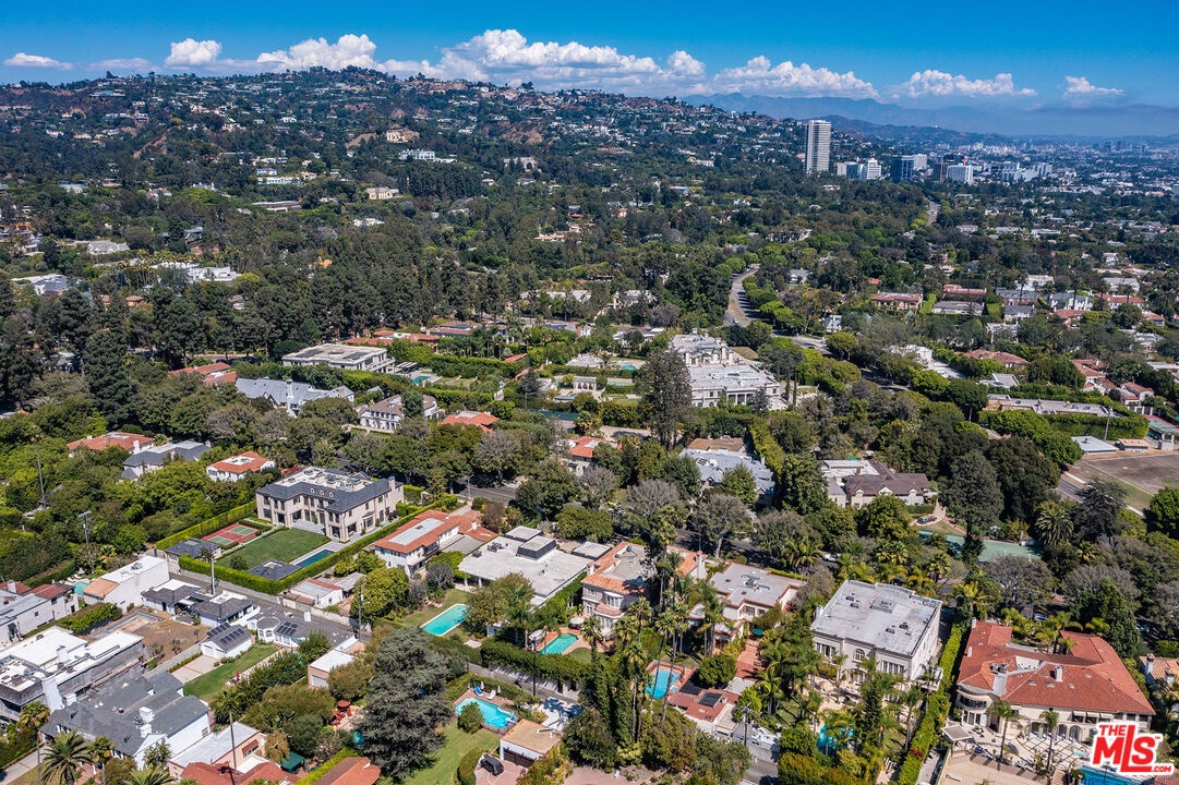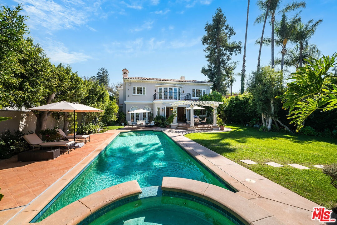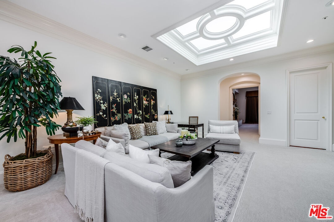 Behind double front gates in prime Beverly Hills just North of Sunset Boulevard, this grand Contemporary Villa, built in 1991 by renowned builder Martin Selko and designed by Sheri Schlesinger, showcases exquisite curb appeal and timeless elegance. A sweeping motor court, two-car garage, and lush landscaping set the stage for the estate's impressive presence. The residence opens to a dramatic two-story foyer with intricate marble floors, skylight, and a sweeping staircase. Sunlit rooms with soaring ceilings, fine moldings, and French doors create a bright, inviting atmosphere throughout. The formal living room with fireplace and a handsome library/office with custom paneling provide refined spaces for entertaining and work. Wide hallways and generous wall space are ideal for art display. At the heart of the home lies the expansive gourmet kitchen, featuring a large eat-in island, professional-grade appliances, and a cheerful breakfast room. The kitchen flows into the spacious family room with fireplace and built-in bar. The outdoor oasis offers a dining gazebo, pool, spa, patios, and manicured lawn, perfect for entertaining or relaxing in privacy. Upstairs, a skylit landing opens to a secondary family room. Three guest or family bedroom suites, each with en-suite baths, accompany the luxurious primary suite with fireplace, dual marble bathrooms, two room-sized walk-in closets, and a private balcony overlooking the grounds. A staff/maid's suite is conveniently located on the main level. The estate is offered furnished with exquisite pieces by J. Robert Scott, enhancing its sophisticated interiors with refined style and comfort. This exceptional lease combines elegance, comfort, and distinguished design with a premier Beverly Hills location, moments from world-class shopping, dining, and entertainment.