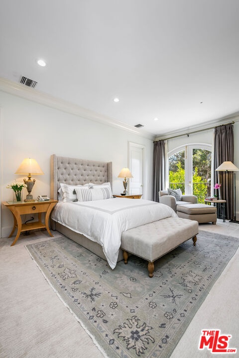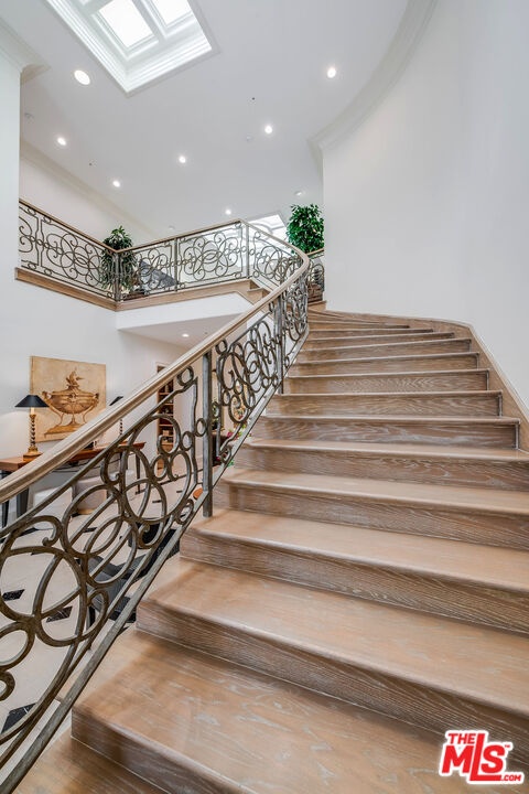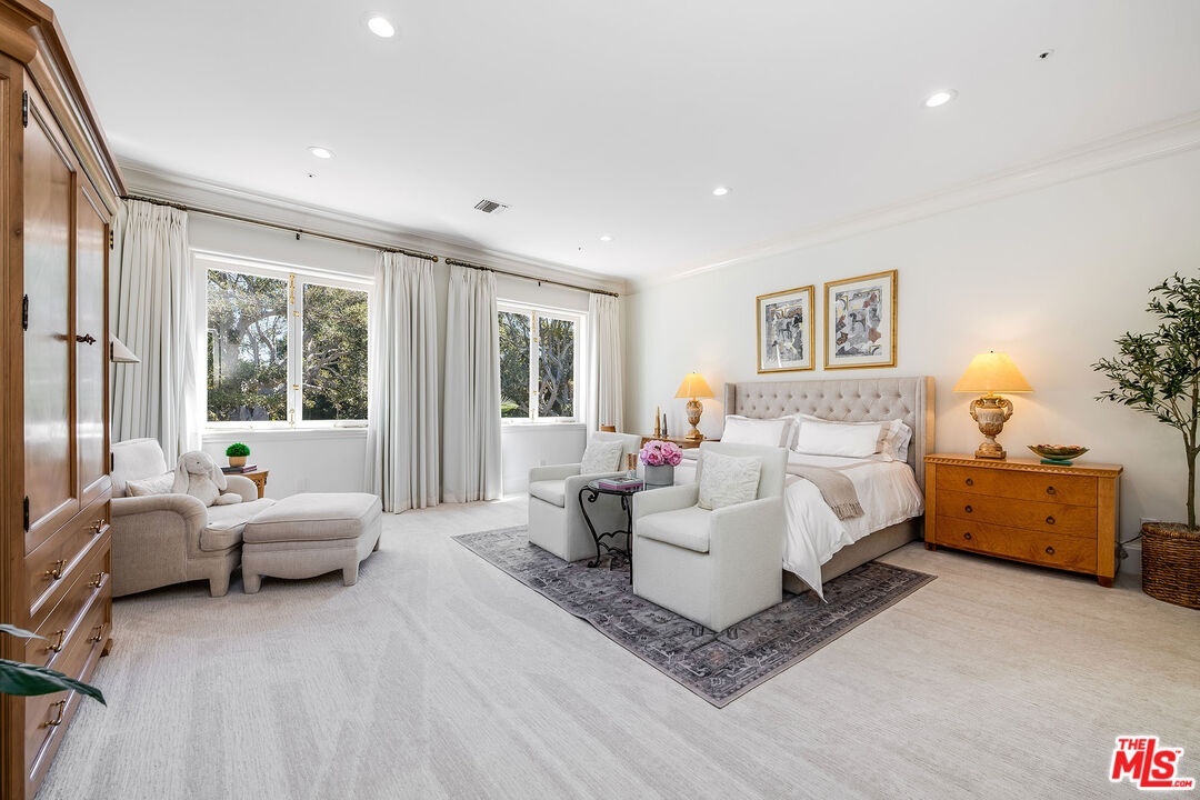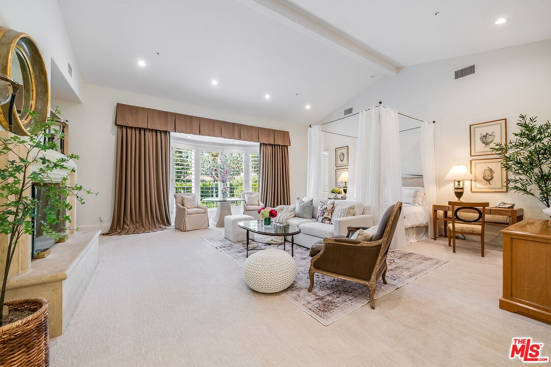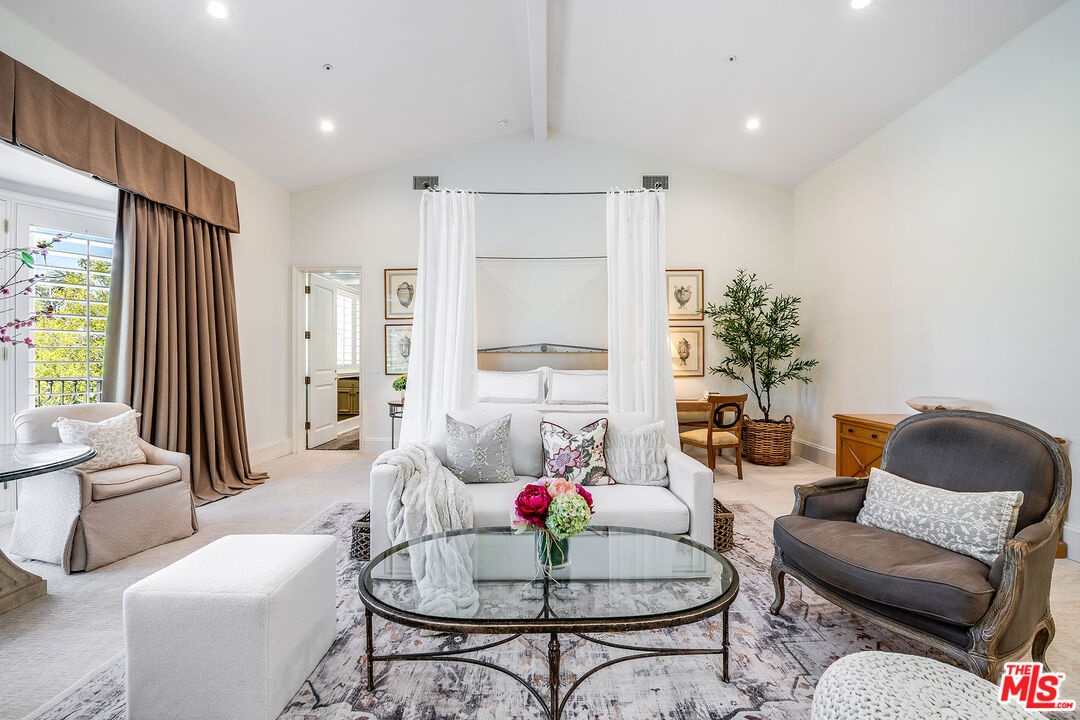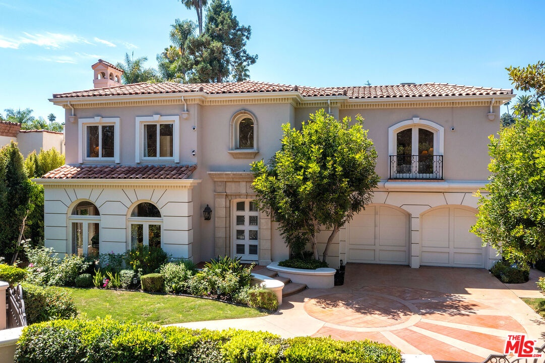 Behind double front gates in prime Beverly Hills just North of Sunset Boulevard, this grand Contemporary Villa, built in 1991 by renowned builder Martin Selko and designed by Sheri Schlesinger, showcases exquisite curb appeal and timeless elegance. A sweeping motor court, two-car garage, and lush landscaping set the stage for the estate's impressive presence. The residence opens to a dramatic two-story foyer with intricate marble floors, skylight, and a sweeping staircase. Sunlit rooms with soaring ceilings, fine moldings, and French doors create a bright, inviting atmosphere throughout. The formal living room with fireplace and a handsome library/office with custom paneling provide refined spaces for entertaining and work. Wide hallways and generous wall space are ideal for art display. At the heart of the home lies the expansive gourmet kitchen, featuring a large eat-in island, professional-grade appliances, and a cheerful breakfast room. The kitchen flows into the spacious family room with fireplace and built-in bar. The outdoor oasis offers a dining gazebo, pool, spa, patios, and manicured lawn, perfect for entertaining or relaxing in privacy. Upstairs, a skylit landing opens to a secondary family room. Three guest or family bedroom suites, each with en-suite baths, accompany the luxurious primary suite with fireplace, dual marble bathrooms, two room-sized walk-in closets, and a private balcony overlooking the grounds. A staff/maid's suite is conveniently located on the main level. The estate is offered furnished with exquisite pieces by J. Robert Scott, enhancing its sophisticated interiors with refined style and comfort. This exceptional lease combines elegance, comfort, and distinguished design with a premier Beverly Hills location, moments from world-class shopping, dining, and entertainment.