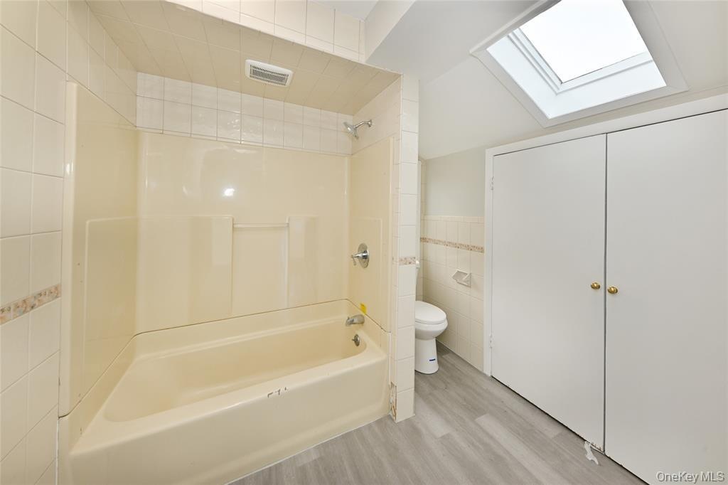 - Bathroom with tile walls, light wood-style floors, shower / bathtub combination, and a skylight