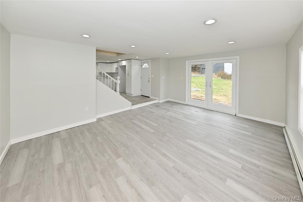 - Unfurnished living room featuring baseboard heating, light wood-style flooring, recessed lighting, and stairway