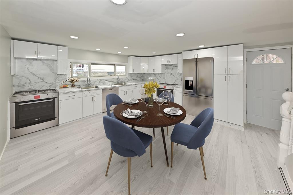 - Dining area featuring light wood-type flooring and recessed lighting