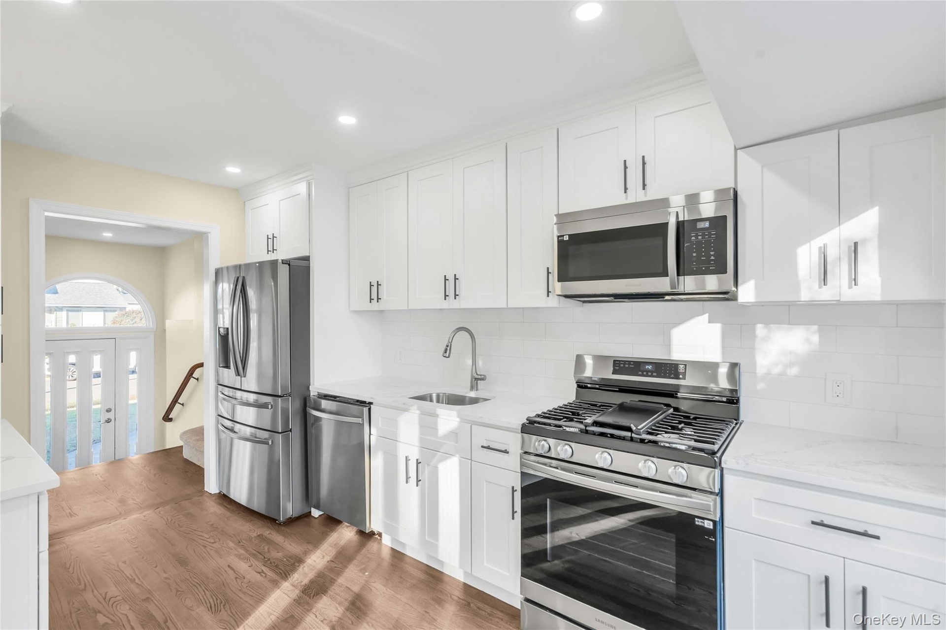Step inside to discover new wood floors, a newly painted interior, and an open layout connecting the kitchen, dining room, and family room, creating the perfect flow for entertaining and everyday living. The brand-new kitchen features elegant white shaker cabinets, quartz countertops, and modern finishes — perfect for cooking and gathering with family and friends. From the kitchen, step out onto your spacious new deck, ideal for family barbecues, relaxing, and soaking up the sun.