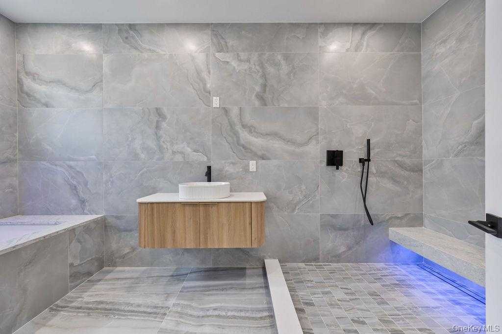 Ascend the sun-drenched staircase to the second floor and discover the crown jewel of the home — the primary suite, featuring a resort-style bathroom with Jacuzzi tub, rainfall shower with bench, and color-controlled cove lighting for the ultimate experience. The thoughtfully designed walk-in closet is perfectly placed off the bathroom, maximizing convenience. This level also includes a private guest suite with a full bath, three additional bedrooms, and a fully outfitted laundry room featuring a sink, custom cabinetry, and a raised counter for convenient folding.