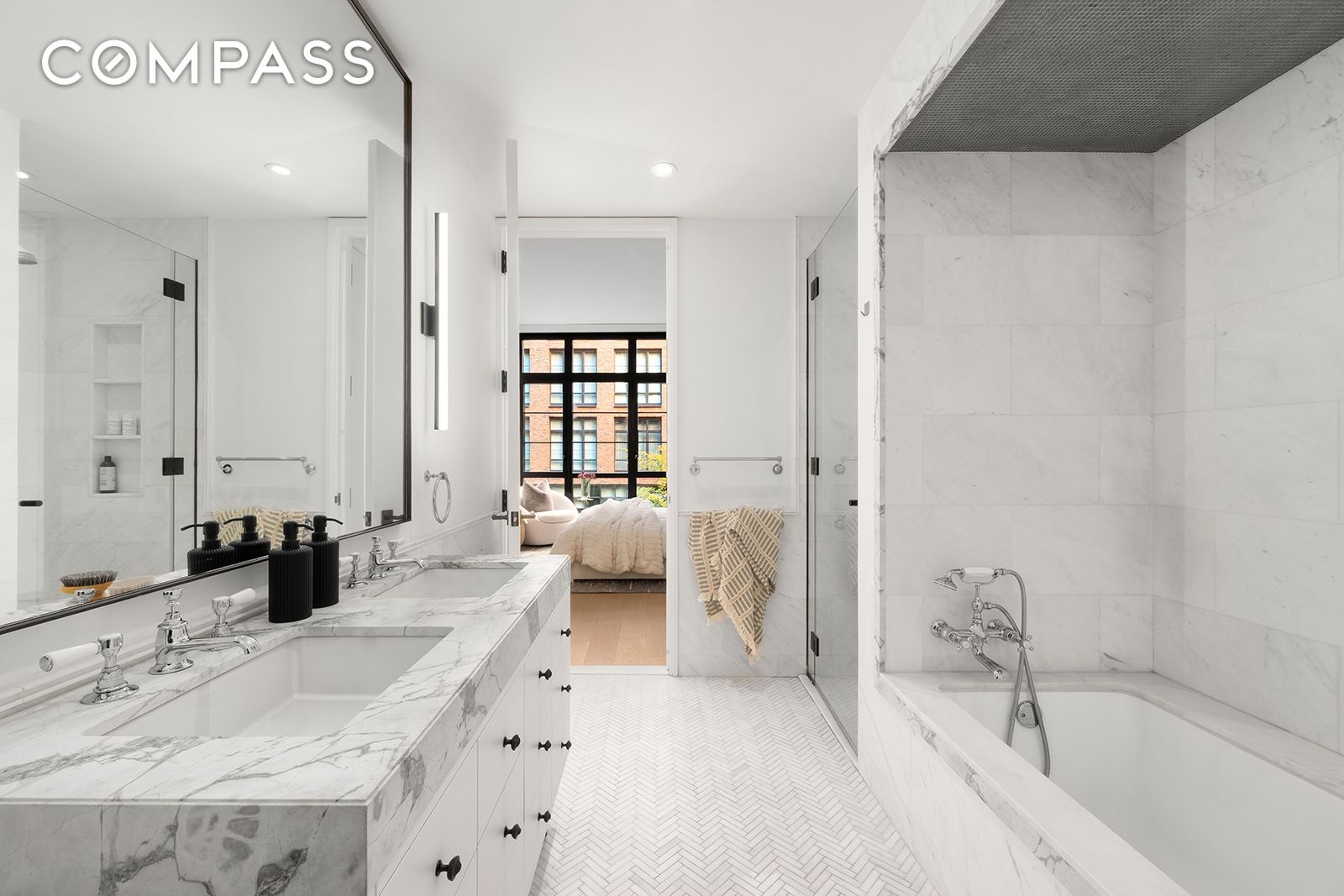 The second bedroom is also graciously scaled and features a double closet and more stunning, soundproof casement windows. The second bathroom is finished with Bianco Carrara honed marble mosaic walls and floor, a Corbata Nero marble-framed vanity mirror, and a cerused white oak Italian vanity topped by Bianco Dolomiti. Chrome fittings by Waterworks are featured throughout both baths