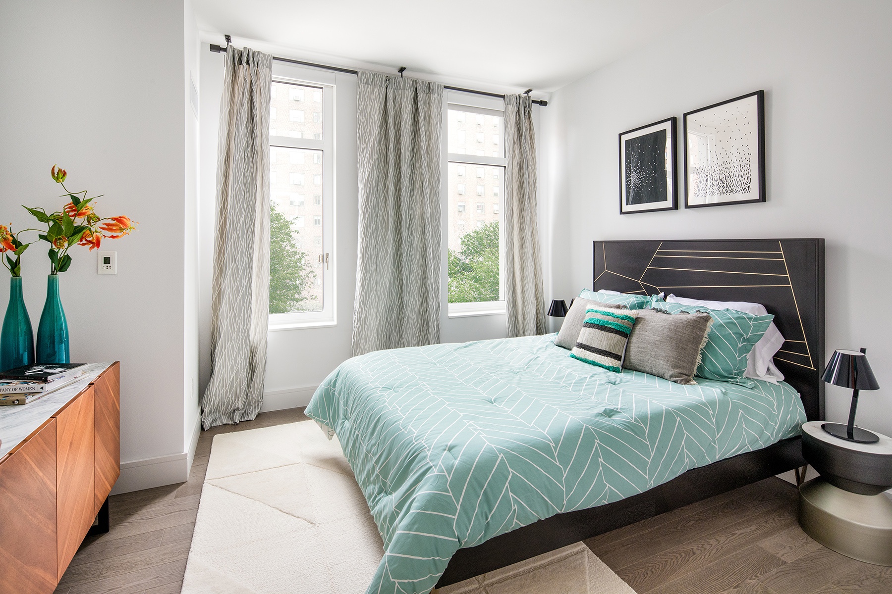 Make yourself at home in this unique corner split two bedroom, two bathroom residence. 508 features generous living and entertaining area, a windowed kitchen, and excellent closets. The huge open kitchen is outfitted with Miele and Bosch appliances, Cosentino Silestone Quartz countertops and backsplash, and unique wood and glass cabinets with gunmetal pulls. The master bathroom includes a walk-in shower with blackened steel and fluted glass door. Both bathrooms feature Porcelanosa tile and Kohler and Wetstyle fixtures. This apartment is finished with hardwood white oak flooring and an in-unit Bosch washer/dryer.