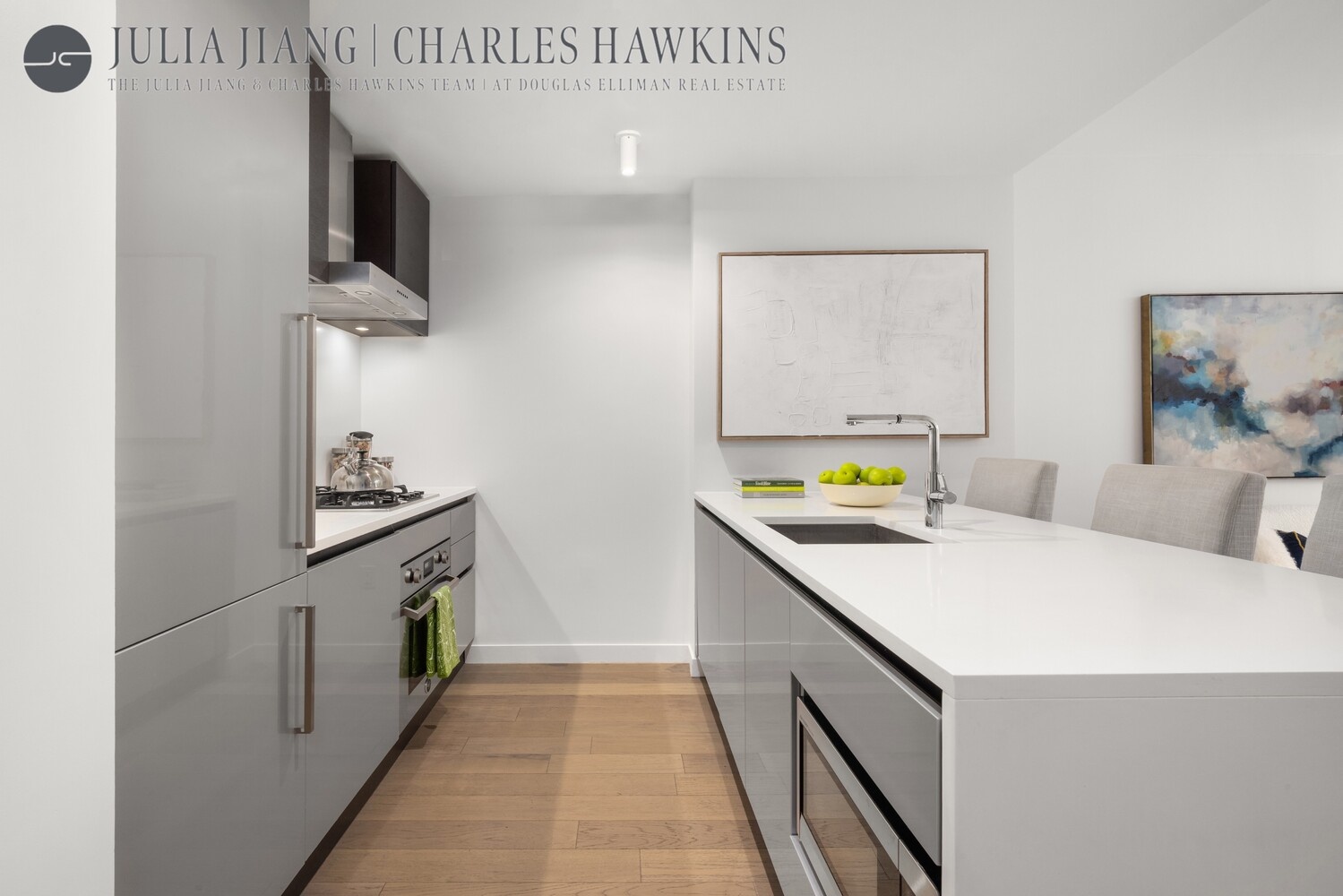 The modern galley kitchen is equipped with premium finishes, including quartz countertops, a Bertazzoni gas range and oven, a quiet dishwasher, and a Liebherr refrigerator, all complemented by sleek Italian cabinetry. The generously sized bedroom provides ample space, while the bathroom includes a deep soaking tub, handheld and rain-head shower fixtures, and an elegant Italian floating vanity. For added convenience, the apartment also includes a washer and dryer, with individually controlled heating and cooling.