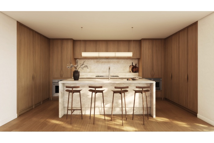 Designed by AD100 firm Workstead, the interiors embrace simplicity as a form of luxury-combining natural materials, craftsmanship, and balance to create a calming retreat. The kitchen showcases custom white oak cabinetry and hardware, paired with a honed Taj Mahal quartzite countertop, backsplash, and ledge. A fully integrated Bosch appliance suite complements the design's refined minimalism, allowing the textures and tones to take center stage.