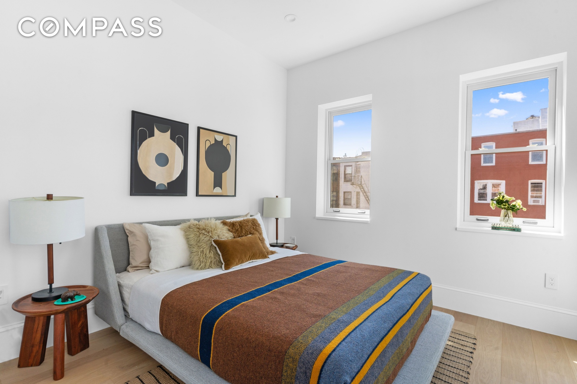 1370 Dean is where history meets modern living. Once a grand historic townhouse, it has been reimagined as a boutique condominium, meticulously restored to preserve its landmark charm while introducing refined, contemporary design. The result is a rare opportunity to own a piece of New York’s past, thoughtfully crafted for today’s lifestyle. Your brownstone dream awaits. Introducing 1370 Dean Street, a distinct collection of four new luxury condominium residences located on a quiet tree-lined block in Crown Heights, ready to be called home. Apartment D is an expertly crafted 2-bed 2-bath penthouse with a private terrace off the primary suite and an expansive private rooftop above with an outdoor kitchen. Light is abundant in every room with excellent triple exposures to the north, south, and west. This thoughtfully designed and completely restored home features engineered oak flooring throughout, a Mitsubishi heating and cooling system, an abundance of picture windows, and brand-new kitchens and bathrooms, making it the perfect blend of historic and modern living. Upon entry, experience the best in open-concept living with a great room that provides plenty of space to stage a living area comfortably. This perfect haven for everyday living and entertaining also features a dedicated and distinct area for formal dining. The open-style chef’s kitchen is appointed with sleek white cabinetry, quartz countertops and backsplashes, Grohe faucet, an Elkay kitchen sink, a Miele hood, and a top-of-the-line Miele appliance package, including an oversized refrigerator with a double drawer freezer, an electric cooktop, a wall oven, and a dishwasher. The well-proportioned primary bedroom accommodates a king-size bed and more, boasting a massive walk-in closet. The spa-like en-suite marble bathroom is outfitted with double sinks and vanities, Brizio fixtures, and a large shower stall. The primary bedroom also provides access to the first of your two private terraces, perfect for enjoying morning coffees or reading a book. The secondary bedroom with an ample size closet is positioned at the front of the apartment which peers out onto bucolic Dean St and is adjacent to a spacious secondary windowed marble bathroom with intricately woven marble tile floors, double sinks and Duravet vanities, a deep Kohler soaking tub with Brizio tub and shower controls and Toto toilet. There is also a stackable washer and dryer tucked away in an entryway closet, which completes the interior of this level of the home. Finally, whether it's with family or friends, take a step up your internal stairway and invite them to your expansive private rooftop terrace. This incredible outdoor sanctuary serves as the perfect retreat for seasonal gatherings, dining al fresco, or just basking in the sun, gardening, or taking in the breathtaking surrounding views. Located in the Crown Heights North Historic District, this classic condominium is surrounded by trendy restaurants like Meat, Kingston Public House, and Pando’s Creperie & Cafe, boutique shops, and is easily accessible to public transportation. This is not an offering plan. The complete offering terms are available in an offering plan, which can be obtained from the sponsor. Sponsor reserves the right to make changes in accordance with the offering plan CD22-0204. One year of complimentary off-site storage paid by the sponsor.