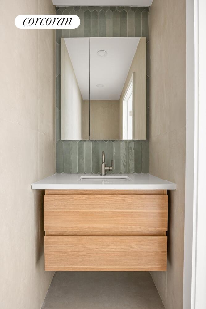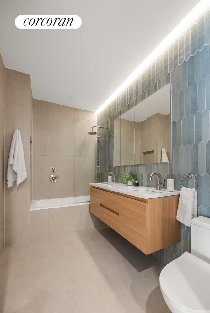 A bright bedroom with two oversized windows overlooks the backyard and includes a walk-in closet for ample storage. The full bathroom, located off the hallway, is a calming sanctuary with soft neutral tiles, a double vanity, and brushed nickel fixtures. A closet with washer/dryer on this level adds everyday convenience.