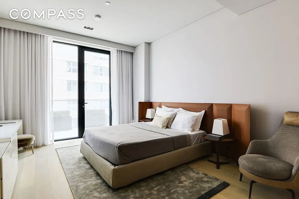 The master bedroom suite is a true sanctuary with a private terrace, southern exposures, and a spacious closet with integrated lighting by Poliform. The en-suite master bathroom features 7 wide-plank Bavarian Spessart oak and radiant heated Perlado Beige marble flooring, Perlado Beige marble and Augsburg oak paneled walls, custom vanity with integrated lighting, Perlado Beige marble shower tub with Dornbracht fixtures, and Toto Neorest water closet.