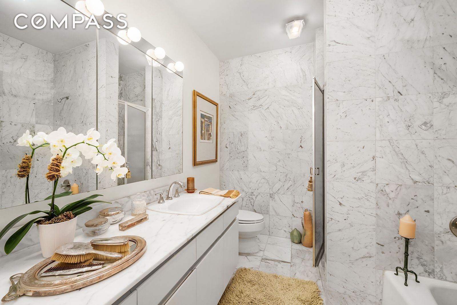 The primary ensuite bedroom serves as a private retreat, complete with a marble-clad bathroom featuring a separate soaking tub and shower, oversized vanity with drawers — a true spa-like escape.