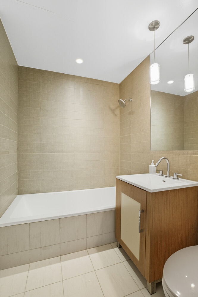 Residents enjoy a full suite of amenities including two roof decks with skyline views, a fitness and yoga studio, 24-hour concierge, residents' lounge with billiards and media area, children's playroom, cold storage, bike storage, and a landscaped courtyard.