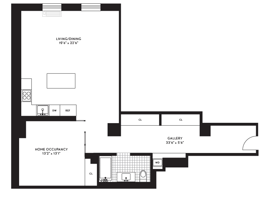 The modern open kitchen offers plenty of cabinets, soapstone counters, an expansive kitchen island that easily seats 3-5 guests for your cooking or wine tasting gatherings, stainless steel GE appliance package, gas stove, fridge with ice maker, a sizeable wine cooler, and microwave. A Bosch dishwasher and an in-unit Asko washer and dryer are at your service. The gallery has plenty of closets and beautiful bamboo flooring throughout the apartment.
