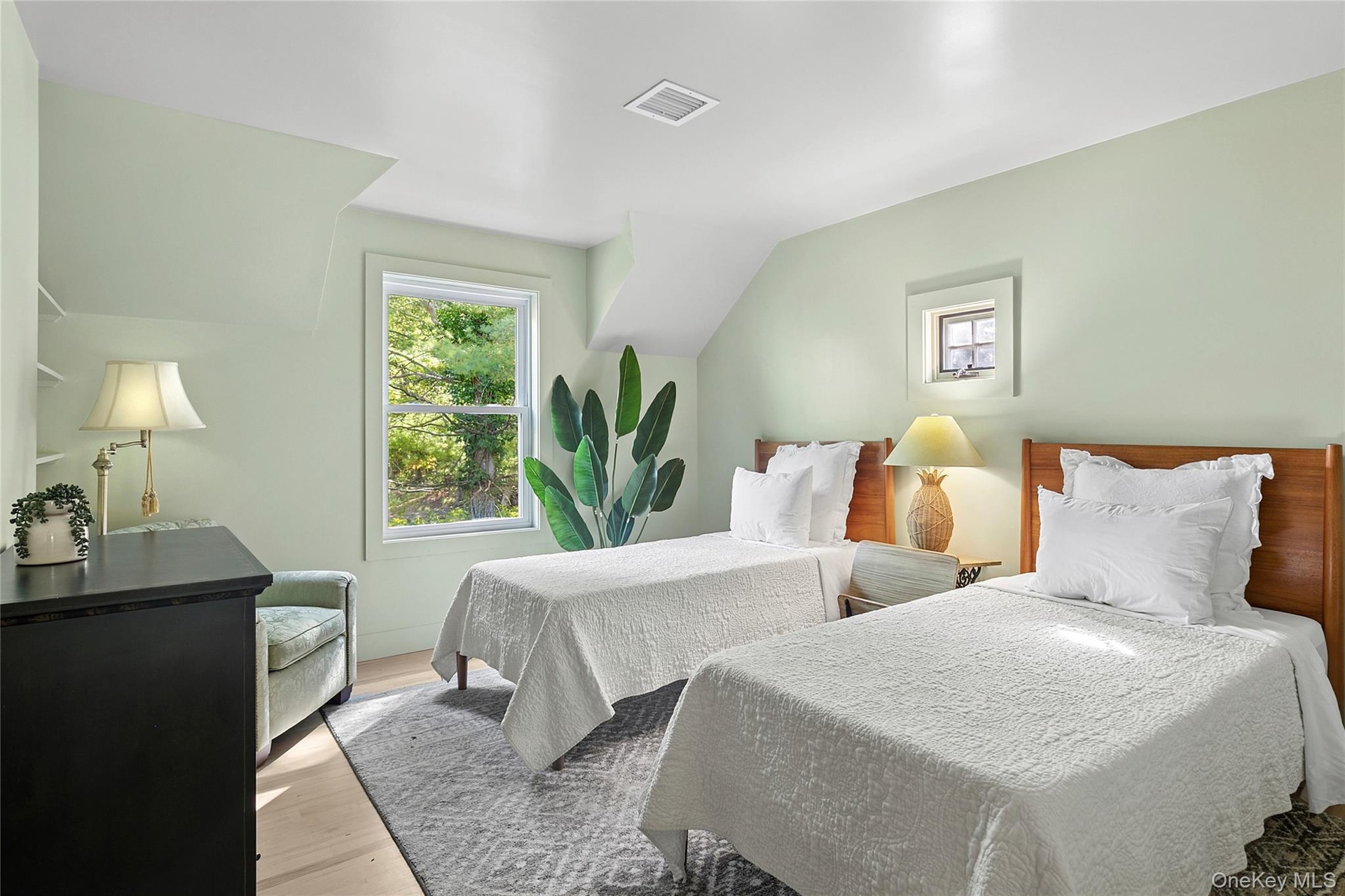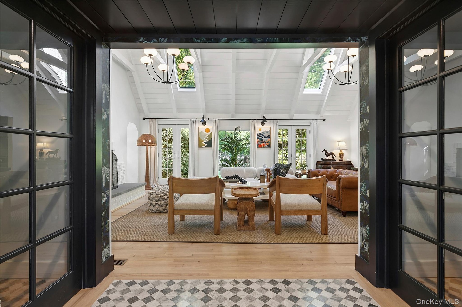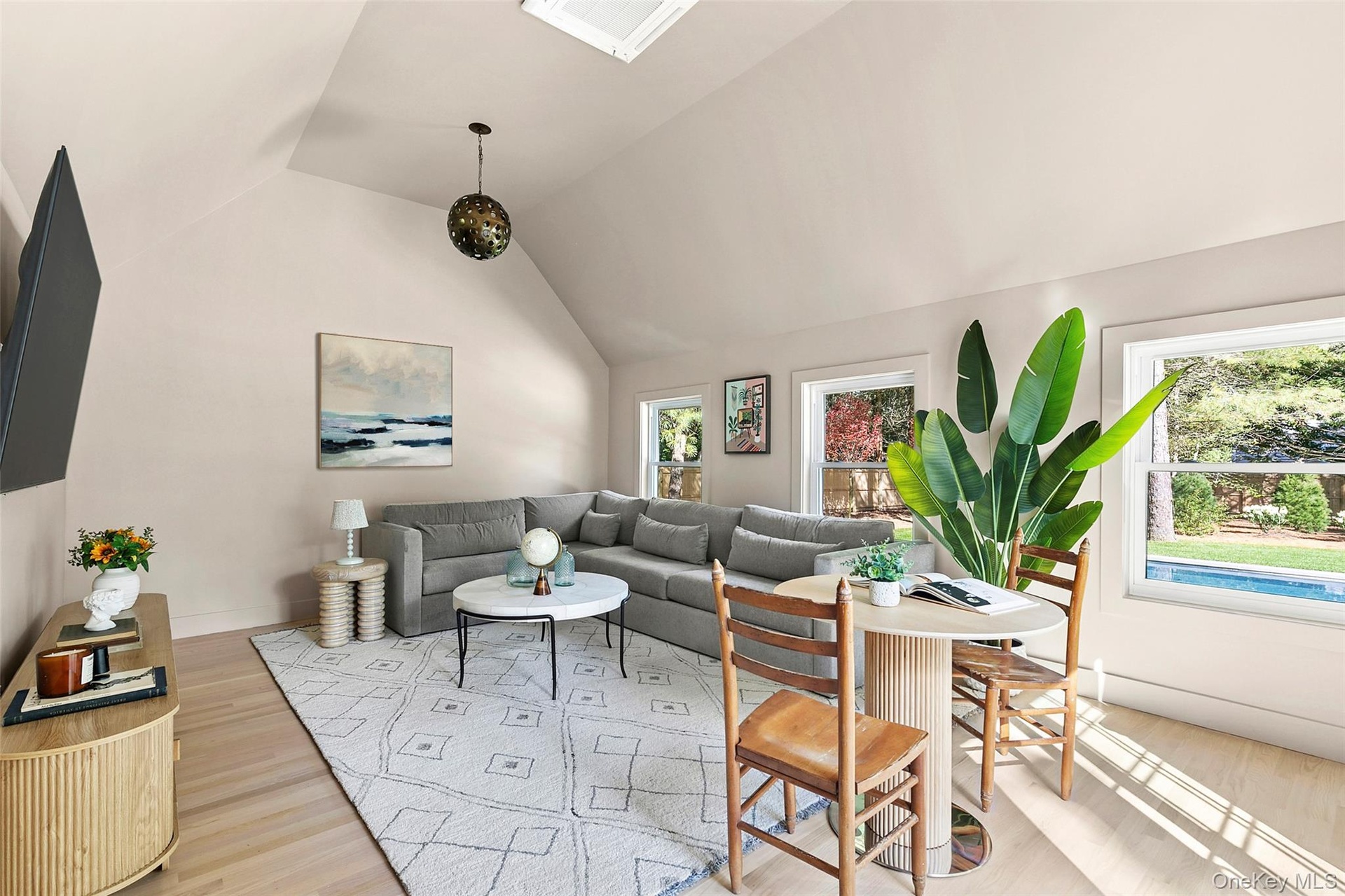Located on a quiet lane in Wainscott, close to ocean beaches, shopping, cafes, Barry's Bootcamp, and the Wainscott Hampton Jitney stop, 6 East Gate offers a turnkey retreat, fresh from a full gut renovation that leverages the charm of this triple-mint 1920 home. Attention to detail is an understatement in this exquisitely furnished 4-bedroom, 3-bath home set on 0.46 acres of meticulously landscaped grounds. Every aspect has been thoughtfully designed, with a comprehensive renovation and addition completed in 2025. Enter the circular driveway and step inside through the front door, which opens to a vaulted living room with adjacent kitchen and dining area. The space is anchored by a crisp white living room with details that highlight the integrity of the structure and complement the modern design aesthetic. The guest's eyes are drawn through the space by an axial view through double slider doors, to the new heated pool and stunning outdoor entertaining area with bluestone patio. Off the kitchen, there is a first floor bedroom/den layered with charming proportions and a richly detailed full bathroom. Connected by a solarium-like hall that faces the pool and the meticulously landscaped yard, is a spacious library/media room with a vaulted ceiling that makes a perfect gathering place for friends & family. Upstairs, is the primary suite, complete with a spacious walk-in closet and a spa-like bathroom featuring a double vanity and generously sized shower. In addition, there are two other bedrooms and a detailed full bathroom. Outdoors, the property is designed for entertaining and year-round enjoyment. The lush landscaping, specimen trees, and seasonal plantings ensure the property is as beautiful in spring and fall as it is in high summer. With low property taxes, refined finishes, and a premier Wainscott location close to both beaches and town centers, 6 East Gate Road represents the perfect blend of history, design, and effortless Hamptons living.