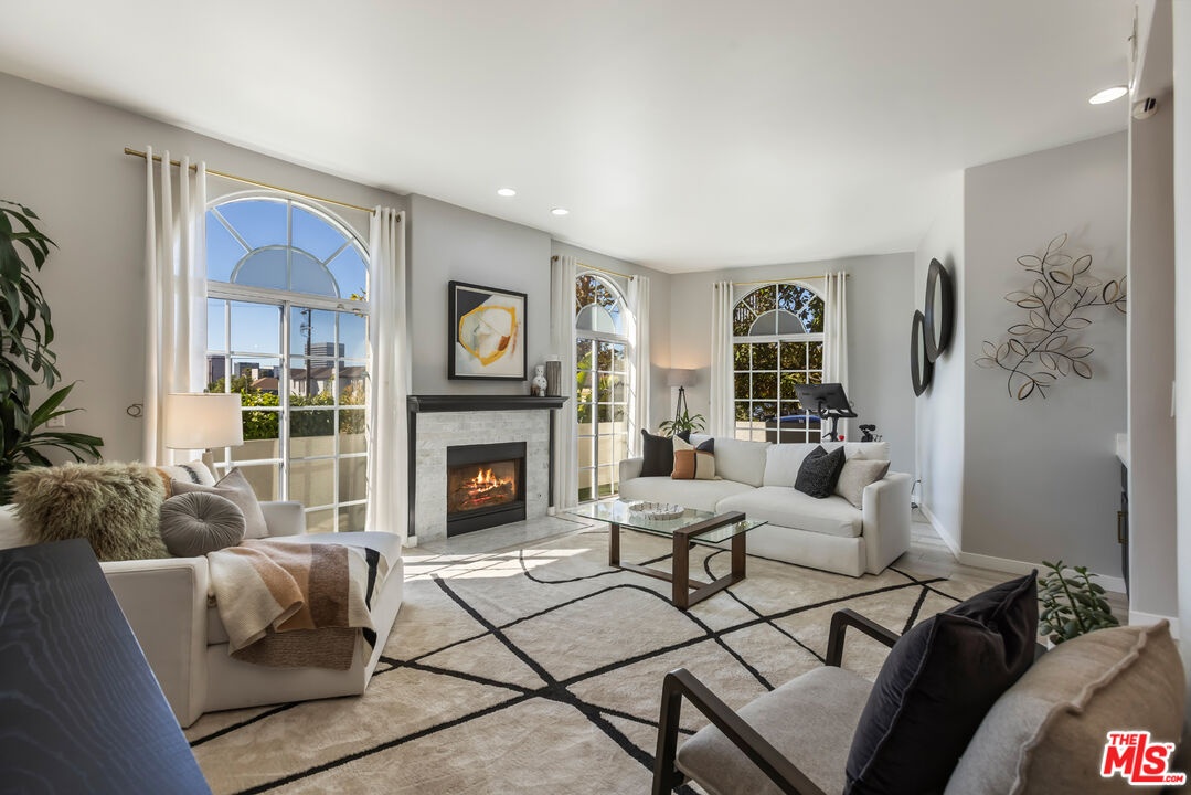 The one you have been waiting for. California casual sophistication defines this highly desired corner residence, showcasing gleaming plank flooring throughout, soaring ceilings, recessed lighting, and an abundance of natural light. Enter through the inviting foyer into the dedicated dining area, highlighted by an impressive tray ceiling and custom light fixture, which flows seamlessly into the expansive main living space. Here, an elegant marble fireplace with wood mantle, convenient wet bar with shelving, and dramatic floor-to-ceiling glass doors open to a collection of intimate balconies perfectly merging indoor and outdoor living. The well-appointed kitchen boasts considerable cabinetry, stainless steel appliances, and a wine refrigerator, while a chic powder room completes the main level. Upstairs, the serene primary suite offers a spacious bedroom, stylish closet, and dazzling ensuite bath with dual vanity, deep soaking tub, and separate shower. A comfortable sunlit second bedroom provides ample storage, while the third bedroom offers flexible potential as an office, den, or guest space. Both are serviced by a sizable hall bathroom with sleek vanity and tub-shower combination. A dedicated laundry room with full-size side-by-side washer and dryer, upper cabinetry, and additional hallway linen storage complete the second level. Perfectly situated near the Miracle Mile, LACMA, The Grove, Century City, Beverly Hills, and more, this residence places renowned dining, shopping, and entertainment right at your doorstep.